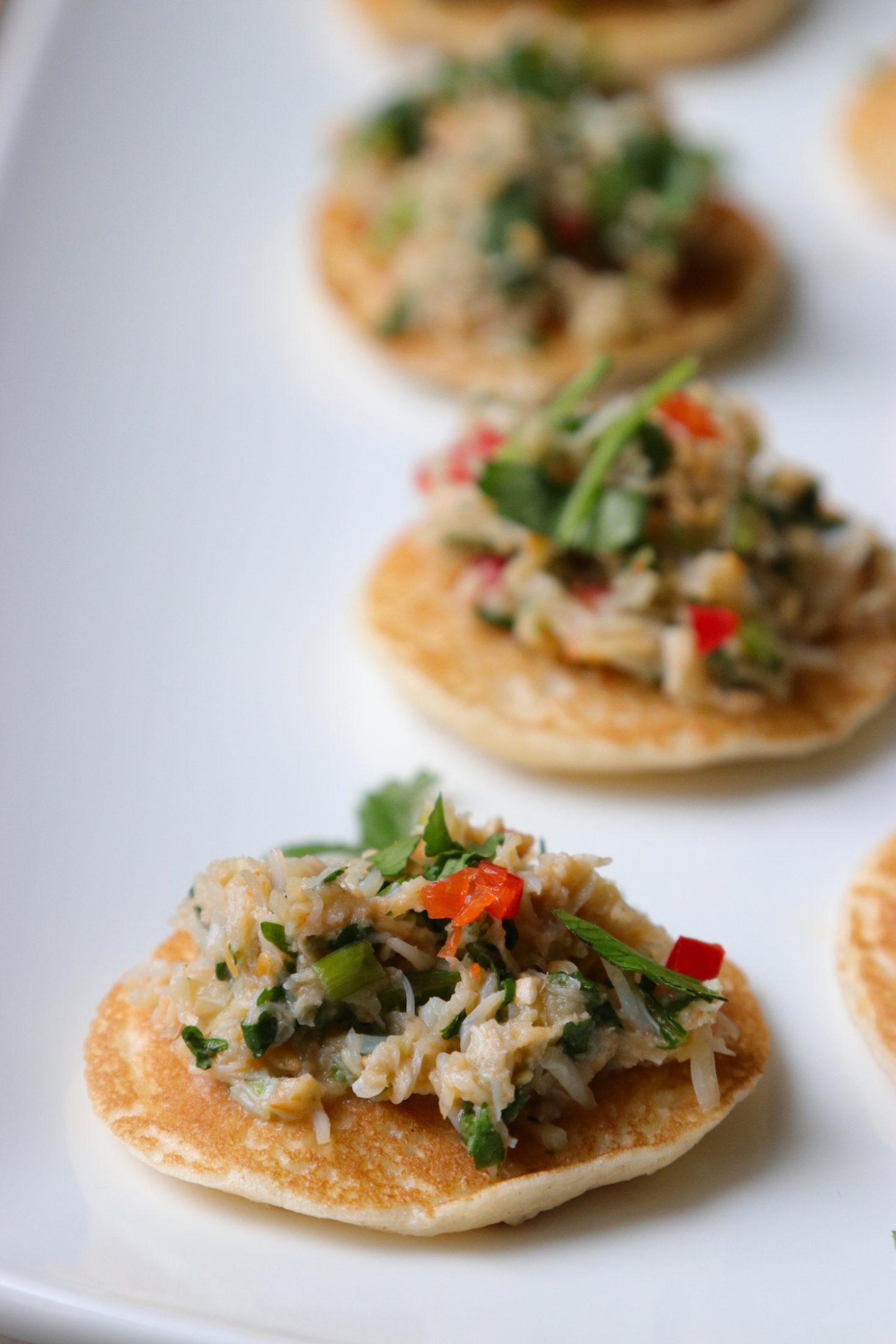 Recipe Notes | Fragrant Thai Crab Blinis | Canapé Recipe Inspiration Published: 28-10-2018 These fragrant thai crab blinis are the perfect combination of salty, spicy and zesty and are quick and easy to whip up, literally taking 5 minutes… Ingredients 1 batch of blinis (see recipe here) 200g of Fifty Fifty crab meat (this is white and brown crab meat but you could use all white for a cleaner and lighter taste) Fresh ginger around 5cm size, grated 1 tbsp sesame seeds, lightly toasted 1/2 red chilli, finely diced Handful of coriander, finely chopped Juice of one lime Salt & pepper Method Prepare and mix the ingredients together…. and well, that’s it … then spoon on top of each blini. Sometimes I’ve added a little chopped chive, or spring onion (scallion) to the mixture too for a little extra uumph. If you’re making this ahead of time, add the lime juice at the last second. And watch that you don’t let the sesame seeds burn as it only takes a second. Enjoy. Share this article Copy this link https://www.humphreymunson.co.uk/fragrant-thai-crab-blinis-canape-recipe-inspiration/ Share Copy link Previous Article Heckfield Place Next Article Recipe Notes | Smoked Mackerel & Horseradish Blinis | Canapé Recipe Inspiration