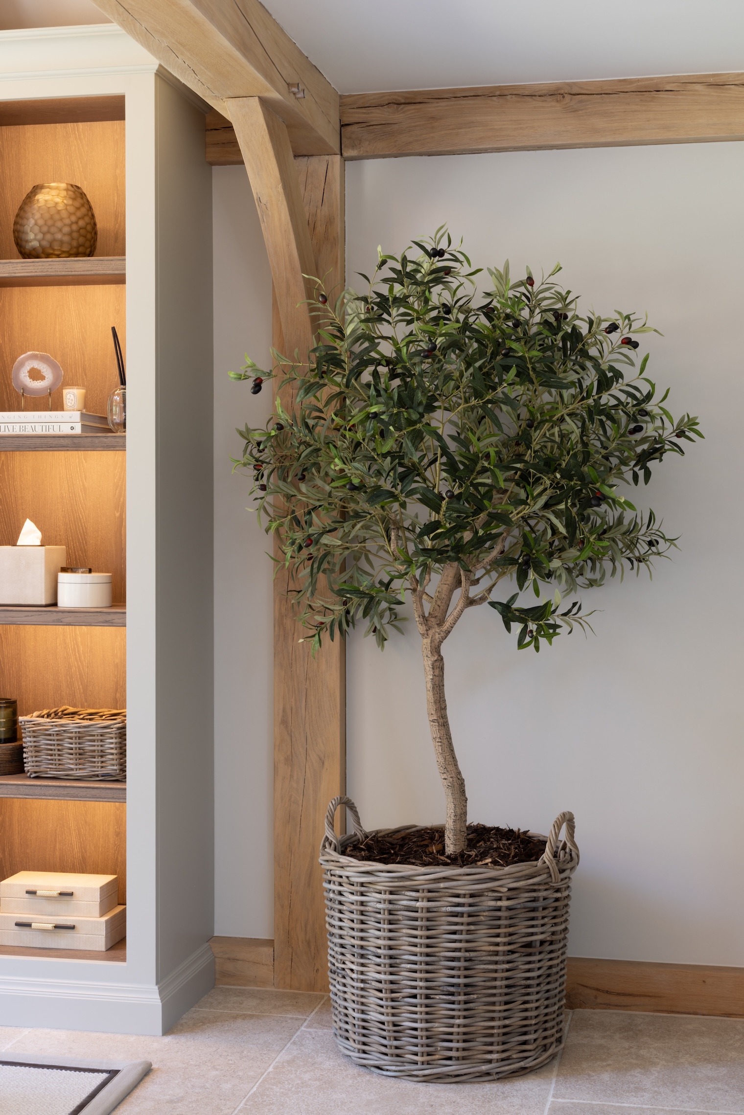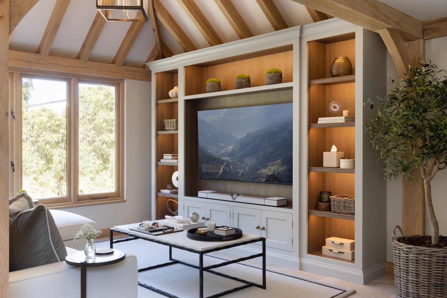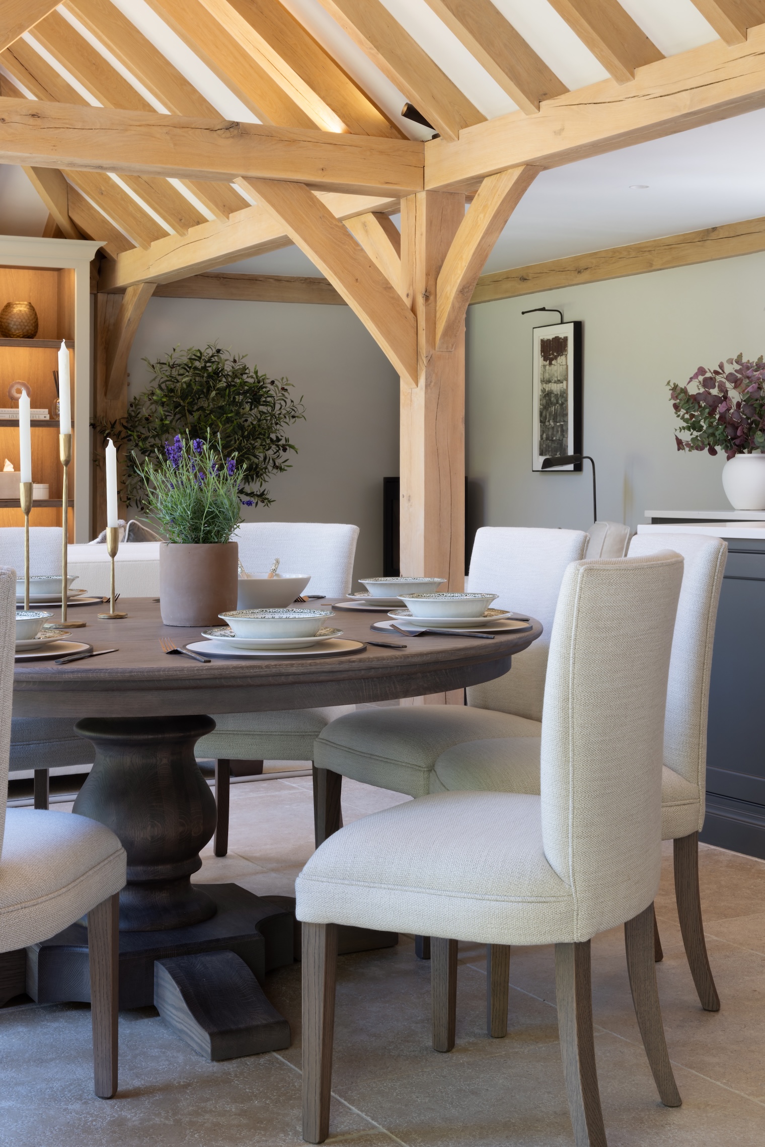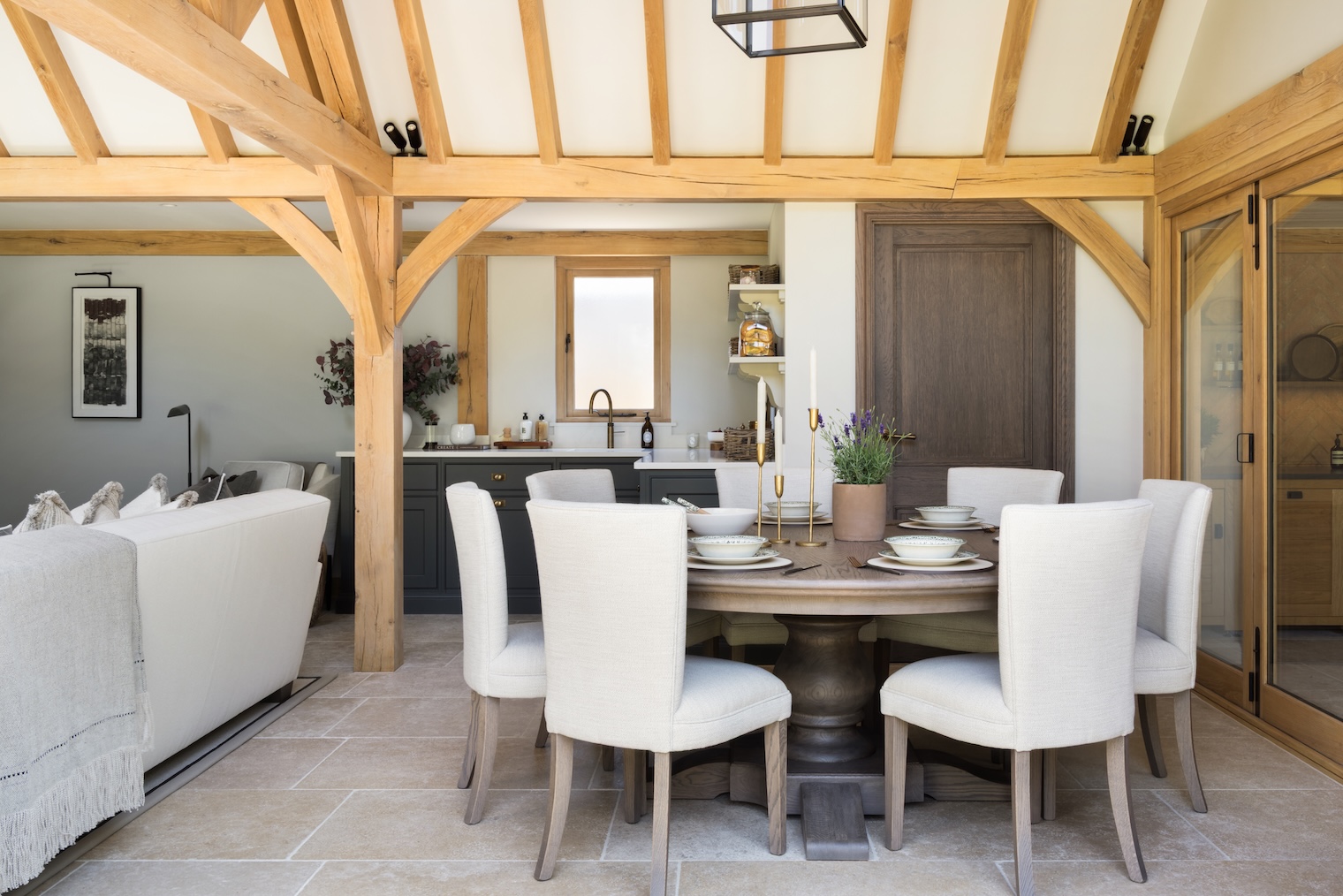 ALL THE Interior Design Details yOU NEED TO KNOW Published: 04-07-2025 The interior of the Hampshire Beach House project was carefully guided by the HM team, from the larger elements such as the Kingcome sofa to the finer details like the Fromental wallpaper in the bathroom. At HM we’re proud to have an amazingly dedicated and talented team who can assist you through your entire design process as much or as little as you’d like. Whether it’s curating the entire room or simply helping you choose the correct fabric for your dining chairs. No matter the scale of your project, our team is always happy to lend a hand and bring your vision to life. The Hampshire Beach House project was built within a truly exceptional oak barn, designed manufactured and installed by Prime Oak, a family run business who create completely bespoke designs completely tailored to their clients specifications. The barn features an outdoor kitchen, kitchenette, dining room, soft seating area and bathroom, creating the ultimate indoor/outdoor entertaining space. PREP Kitchen > dining space > soft seating > bathroom > For this special notebook feature we thought it would be beneficial to separate the space room by room and explore the details of each zone that was carefully curated by the HM team in collaboration with the clients. pREP Kitchen The prep kitchen is the perfect place for little odd jobs such as washing up dishes or preparing salads, to take the pressure off the main outdoor kitchen. The Nickleby cabinetry is finished in ‘Soot’, with mid antique brass waxed Quilp handles. We specified artisan shelving above (finished in ‘Mainsail’) so the space didn’t feel too dense and heavy without compromising on storage space. Dining space The round Langham dining table is finished in Berkeley oak with 6 Havisham dining chairs upholstered in Perennials ‘Whippersnapper – Chalk’. The dining area provides the perfect space to sit inside, perhaps to enjoy the shade, while still enjoying the outside, especially with both sets of bifold doors open. The table is laid with Burleigh’s ‘Regal Peacock’ in Green. Soft Seating The soft seating area features media cabinetry by HM finished in ‘Mainsail’ with a Berkeley oak interior, the sofa is the Manhattan chaise sofa by Kingcome paired with a Porta Romana Giacometti Coffee Table and Clasp side tables from Loom. The space is perfect for settling into an old movie after a delicious BBQ or watching sports with friends. The Crucial trading rug cleverly zones the space and provides a cosier atmosphere for more relaxed moments. Bathroom The bathroom was heavily influenced by a Sophie Patterson design, featuring our Constantine I vanity unit finished in Berkeley oak with a bespoke Calacatta Viola Monet marble top with bullnose edge detail and pip handles in mix antique brass waxed. The bespoke Butt & Bead panelling is finished in HM ‘Lock & Load’ which pairs beautifully with the statement Fromental ‘Oak Leaf’ wallpaper. The door is our HM Oxford door, finished in Berkeley oak with Samuel Heath hardware. The Heathfield & Co ‘Thea’ Wall Lights sit on either side of a Porta Romana Trevose mirror. If you have an outdoor kitchen project in mind, send us your project details here. Images: Paul Craig Share this article Copy this link https://www.humphreymunson.co.uk/all-the-interior-design-details-you-need-to-know/ Share Copy link Previous Article Alfa Forni – An Iconic Italian Experience Next Article The Original Neapolitan Pizza