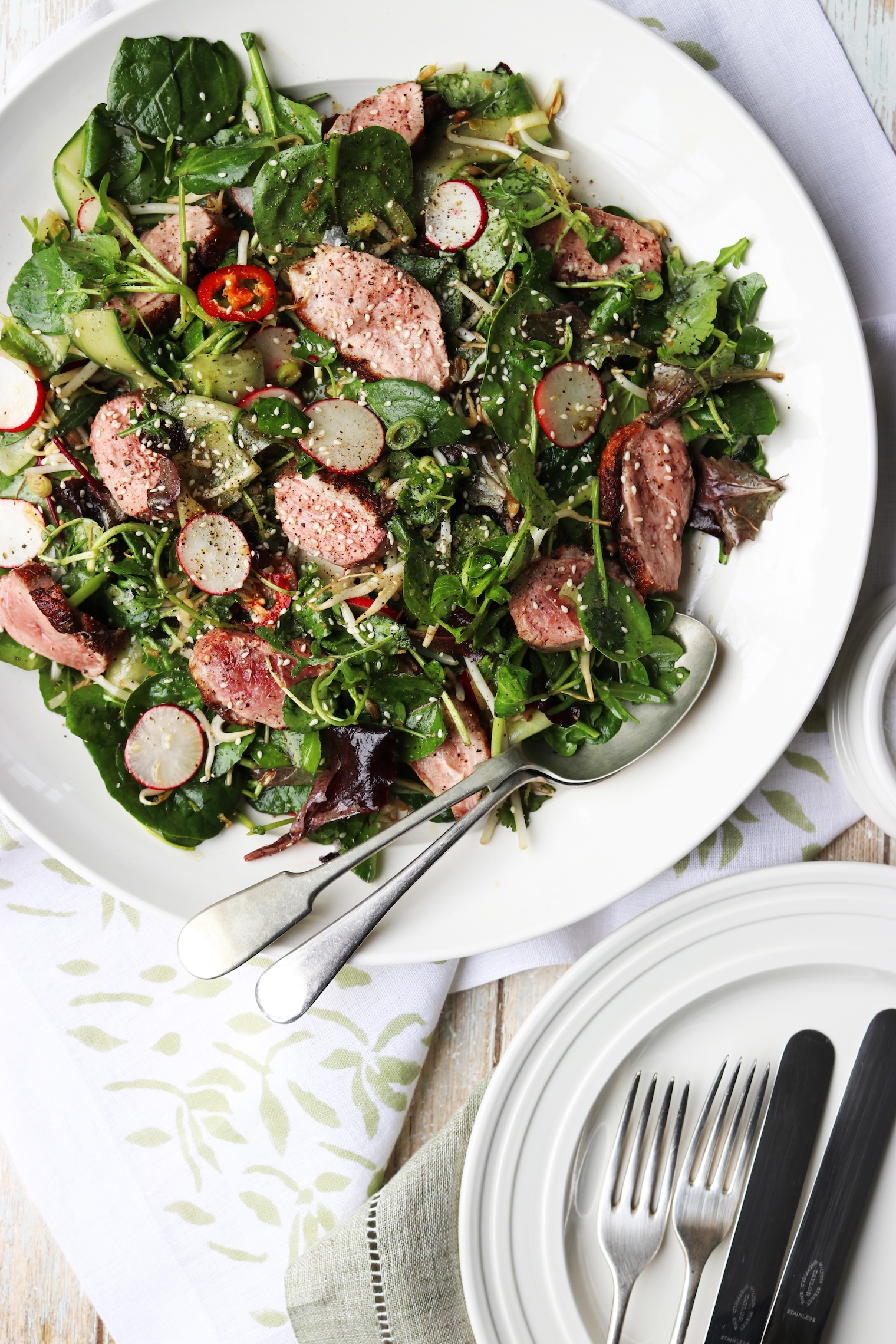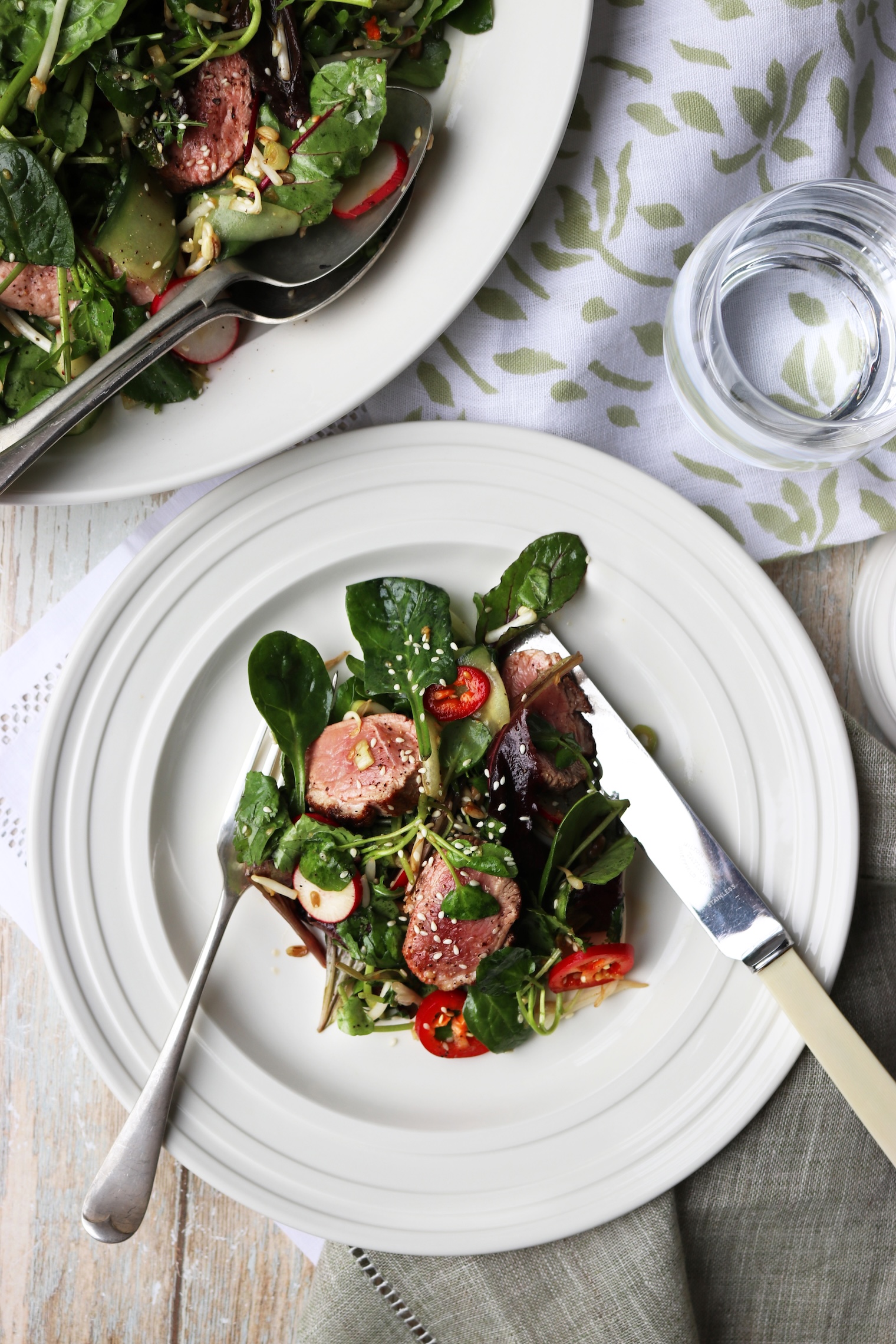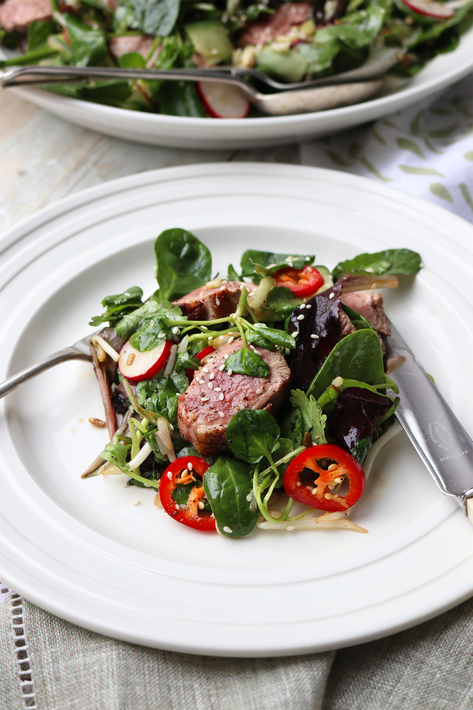 Asian Inspired Duck Salad Published: 25-01-2026 Succulent duck and vibrant asian flavours come together to create this really delicious yet easy-to-prepare salad. Perfect for simple lunches and relaxed dinners alike. Ingredients For the salad 2 duck breasts 1tsp Chinese five spice Salt & pepper 8 radishes, sliced into thin rounds 1/2 a cucumber, ribboned 2 handfuls of mixed salad leaves 2 handfuls of watercress 2 handfuls of bean sprouts 1 small handful of coriander leaves 10g of sesame seeds 1 red chilli, sliced 3 spring onions, sliced finely For the dressing 2 tbsp hoisin sauce 1 tsp peeled and grated ginger 1 tbsp sesame oil 1 tbsp rice wine vinegar Juice of 1/2 a lime METHOD Begin by preheating your oven to 180 °C. Then with a sharp knife, score the skin of the duck in a diamond pattern and rub in the Chinese five-spice. Then season both sides with salt and pepper. Next, place the duck breasts, skin-side down in an ovenproof frying pan and cook over a medium-high heat for 7 minutes or until the skin is golden and crisp. Turn the duck breasts over and place them into the preheated oven for a further 3.-4 minutes. After this, remove from the pan and leave to rest. While the duck rests, you can prepare the salad. Place all the ingredients into a bowl and mix well. For the dressing, add all the ingredients to a small bowl and whisk until well combined. Now add the dressing to the salad and toss until everything is nicely coated. Thinly slice the duck breasts, add these to the salad and enjoy! Images by HM Crockery – John Julian Linens – Gayle Warwick Share this article Copy this link https://www.humphreymunson.co.uk/asian-inspired-duck-salad/ Share Copy link Previous Article Your Next Winter Escape Next Article How to give your kitchen a January refresh