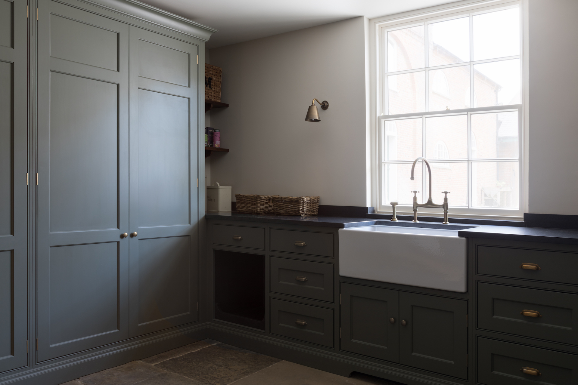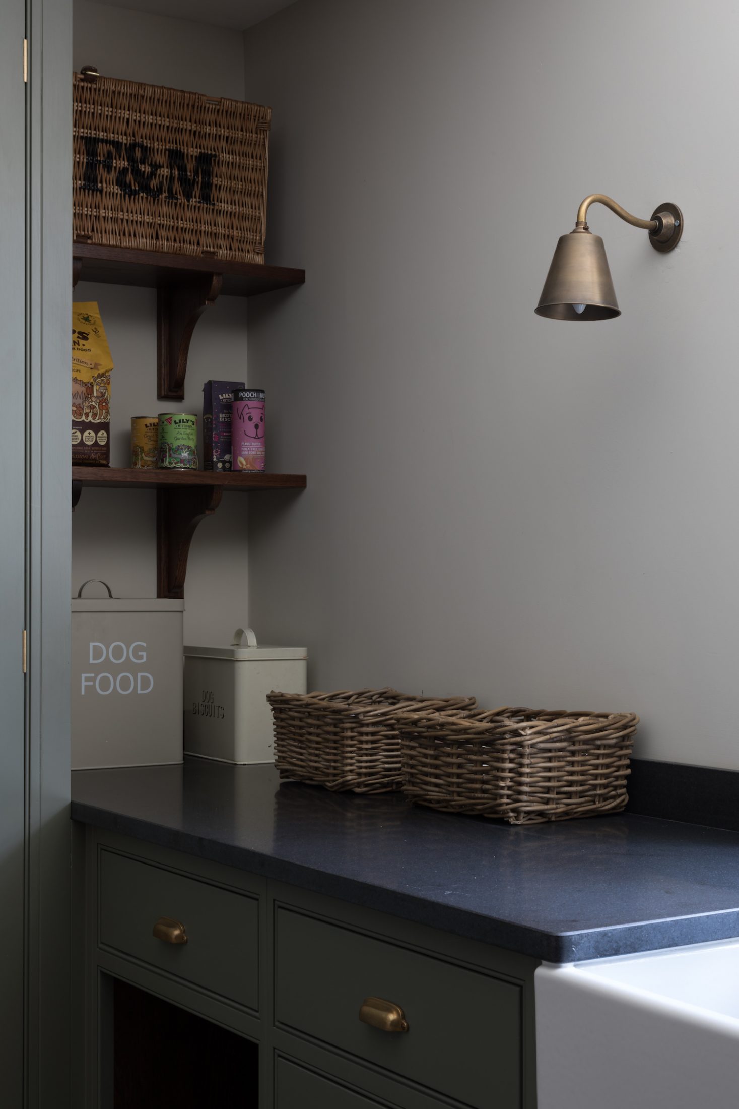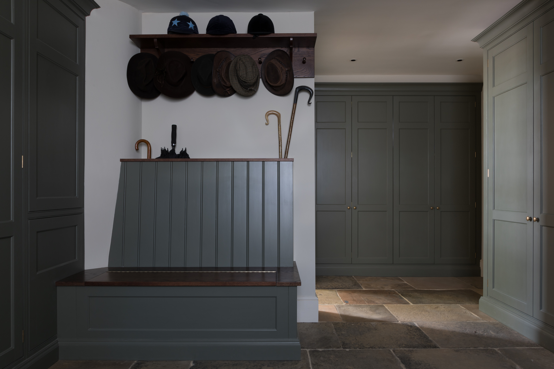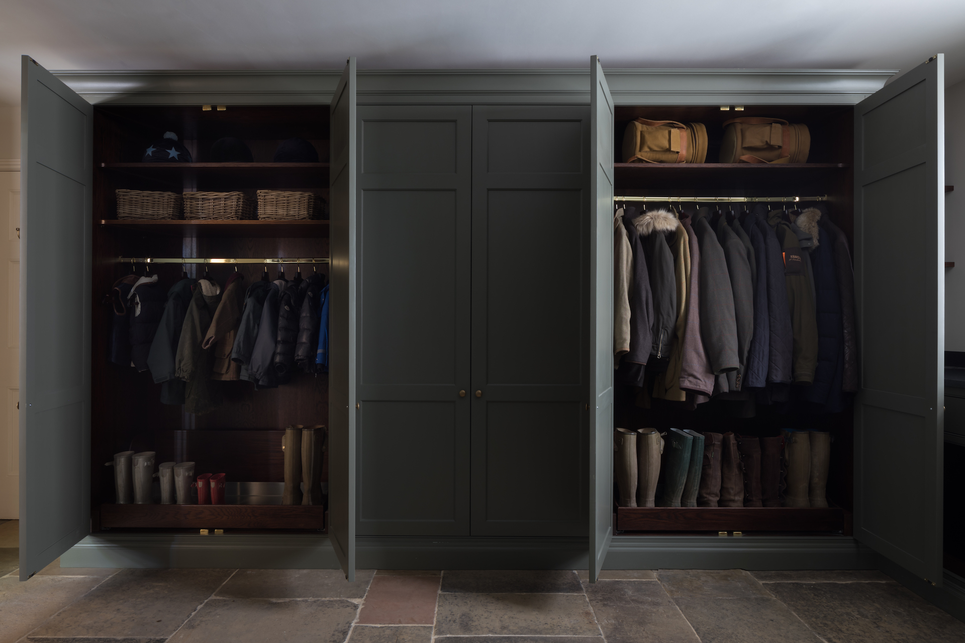 Boot Room Confidential | Cotswolds Country House Project Published: 28-12-2018 A classic English boot room through and through, this room is dark and a little moody which we think suits the space down to the ground. The busy family who live in this country house in the Cotswolds absolutely love the outdoors so they spend a lot of time riding, shooting, hunting and walking the dogs. It was therefore essential to create a hardworking boot room that was not just functional but that suited the family’s lifestyle and was in keeping with the heritage of the house. As lovers of the outdoors one side of this boot room is dedicated to tall Nickleby cupboards providing closed storage for coats and jackets with pull out drawers below for shoe and boot storage. One side is for the adults and one side for the children. You may notice that the children’s coat rack is much lower – this bespoke design enables children to take a coat from the rack with ease and they each have a basket above for gloves. The pull out drawers at the base of each ensure finding your favourite pair of wellies or riding boots are easy to find and not jumbled up in a heap at the bottom of the cupboard. Following on from the coat storage is the sink run which is positioned centrally underneath the sash window that looks out over a courtyard. An extra large Shaws sink sits directly beneath and is perfect for washing down dogs and muddy boots after a long walk. The sink has a Perrin & Rowe Ionian tap with rinse all finished in aged brass to match the Granger handles and Bardell knobs used on the Nickleby cabinetry. Plenty of countertop space is great for sorting through sports kits and getting everything ready before a big day outdoors. Beneath the counter top at either end of the sink run are integrated open dog beds that provide a cosy spot for the dogs to curl up in after a long day out beating or shooting. To make use of all available space and to keep the sink run countertop free of unwanted clutter, there are two recessed artisan shelves which are used to store dog food and treats, it also makes a handy place to store a hamper. Bench seating with an integrated umbrella rack was top of the wish list for this bespoke boot room, and and also has an artisan shelf and peg hooks above which have been finished in HM’s bespoke Ludgate oak. This works so well with the colour used throughout this room which is called Lock & Load and is produced exclusively by Mylands for Humphrey Munson. The bench seating also has lift up storage for additional shoes and bags and is the ideal spot to sit and put on boots before heading out for a walk. Behind the bench seating in an integrated umbrella rack to keep them neat, tidy and importantly always in the same place. Another integral part of this hardworking boot room is the plant room which is completely concealed behind the tall Nickleby doors in the image above. Housing all the necessary equipment in cabinetry and out of sight helps to keep the room looking calm, but everything behind can quickly and easily be accessed when needed. The Nickleby cabinetry in this boot room has been finished in HM’s own paint colour Lock and Load which compliments the Ludgate oak accent wood perfectly. Aged brass Granger pull handles, Bardell knobs, taps and lighting helps to tie the space together to create a really calm classic feeling space. The wall lights are by Jim Lawrence and the flooring is actually the original flagstones. Image credit – Paul Craig. Share this article Copy this link https://www.humphreymunson.co.uk/boot-room-confidential-cotswolds-country-house-project/ Share Copy link Previous Article Utility Room Confidential | Cotswolds Country House Project Next Article How to design a kitchen extension | Westbury Garden Rooms