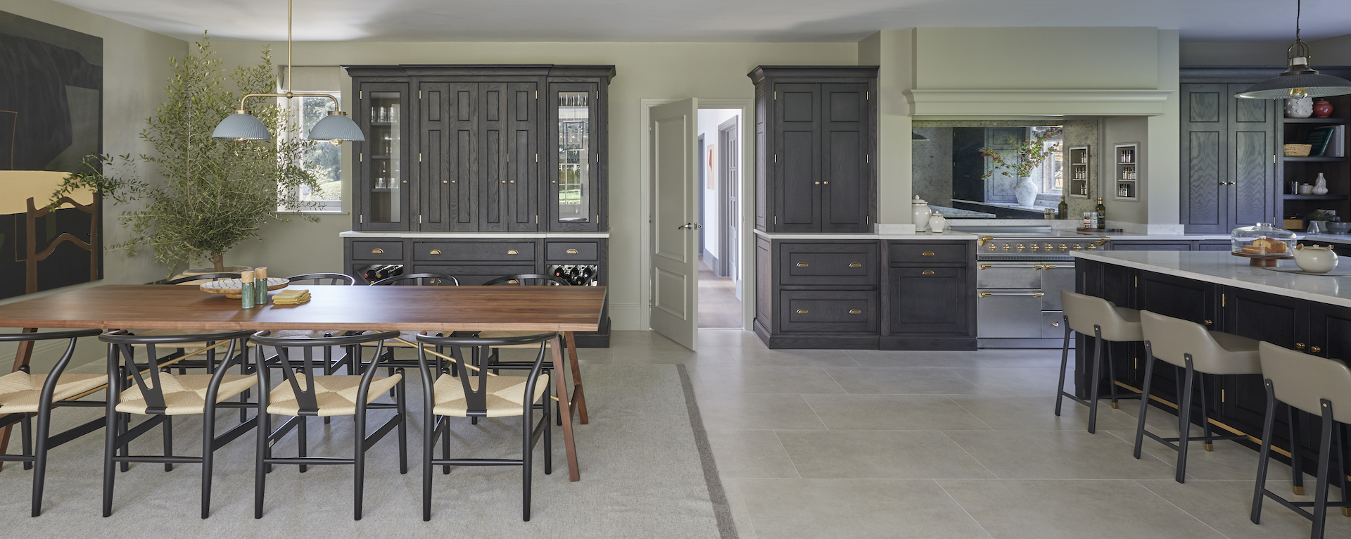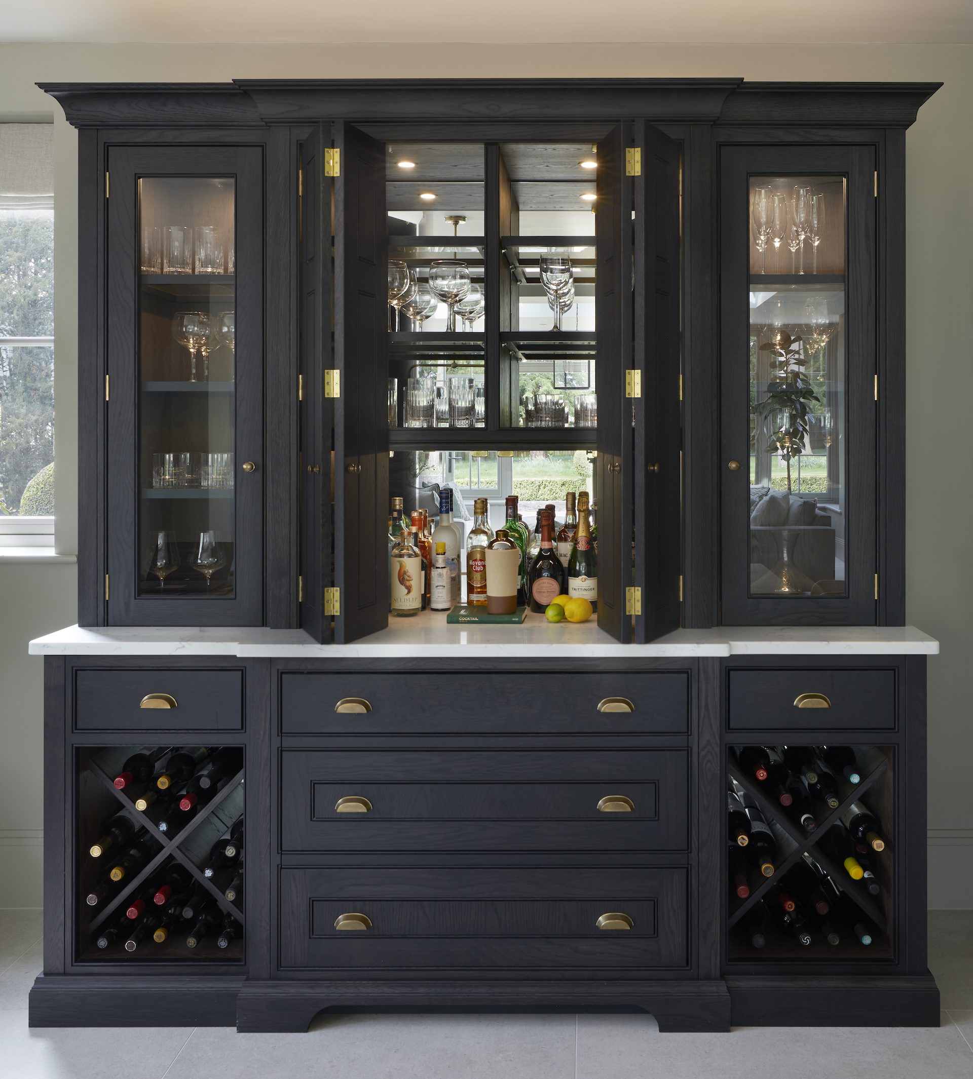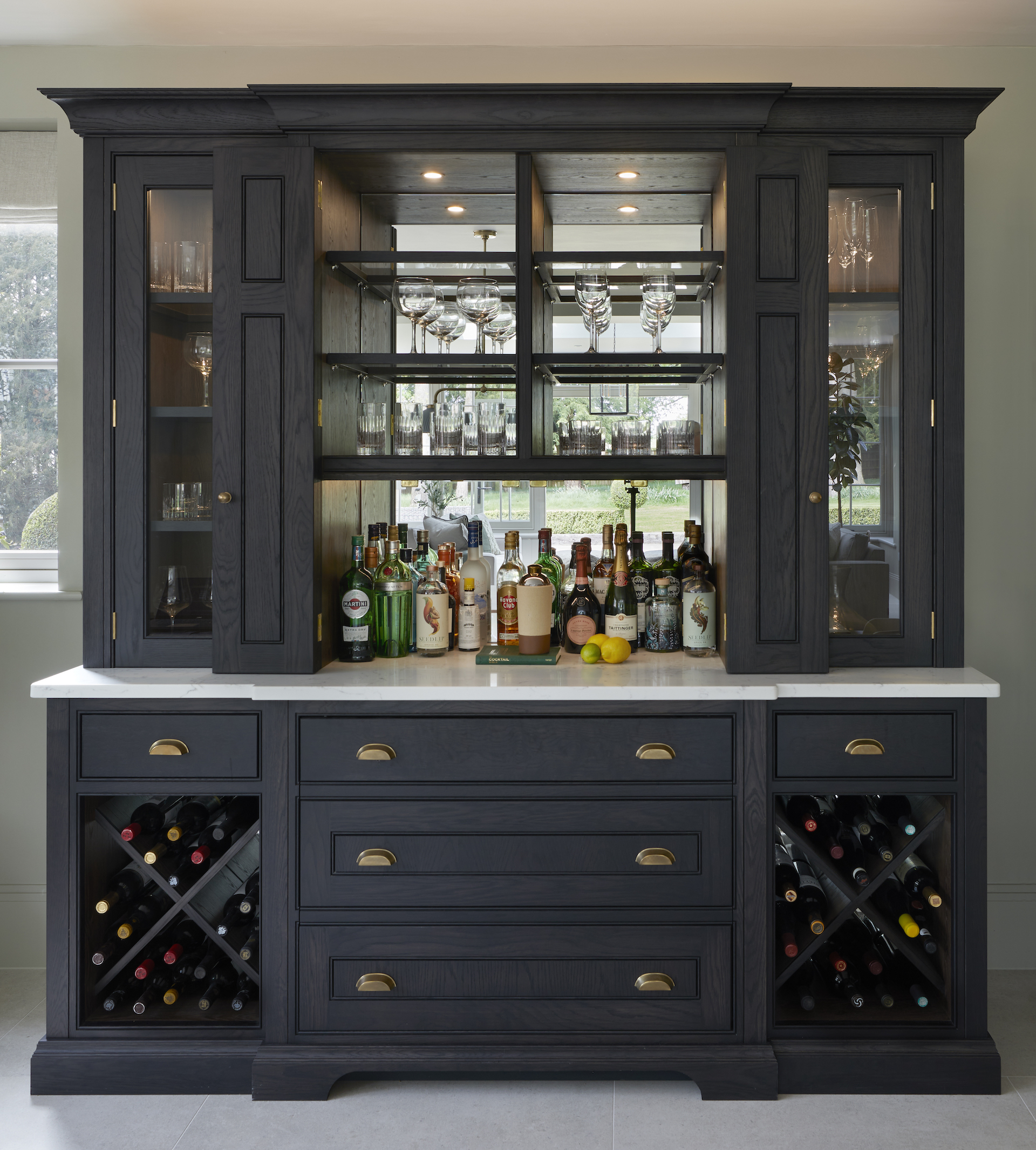 Cherie Lee | Modern country living Published: 28-08-2022 Cherie Lee has developed and perfected the art of bringing a truly contemporary look and feel to country houses across the UK and this incredible project in Hertfordshire is not different. Captured by photographer Ray Main, we are delighted to share the images here on the HM blog… Humphrey Munson designed, manufactured and installed the kitchen, utility room and bar cabinetry. All areas have Spenlow cabinetry finished in Greenwich oak – a bespoke black oak finish exclusive to Humphrey Munson. The hardware (Pip knobs and Rudge handles) are finished in mid antique brass waxed. The Lacanche range cooker is positioned within a false chimney that provides a focal point to the room and allows the countertop cupboards to fit snugly into each side with an additional open shelving section closest to the window to balance the design and create symmetry in the main run. Using the same cabinetry design and finish for the bar cabinetry ensures consistency across the room with the same height and scale / proportion of cabinetry. The beautiful extension was designed, manufactured and installed by Westbury Garden Rooms. It is a triumph of space and light bringing a true rhythm to the design. Capturing the client’s style perfectly, Cherie and her team have designed the space to feel relaxing and welcoming with a cool, contemporary feel underpinning the rooms. Just one quick look at the home bar in more detail… The central section is closed away when not in use, but when needed opens up to provide countertop space for preparing drinks. One of the most fun aspects of this design is the concealed Fisher & Paykel CoolDrawer which opens up below to provide access to mixers, beer, wine and champagne. The classic X-frame open storage provides additional storage for red wine either side. To see more of Cherie Lee’s projects please visit her website here. Share this article Copy this link https://www.humphreymunson.co.uk/cherie-lee-modern-country-house/ Share Copy link Previous Article At Home With Holly Donoghue Next Article Gaggenau Rotisserie | Crispy golden chicken