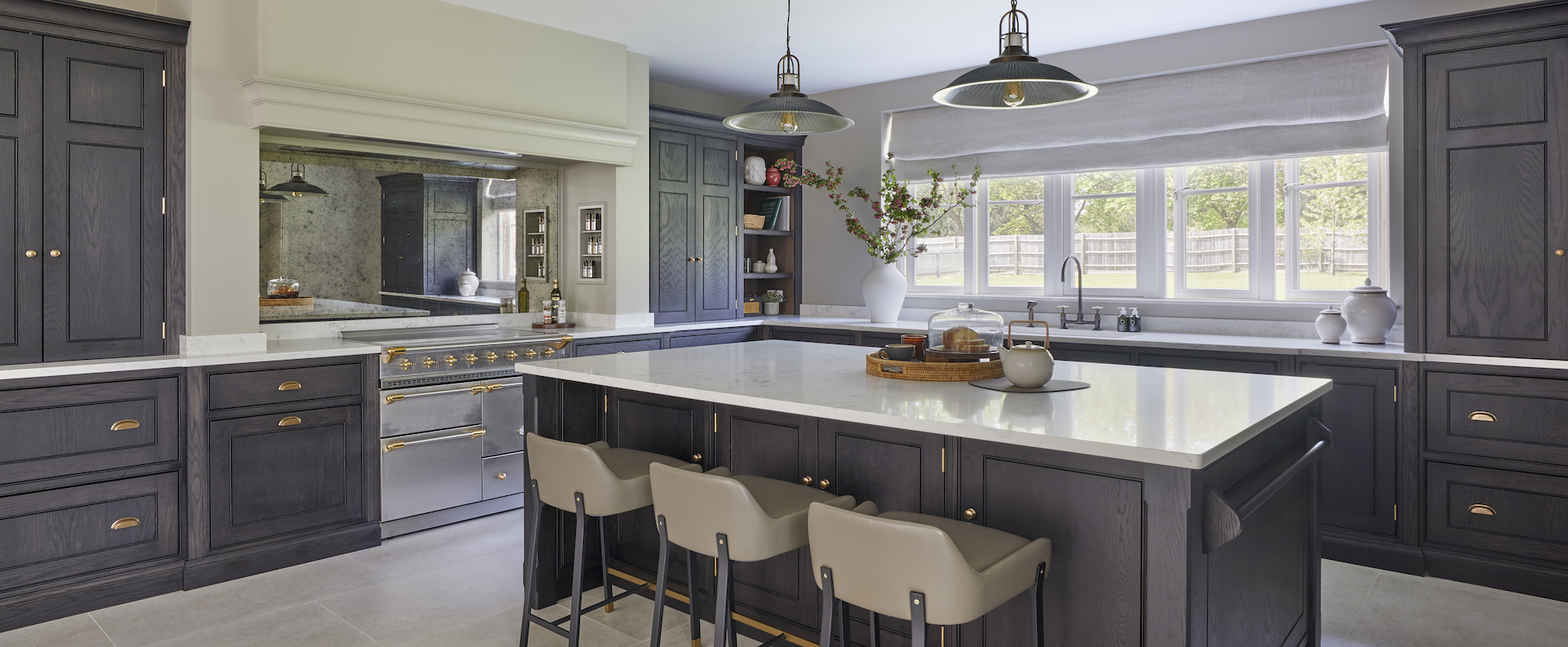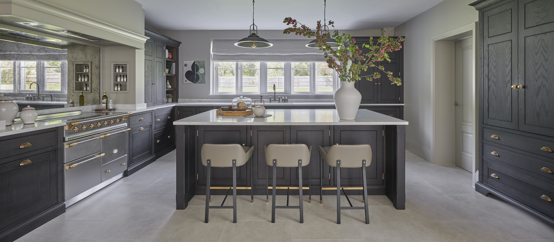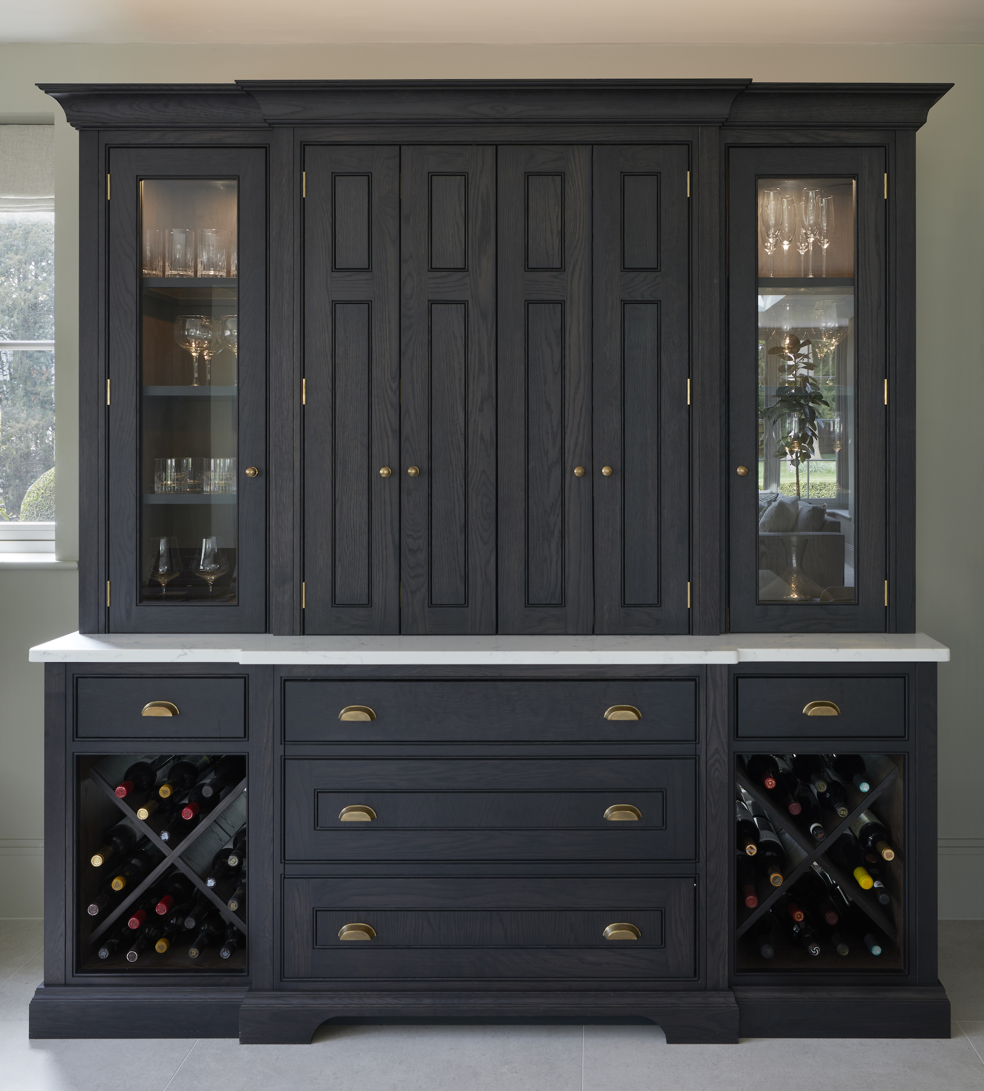Cherie Lee | Modern country living Published: 28-08-2022 Cherie Lee has developed and perfected the art of bringing a truly contemporary look and feel to country houses across the UK and this incredible project in Hertfordshire is not different. Captured by photographer Ray Main, we are delighted to share the images here on the HM blog… Humphrey Munson designed, manufactured and installed the kitchen, utility room and bar cabinetry. All areas have Spenlow cabinetry finished in Greenwich oak – a bespoke black oak finish exclusive to Humphrey Munson. The hardware (Pip knobs and Rudge handles) are finished in mid antique brass waxed. The Lacanche range cooker is positioned within a false chimney that provides a focal point to the room and allows the countertop cupboards to fit snugly into each side with an additional open shelving section closest to the window to balance the design and create symmetry in the main run. Using the same cabinetry design and finish for the bar cabinetry ensures consistency across the room with the same height and scale / proportion of cabinetry. The beautiful extension was designed, manufactured and installed by Westbury Garden Rooms. It is a triumph of space and light bringing a true rhythm to the design. Capturing the client’s style perfectly, Cherie and her team have designed the space to feel relaxing and welcoming with a cool, contemporary feel underpinning the rooms. Just one quick look at the home bar in more detail… The central section is closed away when not in use, but when needed opens up to provide countertop space for preparing drinks. One of the most fun aspects of this design is the concealed Fisher & Paykel CoolDrawer which opens up below to provide access to mixers, beer, wine and champagne. The classic X-frame open storage provides additional storage for red wine either side. To see more of Cherie Lee’s projects please visit her website here. Share this article Copy this link https://www.humphreymunson.co.uk/cherie-lee-modern-country-house/ Share Copy link Previous Article At Home With Holly Donoghue Next Article Gaggenau Rotisserie | Crispy golden chicken