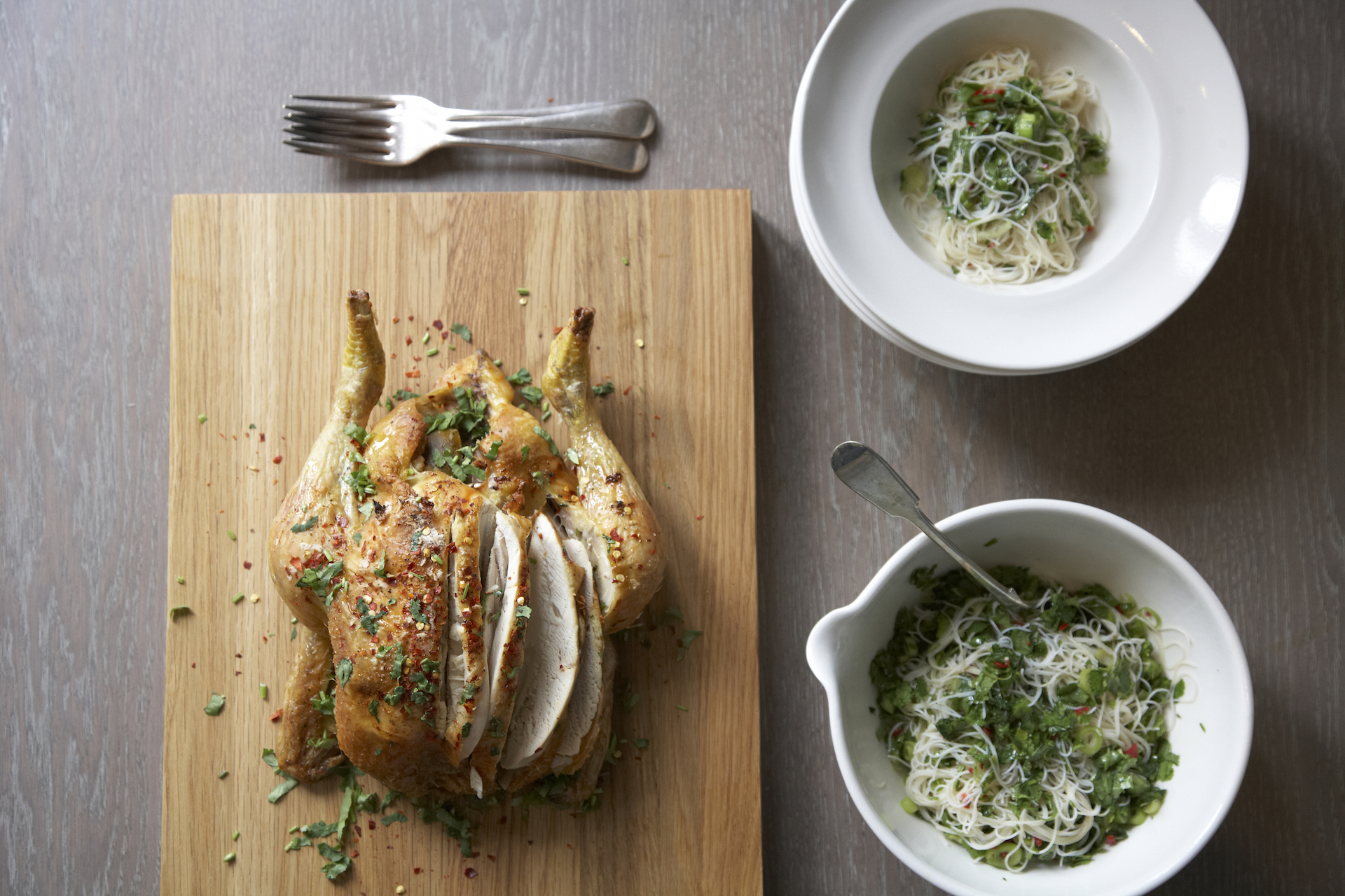 Chilli, Garlic and Ginger Chicken Noodles Published: 30-07-2017 This is such a great summer recipe – fresh, delicious and light which makes it perfect for lunch or a light supper. We cooked the chicken in the Miele main oven a fan setting at 180C with 3 bursts of steam. The moisture plus function on the Miele main oven means perfect roasting results can be achieved with moisture through the combination of different operating modes. The bursts of steam in Moisture plus mode can also be programmed for greater convenience. Ingredients 1 organic chicken 1 tbsp red chilli flakes 4 cloves of garlic, peeled and crushed 1 lime, quartered 1 piece of ginger, peeled and grated Sea salt and freshly ground pepper 150g cellophane/rice noodles 1 large red chilli 1/3 cup chopped roasted peanuts 1 1/2 cups fresh coriander, chopped 1 1/2 cups fresh basil, chopped 1 1/2 cups fresh mint, chopped 3 spring onions (green or purple) 3 tbsp lime juice 3 tbsp fish sauce 2 tbsp brown sugar method Pre-head the oven to 180C on a fan setting. Rub the chicken with the garlic and ginger with excess placed in the cavity along with the lime. Sprinkle red chilli flakes, salt and pepper over the chicken and place in the oven. Meanwhile, place the noodles in a bowl, cover with boiling water and allow to stand for 2 minutes – alternatively, follow the instructions on the packet. Drain the noodles and toss with the chlli, peanuts, coriander, basil, mint and spring onions. Mix the lime juice, fish sauce and brown sugar in a jug and then pour over the noodles. Cover with cling film until the chicken has roasted and is ready to serve. Images: HM Share this article Copy this link https://www.humphreymunson.co.uk/chilli-garlic-ginger-roast-chicken-noodle-salad/ Share Copy link Previous Article Sub-Zero French Door Over-And-Under Refrigerator / Freezer Next Article Chicken Mulligatawny Soup