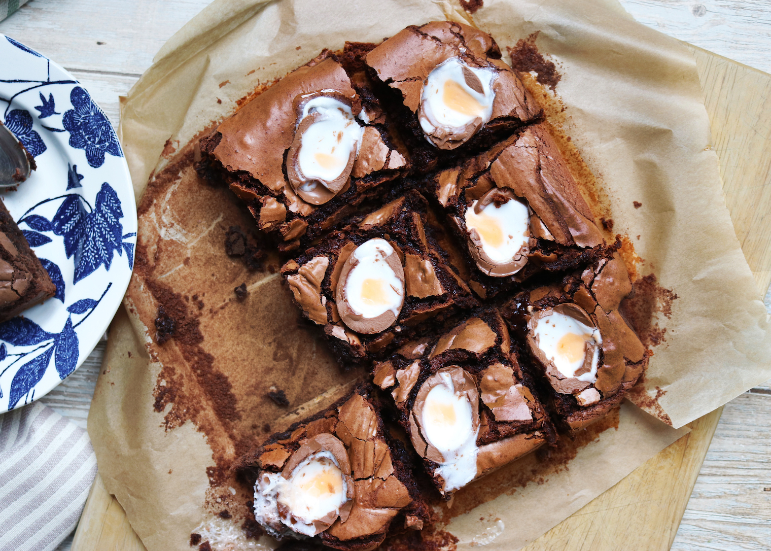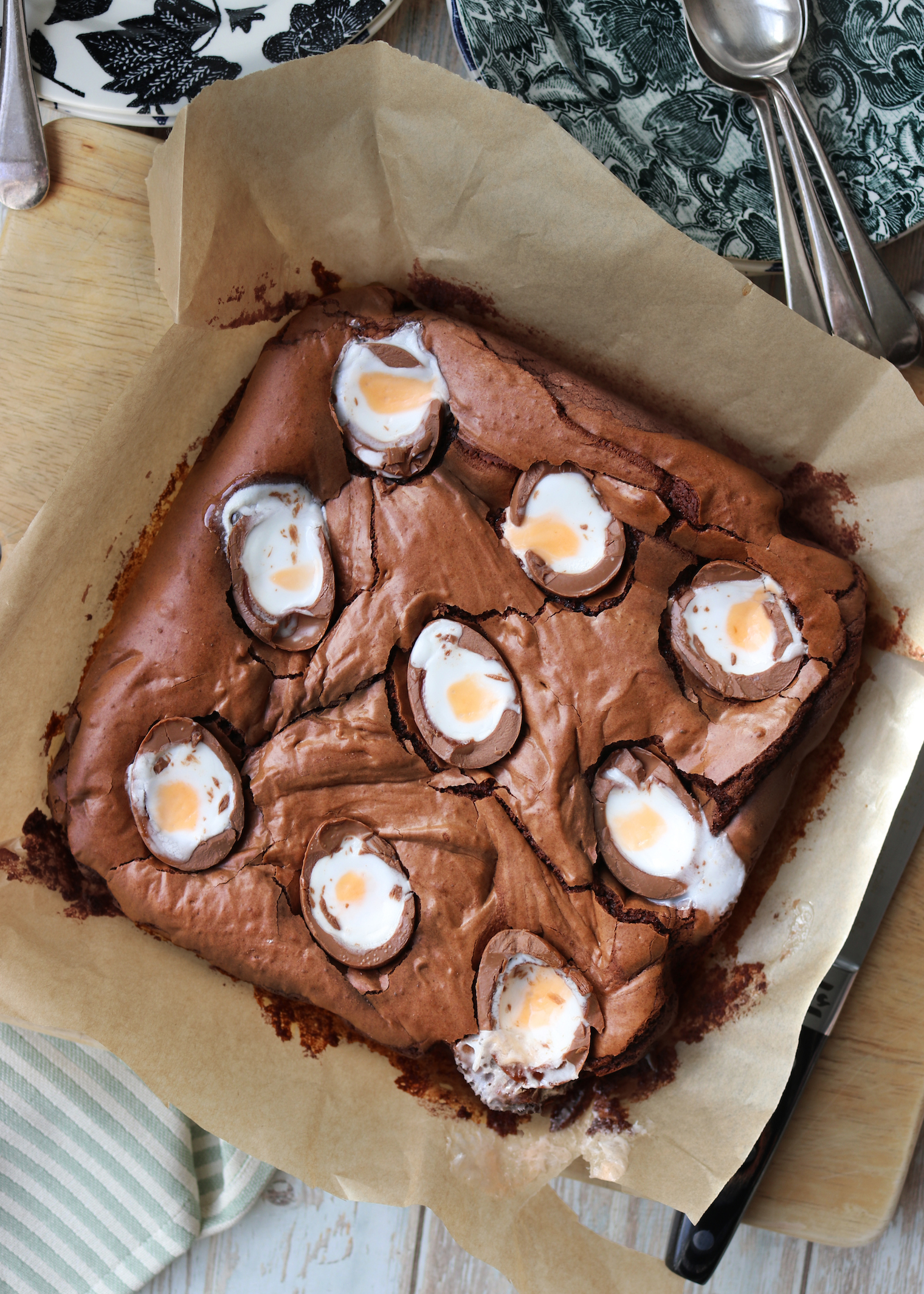 Creme Egg Chocolate Brownie Published: 02-04-2023 This is a foolproof brownie recipe that takes hardly any time to put together and always comes out perfectly. We’ve added creme eggs to celebrate the Easter holidays. Ingredients 100g butter at room temperature 250g golden caster sugar 200g dark chocolate, broken up in pieces 4 eggs 100g plain flour, sifted 1 tsp baking powder 30g cocoa 5 crème eggs Method Pre-heat the oven to 180C fan or 160C static. Next, line a square brownie tin with baking parchment (ours is around 20cm x 20cm in size). Boil a pan of water about a third full, and once boiled reduce to a simmer and place a bowl above with the butter and chocolate in it. Let this melt gently and then take off the heat to cool to room temperature. While this is cooling, you can whisk the eggs and sugar together until the mixture is well combined. When the chocolate mixture has cooled down, fold it into the sugar and eggs and then combine. Next stir in the flour, baking powder and cocoa and combine well. Add to the tin, then bake for 15 minutes. While this is baking slice the crème eggs in half and then remove the brownies from the oven and press into the tin in rows of three. You’ll have a ½ egg left – they call this the baker’s treat! Bake for another 10-15 minutes or until the top is cracked but the middle is only just set. Cool completely then cut into squares and serve. Images: HM Share this article Copy this link https://www.humphreymunson.co.uk/creme-egg-chocolate-brownie/ Share Copy link Previous Article Q&A with Organise-d | How to organise your home Next Article Design Notes | The Butler’s Kitchen