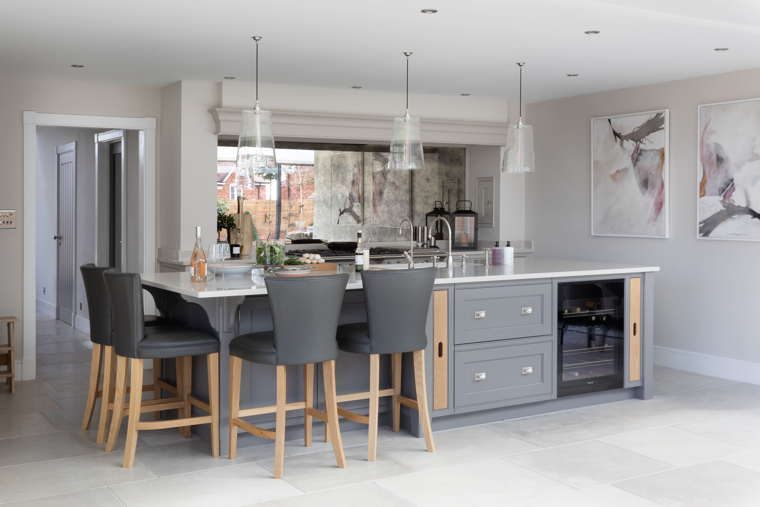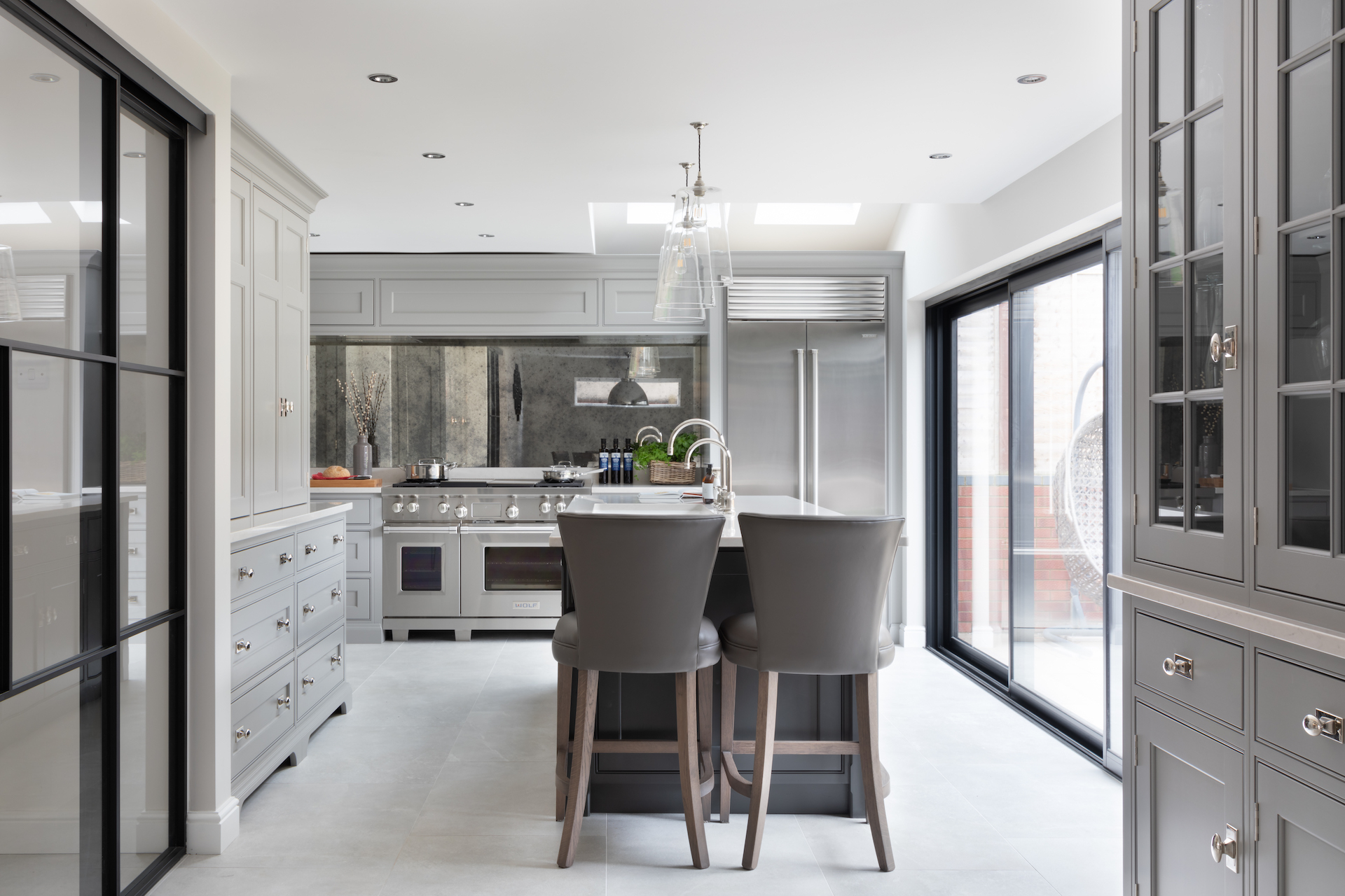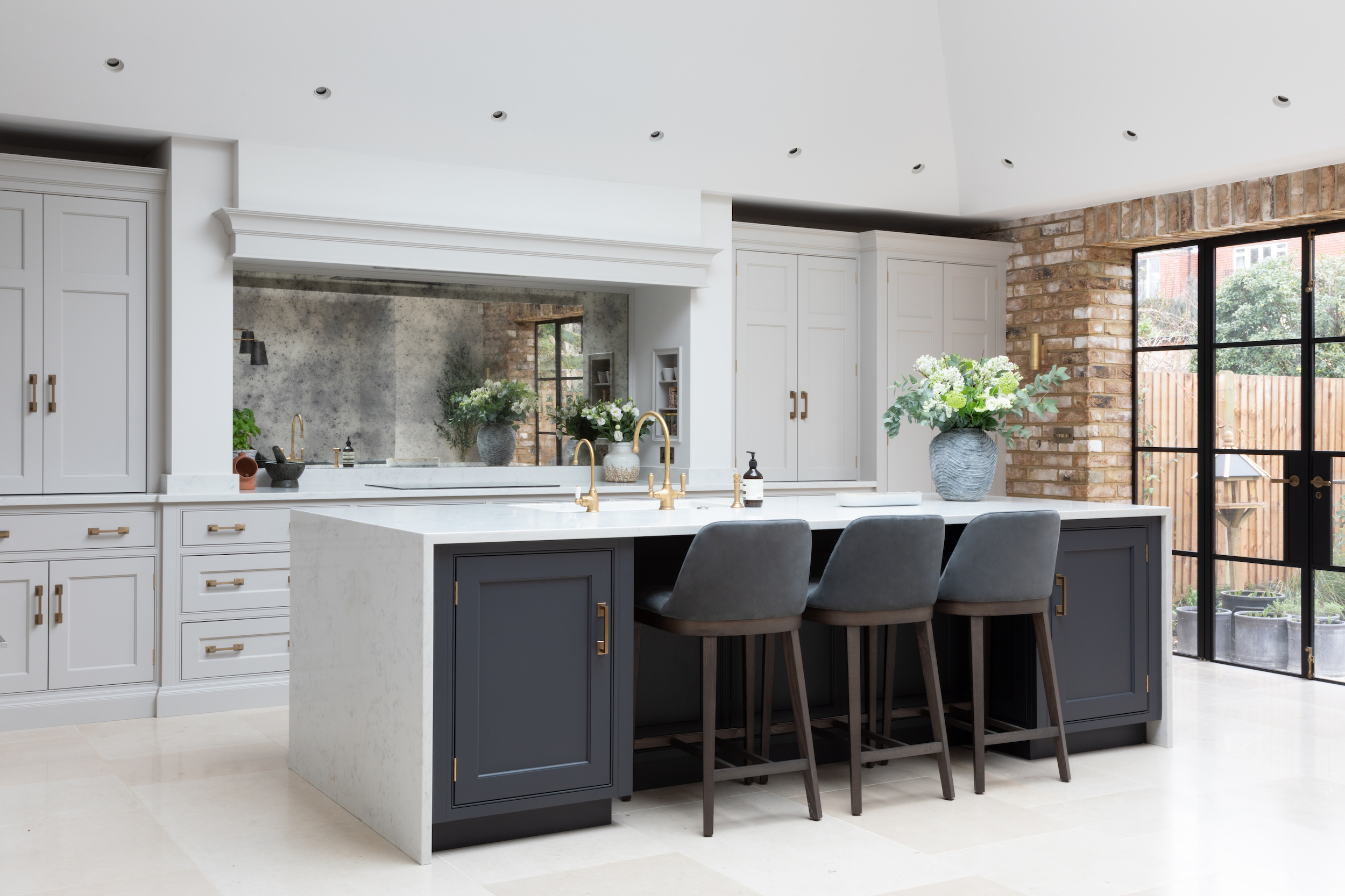 Design Notes | Antique Effect Mirror Splashback Published: 17-01-2021 A much sought after, but greatly underestimated feature in the majority of our kitchen projects is the antique effect mirrored splashback. Ideal for both smaller and expansive spaces alike, antique effect mirror splashbacks create an impressive feature when incorporated behind cooking runs. Using an antique effect mirror as a splashback is a clever way of bouncing light across the room which is particularly handy in smaller darker space (an in many cases much larger rooms too) and also means the person cooking can see what’s happening behind them. A great addition if you’re cooking for children sat at the island completing homework before dinner or sat nearby. It gives almost any kitchen an understated ‘wow’ factor and prevents the chimney area from becoming a dark recess in the room. Specially toughened to withstand heat, these splashbacks are custom made to order by Humphrey Munson and are finished with a trim typically painted in the same colour as the overmantel which frames it wonderfully. The closer you look the more you’ll notice the mottled antique effect which disguises any splashes during cooking making it a low maintenance option too in the long-term. As it’s one large piece of mirror essentially, it’s really easy to clean clean. All you need is regular glass cleaner – no special lotions or potions – perfect for busy (and often messy) family life. The largest antique effect mirror splashback that’s been photographed is at the Gerrards Cross project (pictured above). This particular project has not just one but two kitchens (a main kitchen with an AGA, and a prep kitchen with Miele appliances), the large space has been designed for both family life and entertaining, guests can perch at the island with an aperetif whilst the cook chats to them through the splashback whilst preparing dinner at the AGA. As well as keeping eye contact with others in the rooms it’s also preventing this part of the kitchen from feeling dark as the splashback bounces the light back across the space and creates a huge sense of openness. The smallest antique effect mirror splashback is installed in the Cambridge project. A small but perfectly formed project designed for cosy country living at its most luxurious. To see everything in-between and to give you more of an idea on how an antique effect mirror splashback impacts spaces of all shapes and sizes, see a selection below: View the Barnes Village project here. View the Bedfordshire project here. View the Worcestershire project here. View the Weybridge project here. Share this article Copy this link https://www.humphreymunson.co.uk/design-notes-antique-effect-mirror-splashback/ Share Copy link Previous Article Walk In Pantry | Kent Project Next Article Joe Counter Stool | Vincent Sheppard