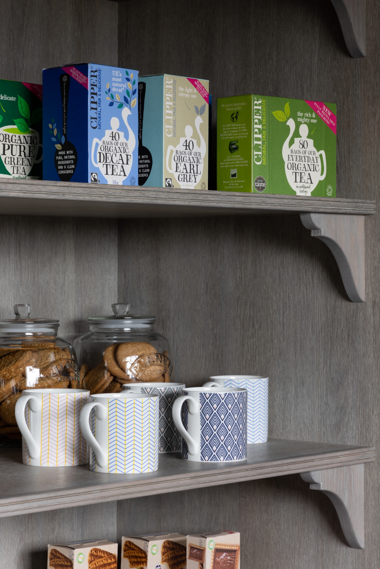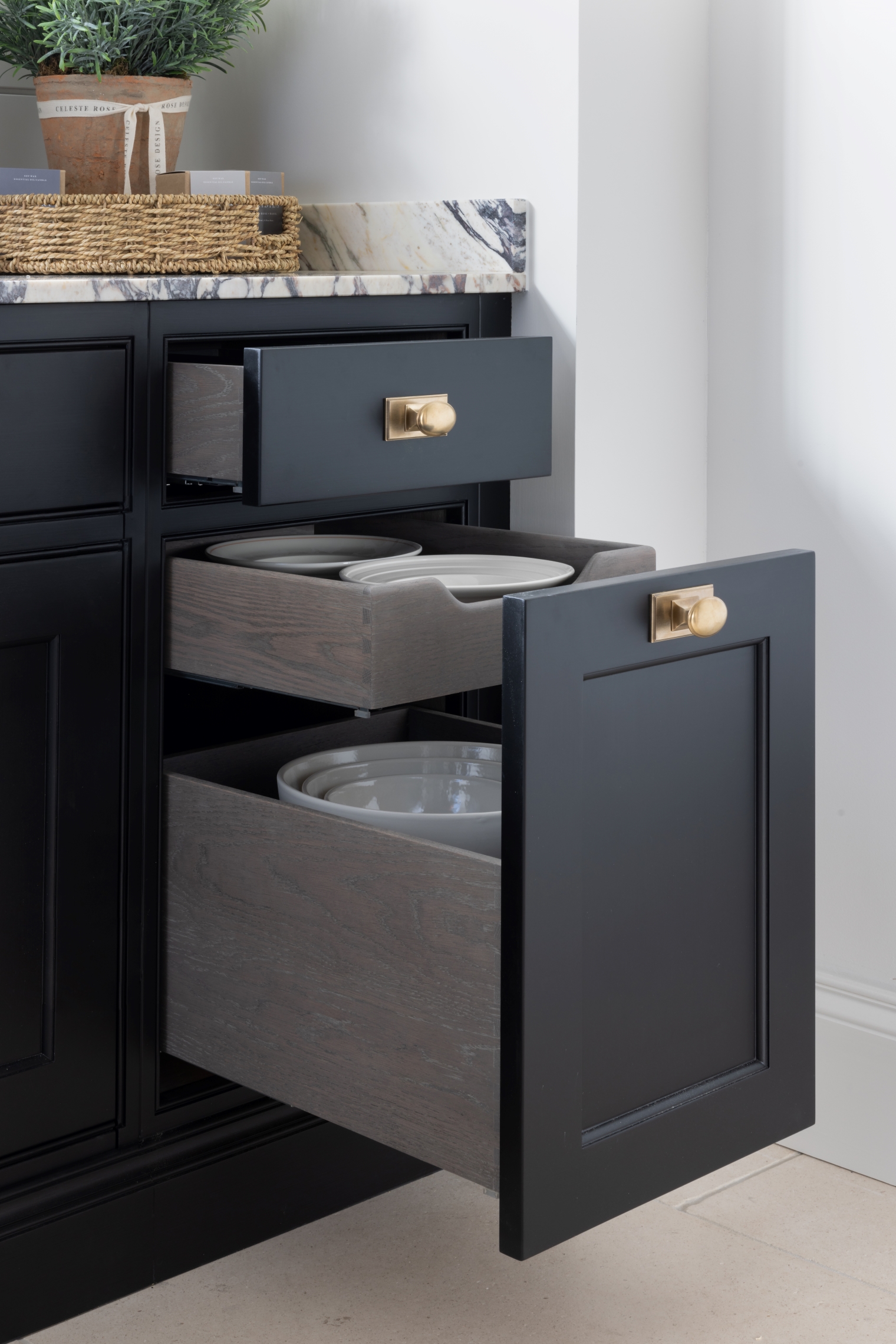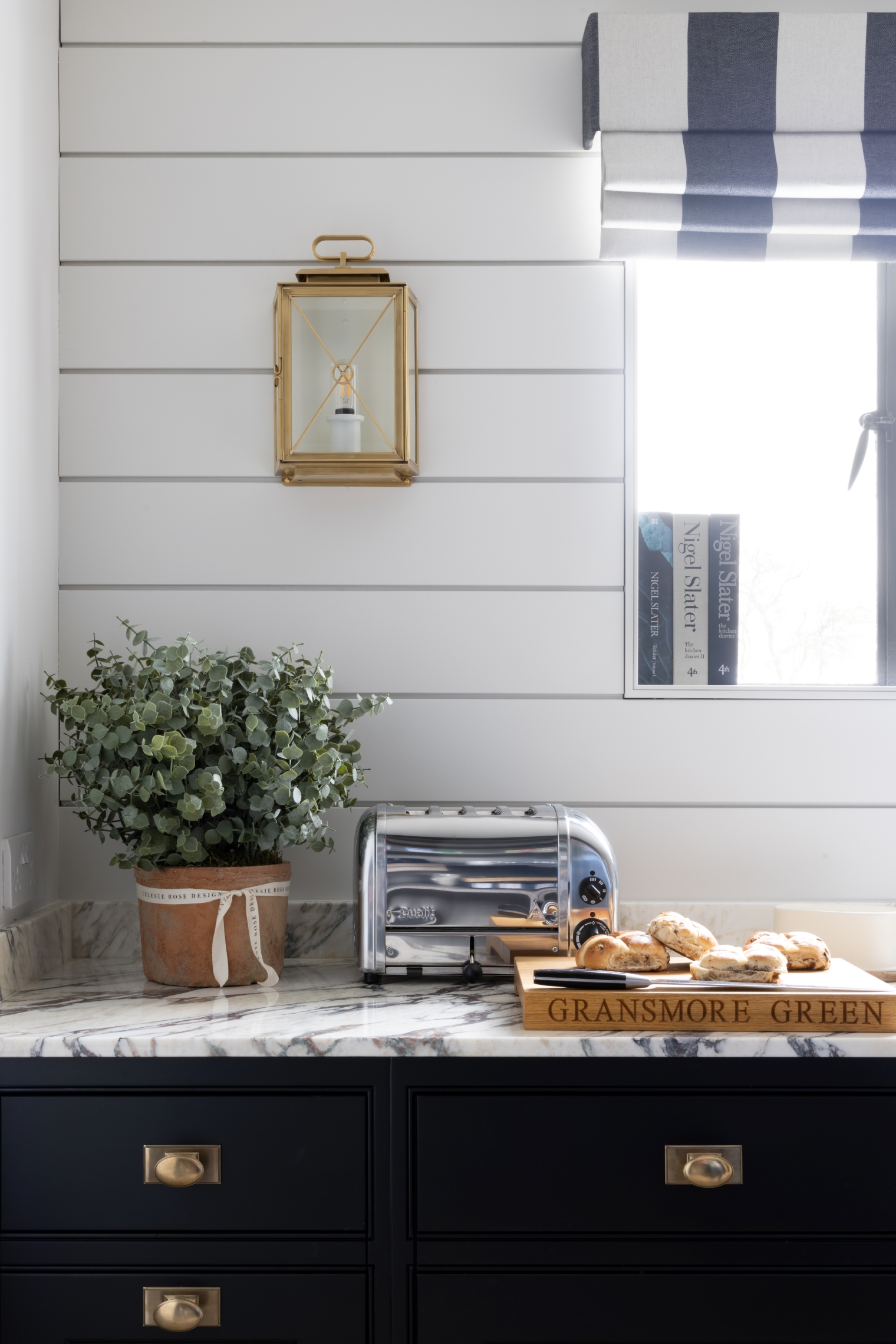 Design Notes | The Butler’s Kitchen Published: 02-04-2023 When we were designing the new bathroom and flooring showroom at HMHQ we relegated this little room to a stock room; a sort of basic storage room for things you needed but didn’t necessarily want in the showroom like samples / info cards etc. But it’s quite a big room and around that time Peter Humphrey, the founder and design director at HM, had developed a new oak finish called Montagu and we didn’t have a speck of space left in the main building to show it off. So, we had an idea to create a simple little kitchen, nothing too fancy, just enough cabinetry to show off the Montagu and then also a new colour called ‘Mr. Banks’ – a deep, dark black tone with plenty of ooomph. Of course, as our clients find with their projects, mission creep sound set in and this is where we ended up but happily, it looks absolutely incredible and shows what a bit of personality can do for a very tired little ordinary room upstairs in an industrial workshop! So, as mentioned above the Nickleby cabinetry is finished in Mr. Banks, a new colour to HM, and just used in an incredible project in Leicestershire that we can’t wait to share later this summer. The Quilp handles are finished in mid antique brass waxed by Joseph Giles. We placed a large Shaws butler sink centrally under the window with the Quooker Classic Fusion tap which is finished in patinated brass. This vey clever tap does hot and cold water, boiling 100C water, chilled filtered water and sparkling water. Taps can be a source of frustration for us because it’s so impossible trying to match finishes across different tap manufacturers and the thing missing from this sink is a rinse, but as this will be mostly used for making hot drinks and clearing away a few bits and bobs we felt we could go without the rinse and use this particular tap here. The worktops are Calacatta Viola marble which again, because this kitchen will be used more for making hot drinks and snacks, it would be less susceptible to damage and also has so much mottling and colouring it in, any damage would be lost in the natural marble markings. The new Montagu finish is very similar to our Smithfield weathered oak but doesn’t go through the same process of wire brushing by hand so it’s softer and also much less expensive to manufacture. It has a beautiful hue that looks and feels so luxurious. This is a great shot by Paul Craig of the tall cabinetry showing off the Montagu finish but also these gorgeous fine bone china mugs which are by Jo Deakin; they are all made in Stoke-on-Trent – we love the different designs and the mix and match patterns. We’ve noted below all the design details of this space for future reference: Cabinetry: Nickleby Hardware: Quilp in Mid Antique Brass Waxed Worktops: Calacatta Viola marble Walls: Bespoke panelling by HM, all finished in Southwold Butler Sink: Shaws butler sink – link here Tap: Classic Quooker Fusion, patinated brass – link here Tea towel: Tori Murphy, Chevy tea towel in Fawn/Linen – link here Faux plants: Celeste Rose Designs – link here Toaster & Coffee Machine: Dualit – link here Engraved Chopping board: Humphrey Munson – link here Dish soap: Norfolk Living – link here Blind fabric: Tori Murphy – Sleeper Stripe Cotton Fabric Black – link here Blind made by: The Harper Collection – link here Wall lights: Vaughan Designs – Richmond Wall Lantern, Brass – link here If you’d like to make an appointment to come and visit us in Felsted please do get in touch with the client services team on 01371 821300 or email us at info@humphreymunson.co.uk. Share this article Copy this link https://www.humphreymunson.co.uk/design-notes-the-butlers-kitchen/ Share Copy link Previous Article Creme Egg Chocolate Brownie Next Article AlmaLusa Comporta | Portugal’s coolest new coastal retreat