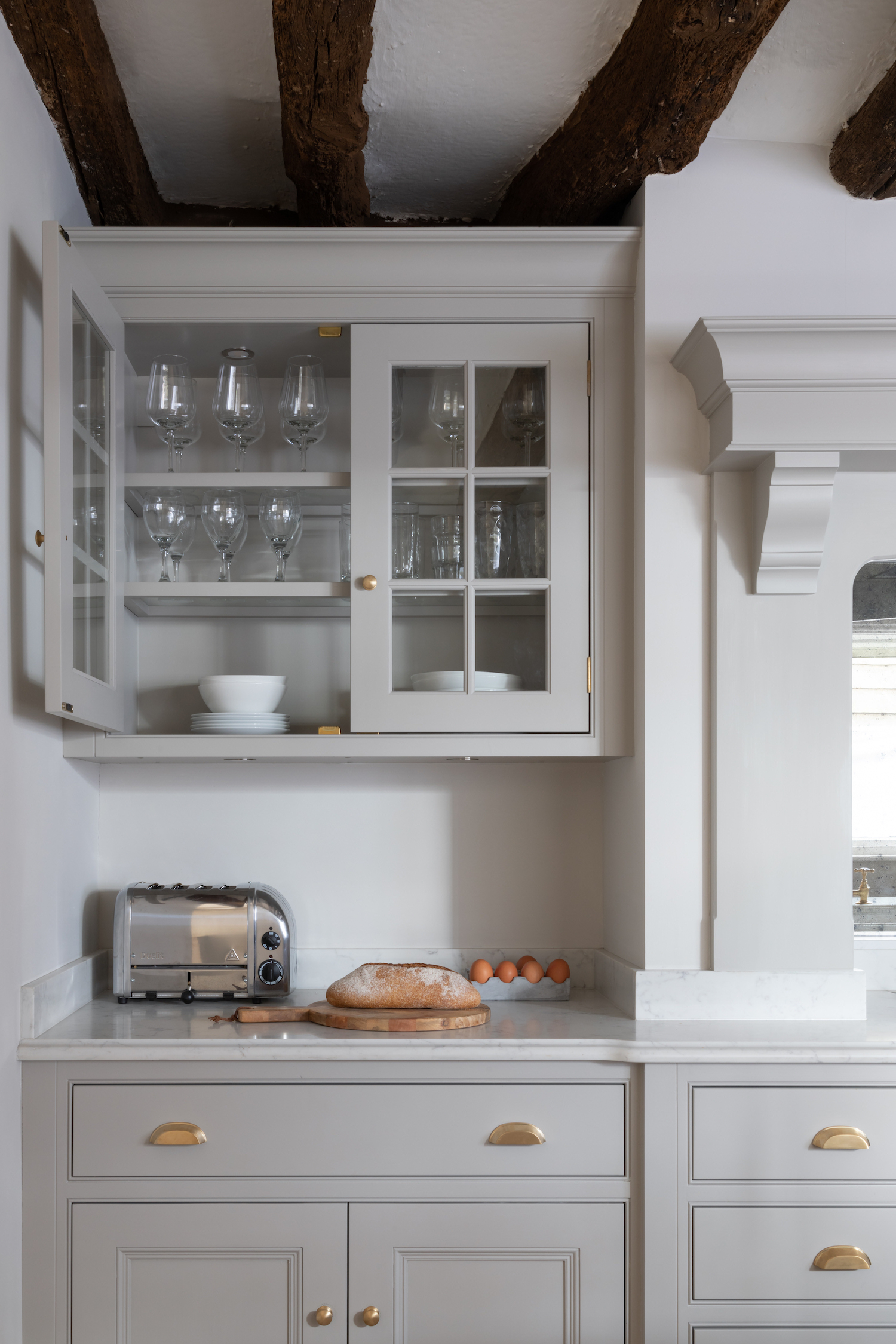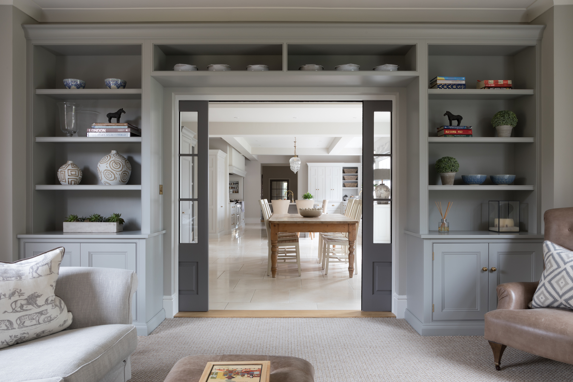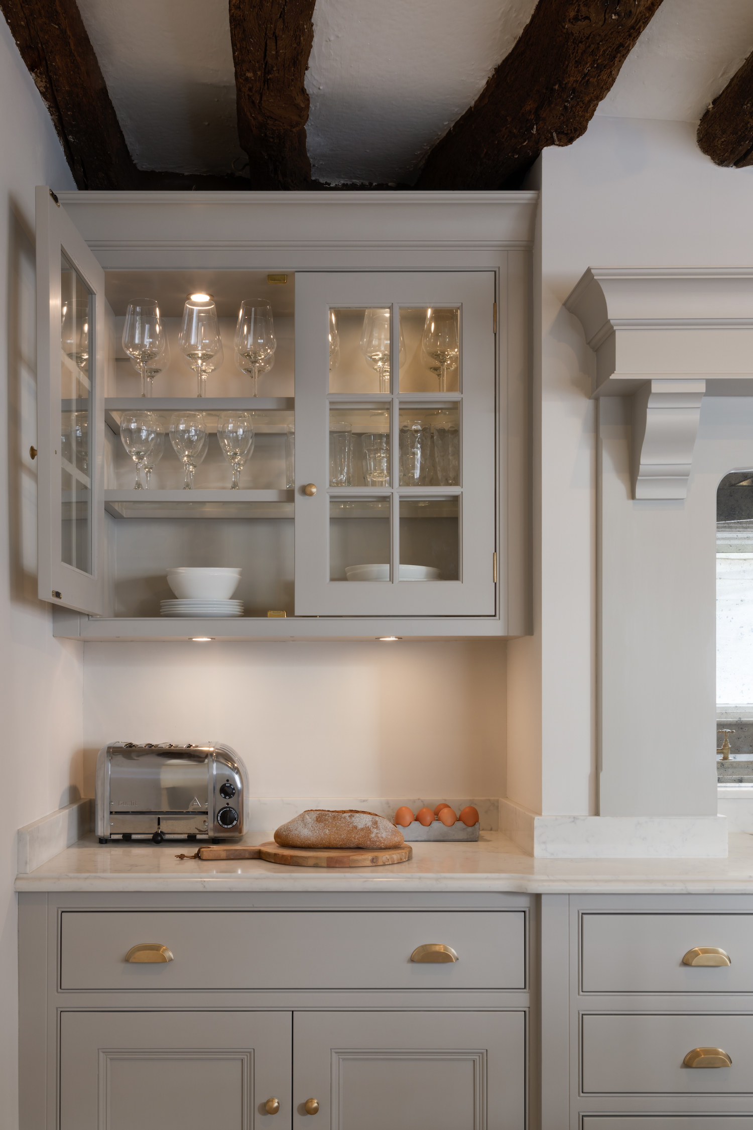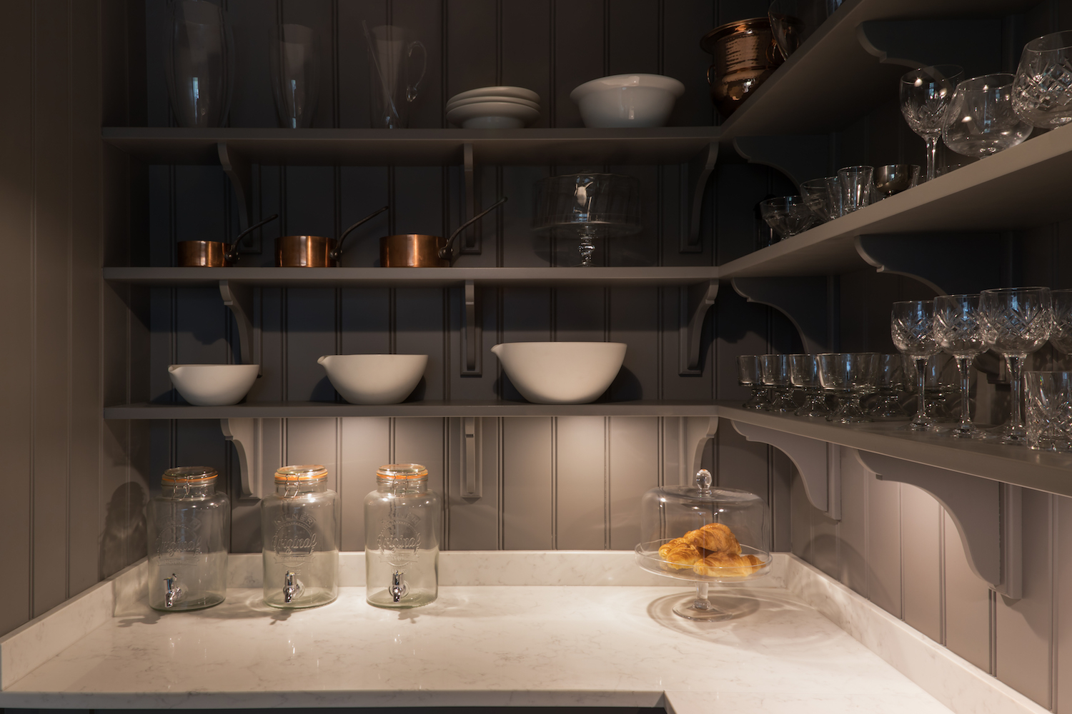 Design Your Dream Kitchen | Cabinetry Lighting Published: 31-12-2020 Lighting is one of the most integral aspects of a successful design and something we always consider in our design work. There are a few different ways we incorporate lighting into our designs and wanted to share some of our favourite project images with you here as inspiration…. The walk in pantry just off the main kitchen at the Park Lodge project is finished in HM colour ‘Farthing’. This room offers masses of open and closed storage, open artisan shelves holds glassware, tableware and cookware, the worktop below can be used as an additional food prep space or to store larger items like cake stands out of view of the main kitchen. Task lighting to illuminate the worktops was therefore essential so we recessed lights into the underside of the shelving. The glazed wall cabinets in this Longford kitchen have timber framed glazed shelves and were designed to store tableware and glassware. It’s really helpful to see the two sources of lighting in the above image – downlights in the top of the cabinet as well as on the base provide illumination within the cabinetry and below for task lighting. These are on a circuit switch with the lighting set inside the chimney and above the island so that you can easily create a relaxed and cosy atmosphere in the evening. The breakfast countertop cupboard at the Cambridge project has a bi-folding door finished in HM paint colour Top Hat that opens to reveal a illuminated worktop space for preparing hot drinks and a place to put away the Nespresso coffee machine, shelving above is used to store a microwave and crockery. All our countertop cabinetry lighting comes on automatically on a sensor when you open the door. For a glazed dresser cabinet, illumination is essential to create a beautiful effect in the evenings. This one has Nickleby cabinetry finished in HM Farthing with polished nickel hardware. Above is the snug cabinetry in the Cranbrook project which has Longford cabinetry finished in HM Farthing Pale. Above is the same cabinetry with the shelving illuminated thanks to discreet integrated lighting installed with the cabinetry. All our lighting can be dimmable and we discuss this aspect of the design with the contractor team to ensure they are compatible with the underlying lighting system. Share this article Copy this link https://www.humphreymunson.co.uk/design-your-dream-kitchen-lighting/ Share Copy link Previous Article Design Your Dream Kitchens | The Perfect Finish Next Article How to seal limestone
