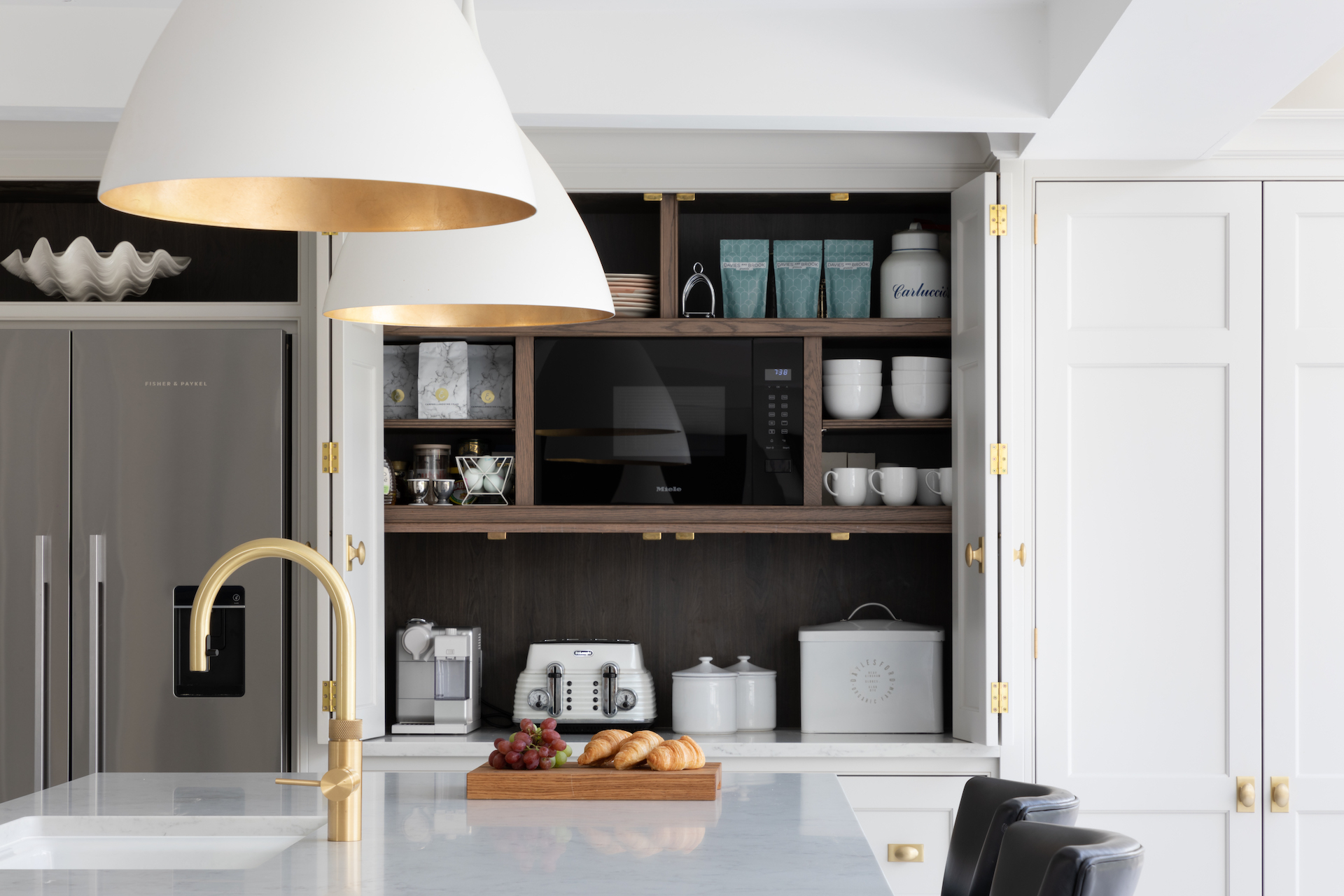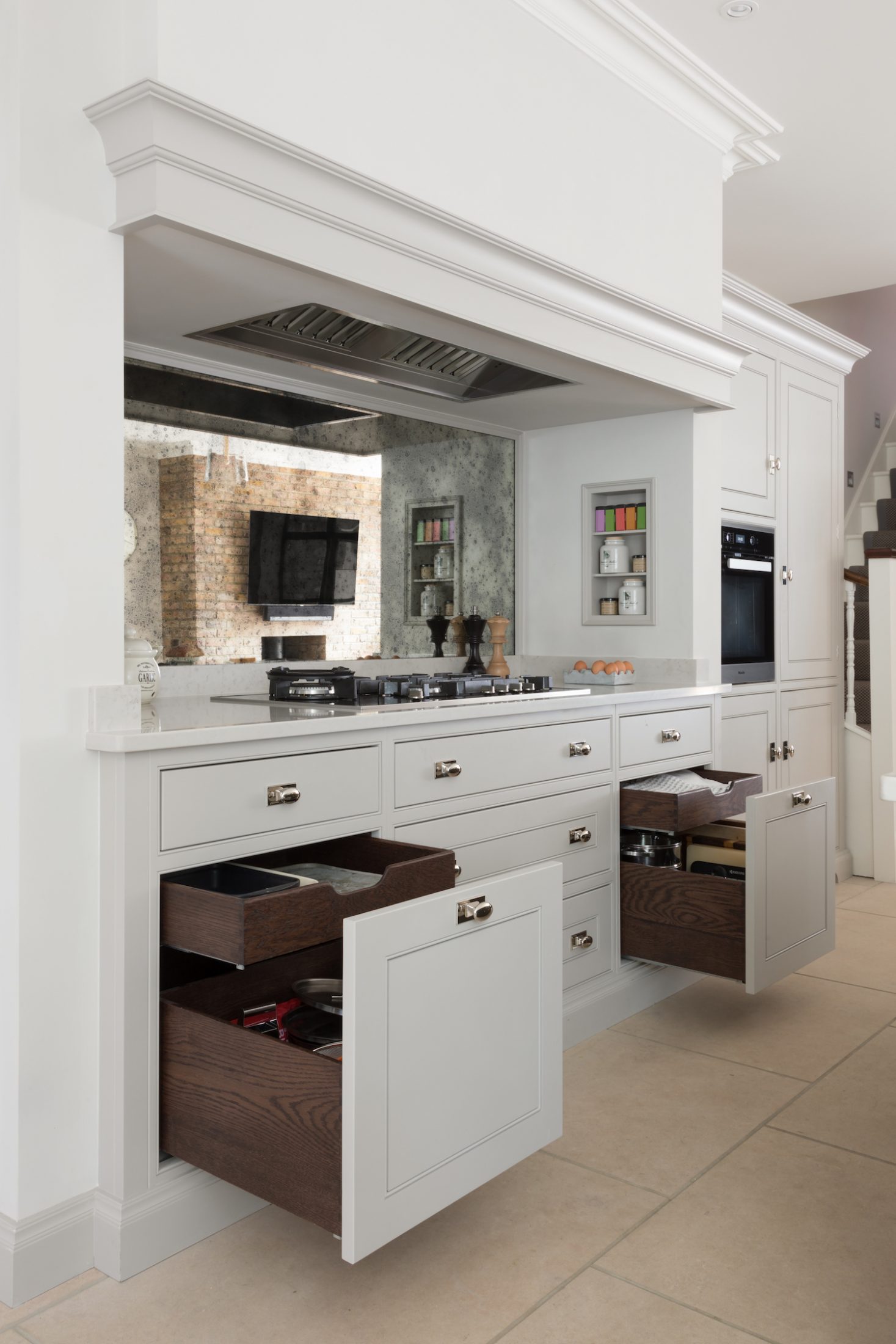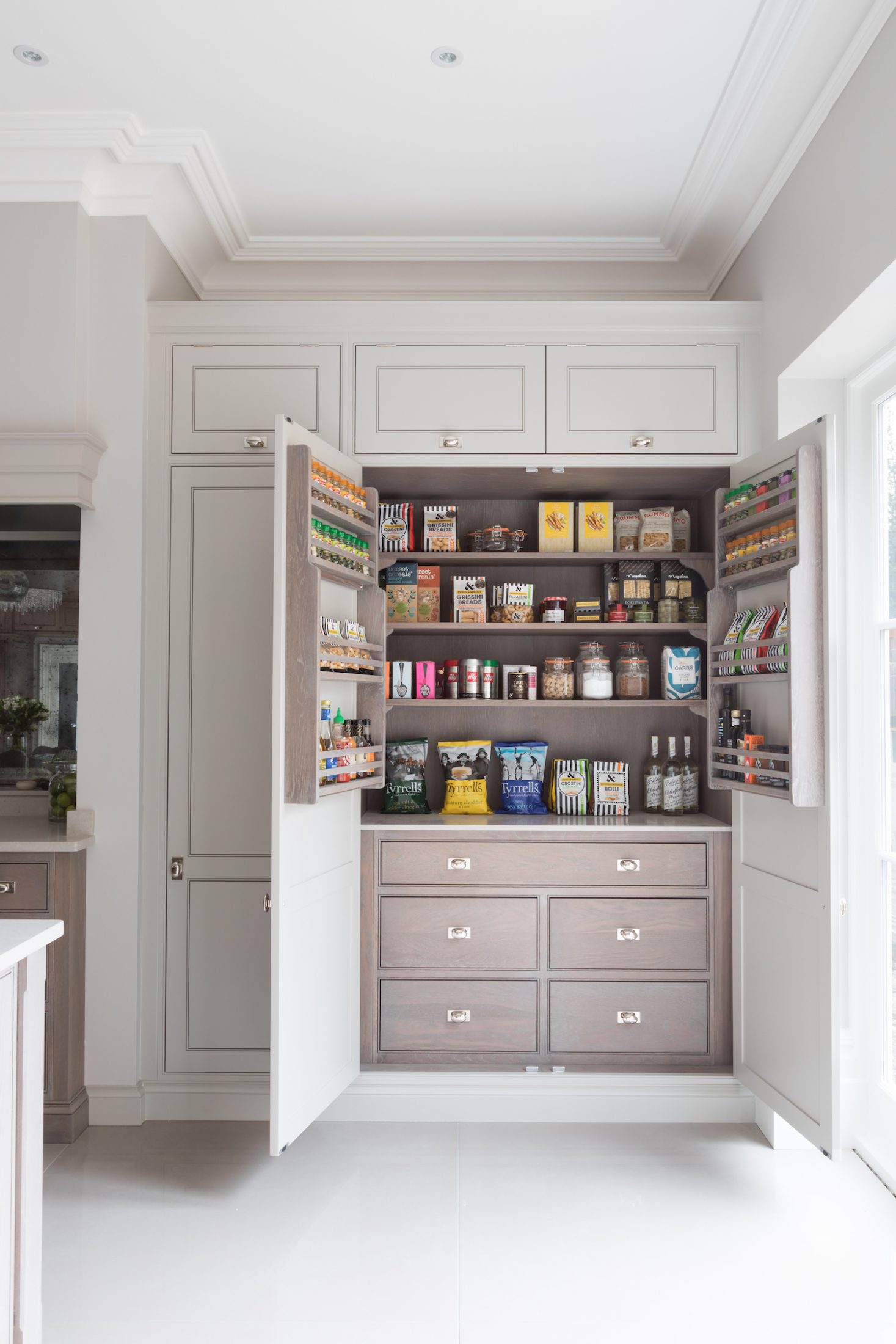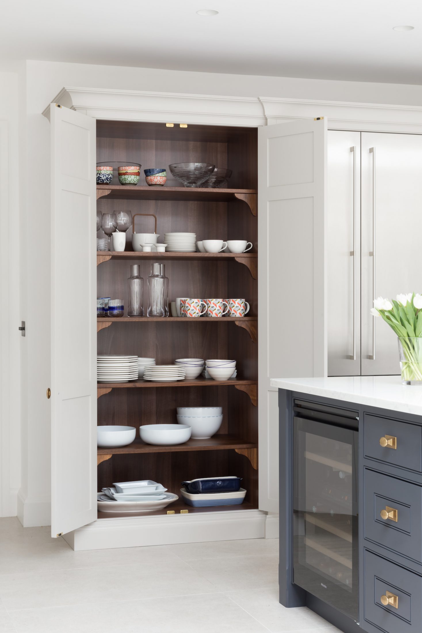 Design Your Dream Kitchen | Smart Storage Published: 31-12-2020 At HM we subscribe to the mantra that when it comes to storage, more is always more. There are some key elements we love to include for easily accessible storage in a kitchen design and we wanted to share those with you here… 1 / C R O C K E R Y C U P B O A R D The crockery cupboard comes in a few different guises, but each serves the same function – a space to store glassware, tableware and servingware in one convenient spot. The Hampstead project has a full height crockery cupboard for storage to the left hand side of the integrated Gaggenau fridge freezer. The interior is American walnut, while the exterior Spenlow cabinetry is finished in HM Tailored Grey. Designed as part of a scullery just behind the main kitchen, this countertop crockery cupboard can be used to store a plethora of tableware. The interior is HM Classic oak while the painted exterior Nickleby cabinetry is HM Farthing. This countertop cupboard at the Knightsbridge project is glazed with timber framed glazed shelves and has integrated lighting included to illuminate this cabinetry in the evening. 2 / P A N S T O R A G E Pots and pans are used so frequently in a kitchen that they are a special consideration when planning the design. Location is key – keep the everyday ones nearby and in drawers, while less frequently used options can be stored further away in cupboards. Two sets of three drawer chests either side of the Wolf range cooker at the Hampstead project provide masses of storage for pots and pans. The homeowners at the Crouch End project love to cook and have a huge amount of kit that needs to be easily accessible. We included these pot cupboards either side to allow for easy access to the equipment and accessories stored within. 3 / B R E A K F A S T C U P B O A R D As the busiest meal of the day, breakfast is all about getting what you need (coffee!) and what the children need, and doing it quickly! The breakfast cupboard provides space for the toaster and coffee machine as well as other essentials. The breakfast cupboard has space for the toaster and coffee machine as well as an integrated Gaggenau microwave for porridge. Spice and condiment racks maximise storage space in this hard-working cupboard. A similar design at the Warwickshire project has the integrated Miele microwave set above, and countertop space below for the toaster and coffee machine and also has the benefit of bi-folding doors so this cupboard can be left open when in use or closed away when not required. 4 / D A Y P A N T R Y One of the most requested items for an HM kitchen is the day pantry – a classic design with open shelving, countertop space and drawers to hide away all the stuff you don’t want out on show. The main storage run in the North London project features this full height cook’s pantry providing copious amounts of dry food storage and is conveniently placed next to the French door fridge freezer. The day pantry at the Langton House project in Theydon Bois has HM weathered Smithfield oak interiors with painted Spenlow cabinetry on the exterior finished in HM Tailored Grey. 5 / D R I N K S C A B I N E T An essential for entertaining at home, the drinks cabinet provides a space to store glassware and prepare drinks before and after dinner. This drinks cabinet at the White House project in Beaconsfield shown open here houses glassware and bottles providing a space for preparing and serving cocktails and pre-dinner drinks to guests sat at the formal dining table nearby. Finished in bespoke colour HM ‘Farthing II’, this ultimate drinks cabinet provides the perfect spot to decant and serve wine or fix a drink with countertop space for storing spirits and an under-counter integrated fridge for mixers and soft drinks that also includes a freezer section for ice cubes. Everything you need in one place. Share this article Copy this link https://www.humphreymunson.co.uk/design-your-dream-kitchen-storage/ Share Copy link Previous Article Design Your Dream Kitchen | Layout & Planning Next Article Design Your Dream Kitchens | The Perfect Finish