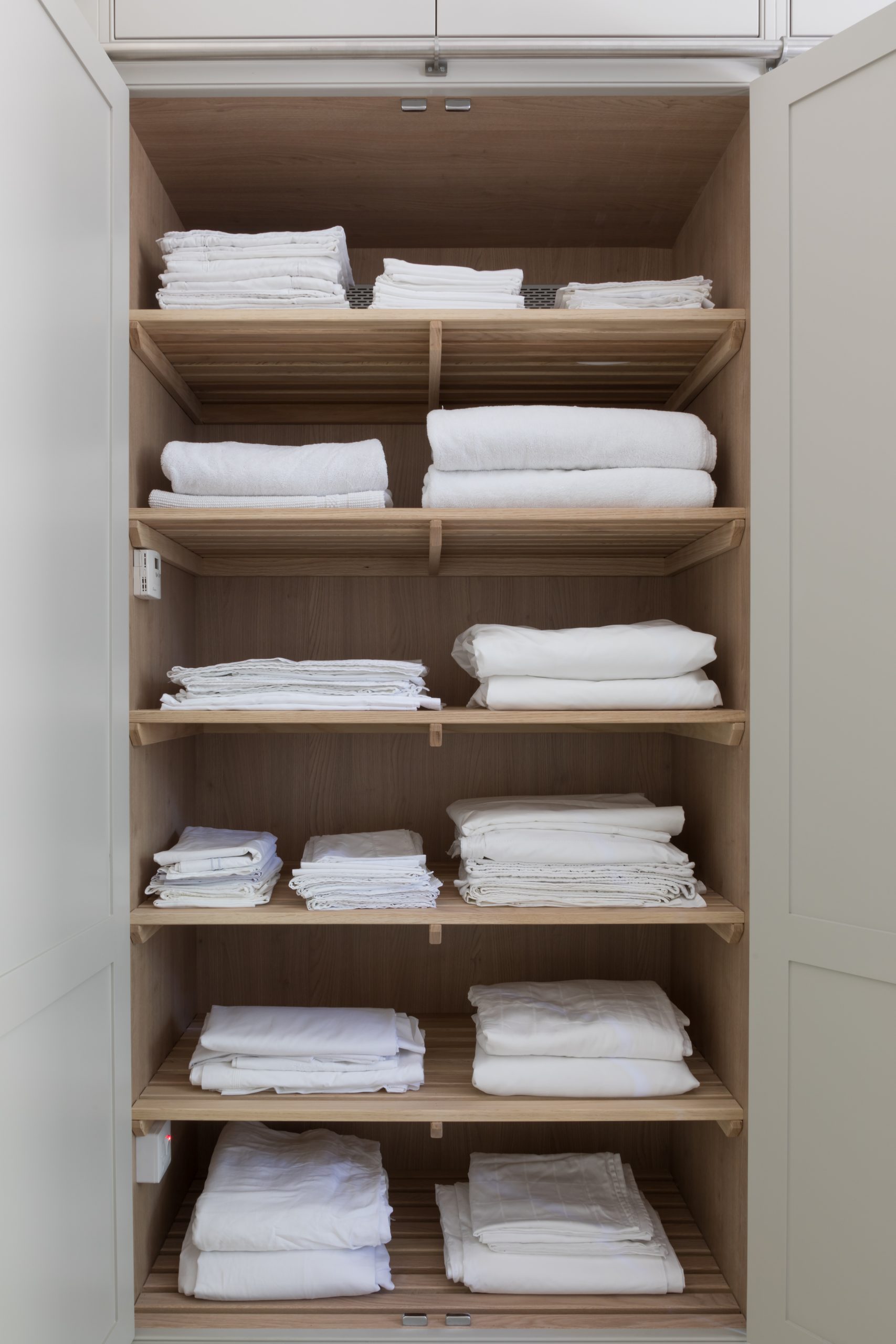 Drying Cupboard Published: 30-08-2020 Opting for a drying cupboard isn’t usually something clients will think about when considering a utility room, however they can be a hugely beneficial piece of cabinetry that once you have it, you won’t know how you lived without it before. A drying cupboard that is thermostatically controlled is the perfect final piece of the utility room specification as they are particularly useful for drying delicate items that cannot go in the tumble dryer such as cashmere or silk and ensures things can be dried easily and out of the way. As well as being practical, they have also been designed to look good. We feel this is really useful if you have a utility room that you may use to access the home rather than the front door – it’s lovely to be able to keep drying clothes completely out of the way so that your entrance is clear and uncluttered. The drying cupboard in the Felsted showroom is finished in HM paint colour ‘Goose Iron’ and opens to reveal slatted shelves to dry towels and linens. Between the two shelves is a rail so that items of clothing can be hung up to dry without getting creased. This utility room at the Cotswold country house project features floor-to-ceiling Nickleby cabinetry painted in HM ‘Tailored Grey’ (a bespoke paint colour to Humphrey Munson made exclusively by Mylands) and conceals this drying cupboard, which is ideal for storing bed linen. The shelving is Classic oak and is slatted to allow warm air to pass through and over towels and linen to help dry everything evenly. A dream utility room at the Langton House project has Spenlow cabinetry painted in HM ‘Tailored Grey’ and is finished with polished nickel quilp handles. The right side of this utility room has a thermostatically controlled drying cupboard which is neatly hidden away behind cabinetry – perfect for busy families. To make an enquiry about a kitchen please email us on info@humphreymunson.co.uk or call our team on 01371 821300. Share this article Copy this link https://www.humphreymunson.co.uk/drying-cupboard/ Share Copy link Previous Article Flavourtown Bakery | Multi-Award Winning London Bakery Next Article Forbes & Lomax