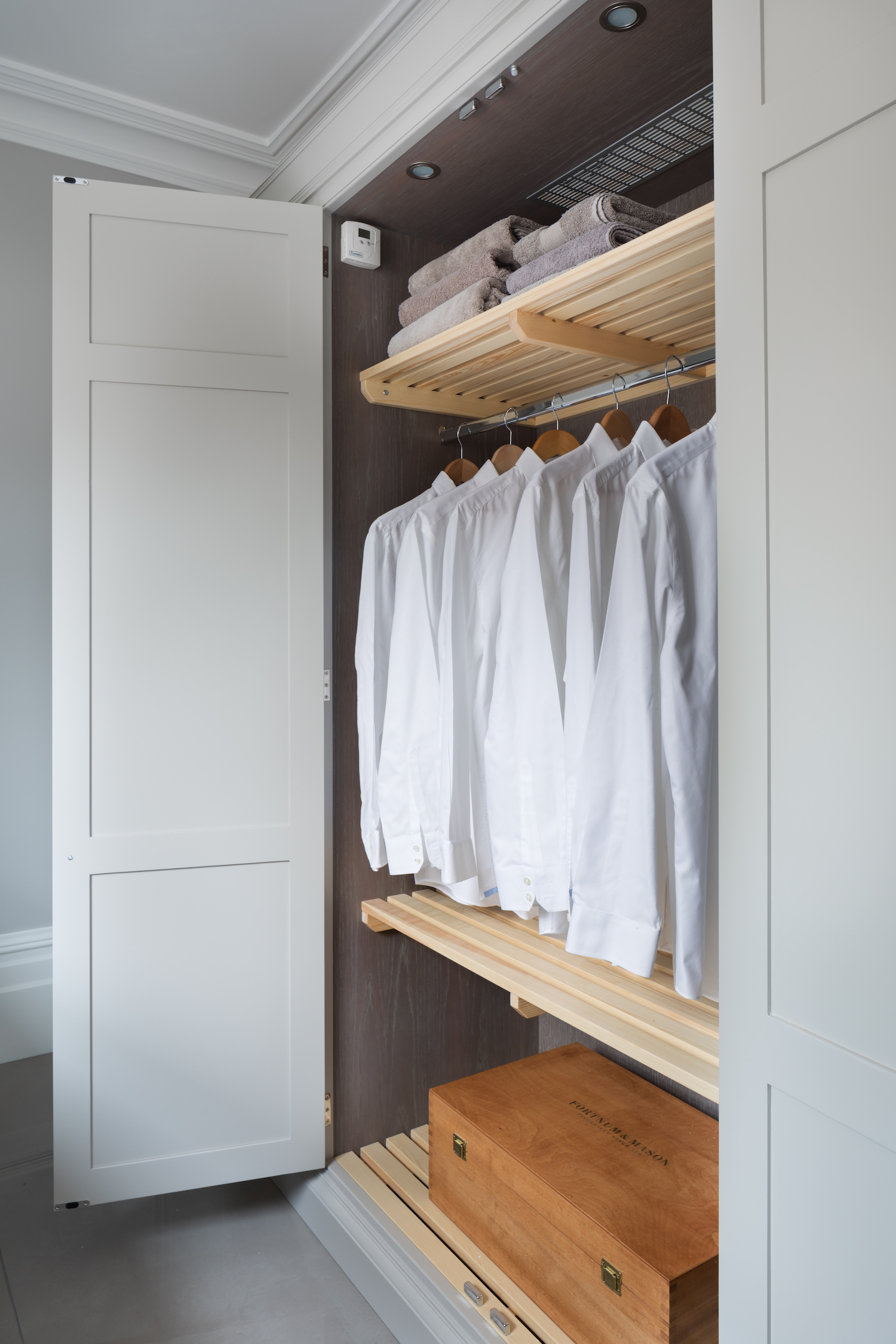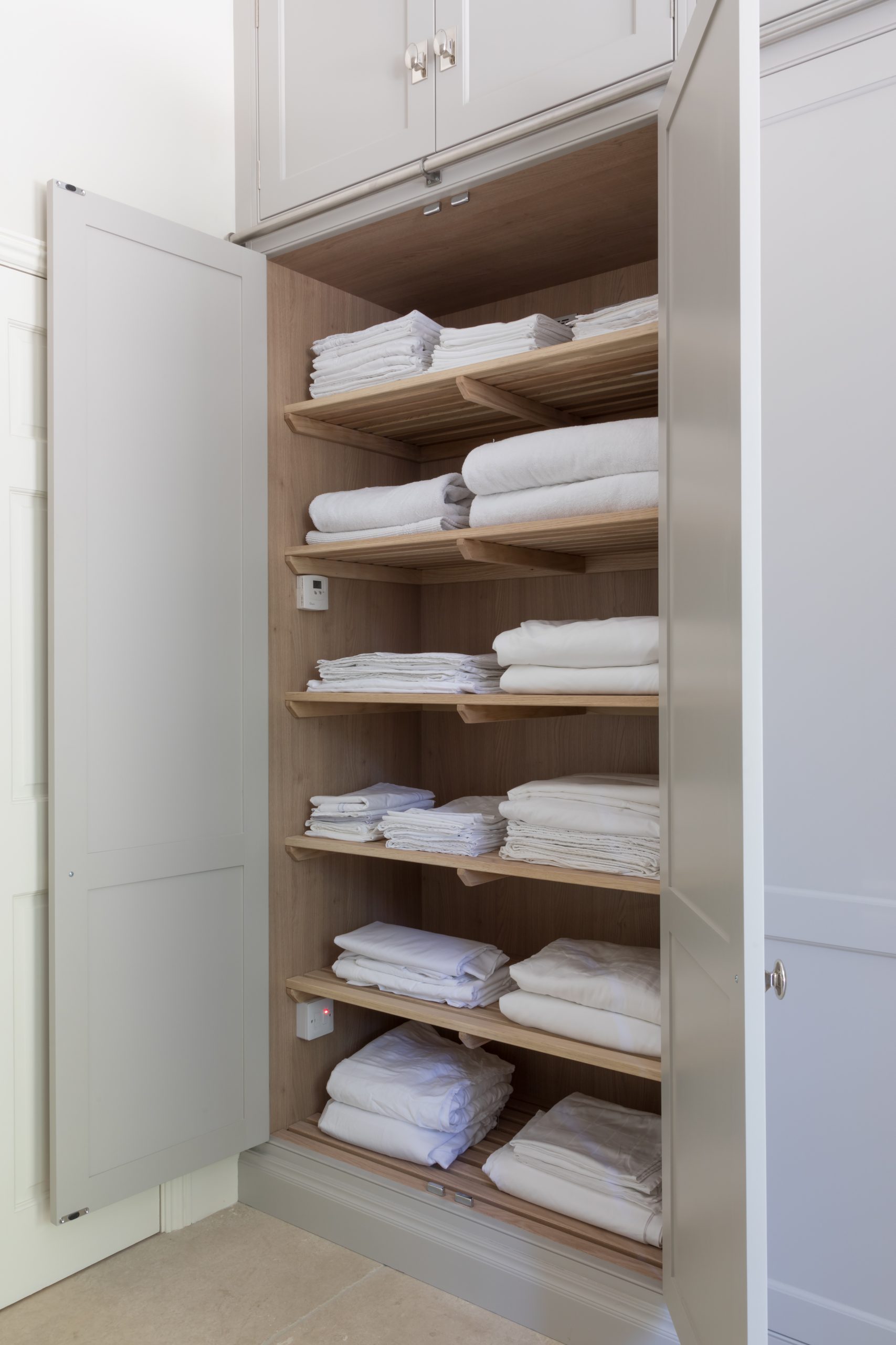 Drying Cupboard Published: 30-08-2020 Opting for a drying cupboard isn’t usually something clients will think about when considering a utility room, however they can be a hugely beneficial piece of cabinetry that once you have it, you won’t know how you lived without it before. A drying cupboard that is thermostatically controlled is the perfect final piece of the utility room specification as they are particularly useful for drying delicate items that cannot go in the tumble dryer such as cashmere or silk and ensures things can be dried easily and out of the way. As well as being practical, they have also been designed to look good. We feel this is really useful if you have a utility room that you may use to access the home rather than the front door – it’s lovely to be able to keep drying clothes completely out of the way so that your entrance is clear and uncluttered. The drying cupboard in the Felsted showroom is finished in HM paint colour ‘Goose Iron’ and opens to reveal slatted shelves to dry towels and linens. Between the two shelves is a rail so that items of clothing can be hung up to dry without getting creased. This utility room at the Cotswold country house project features floor-to-ceiling Nickleby cabinetry painted in HM ‘Tailored Grey’ (a bespoke paint colour to Humphrey Munson made exclusively by Mylands) and conceals this drying cupboard, which is ideal for storing bed linen. The shelving is Classic oak and is slatted to allow warm air to pass through and over towels and linen to help dry everything evenly. A dream utility room at the Langton House project has Spenlow cabinetry painted in HM ‘Tailored Grey’ and is finished with polished nickel quilp handles. The right side of this utility room has a thermostatically controlled drying cupboard which is neatly hidden away behind cabinetry – perfect for busy families. To make an enquiry about a kitchen please email us on info@humphreymunson.co.uk or call our team on 01371 821300. Share this article Copy this link https://www.humphreymunson.co.uk/drying-cupboard/ Share Copy link Previous Article Lexington Dining Table Next Article The Enduring Charm Of A Traditional Butler Sink