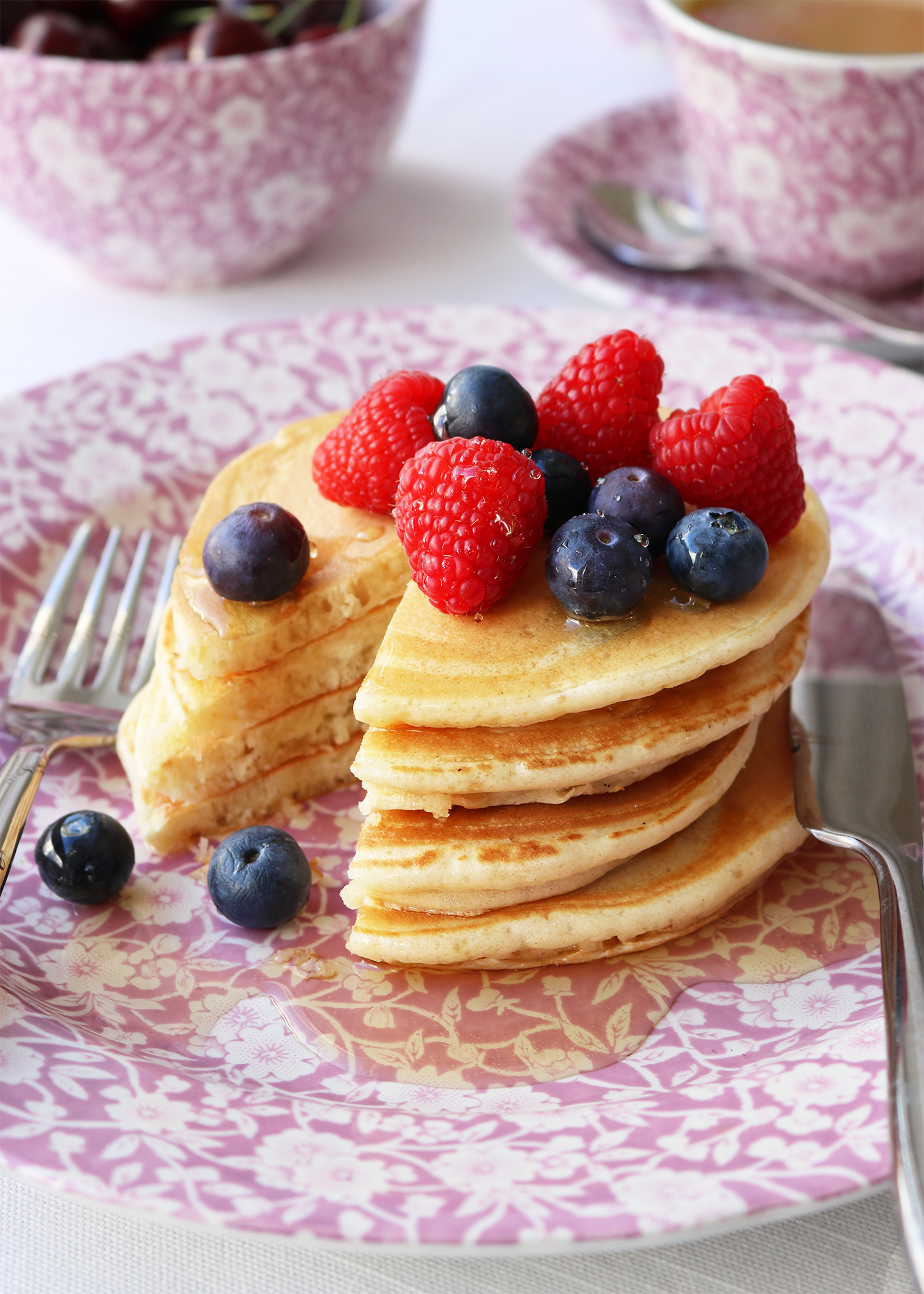 Fluffy American Style Pancakes Published: 22-01-2025 One of our most treasured brunch staples for a slow start on the weekend has to be these fluffy American-style pancakes. Easy to make and delicious served either with fresh fruit or streaky pancetta and maple syrup. INGREDIENTS (Mixture makes 6-12, size dependant) 300g self-raising flour 1tbsp caster sugar 2 medium eggs and 1 egg white 300ml milk (whole tastes better) 1stp vanilla essence Method Weigh the flour and sieve it into a large bowl with a small pinch of salt and sugar. Mix together well. Crack the eggs and split the yolks from the whites. Place the three egg whites into a clean, bowl and set aside a moment. Tip two egg yolks into the flour mix with the milk and vanilla extract and mix until the batter is smooth (it will look a little thick at this point but don’t panic). Whisk the egg whites until fluffy and they create soft peaks. Gently fold the egg whites into the larger bowl of ingredients, until well combined, be careful not to beat the mixture, you want to keep the air in so your pancakes rise. Warm a pan or teppanyaki with a little oil, before adding spoonfuls of batter to create the pancake size you’d like. We made pancakes roughly 10cm in diameter so that we could stack them. Cook on a gentle heat, until bubbles start to appear on the surface and the underside is a light, golden brown. Then flip and cook the other side. Eat the pancakes straight away or keep them warm in the oven on a low heat whilst you cook up another batch. Serve the pancakes with fresh berries and a good drizzle of maple syrup. Top tip – Add blueberries and chopped walnuts to the batter before cooking or keep it savoury and serve with crispy pancetta and scrambled eggs. Images: HM Blossom Calico Tableware by Burleigh Pottery Share this article Copy this link https://www.humphreymunson.co.uk/fluffy-american-style-pancakes/ Share Copy link Previous Article What to do with your leftover Panettone… Next Article Homemade Granola