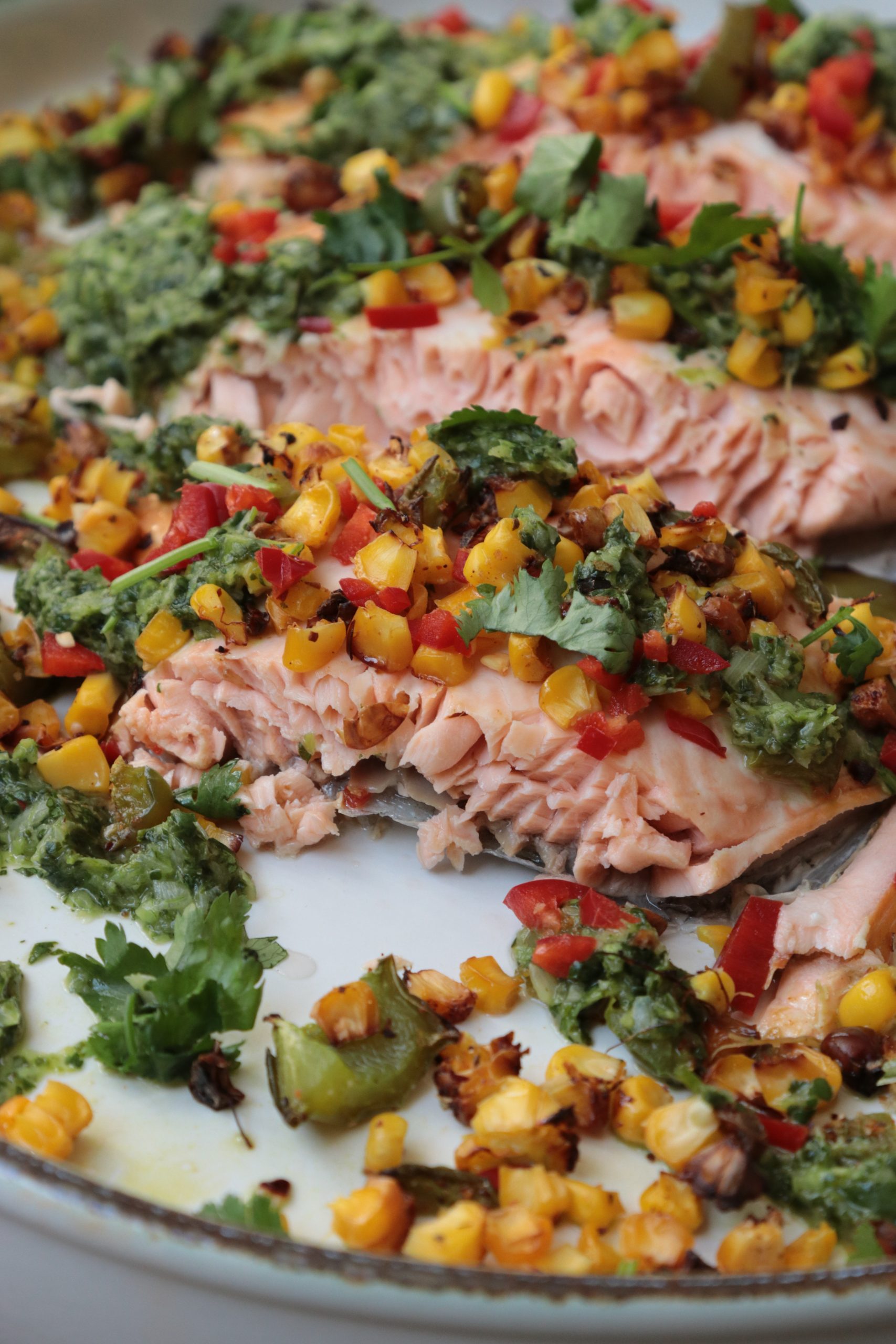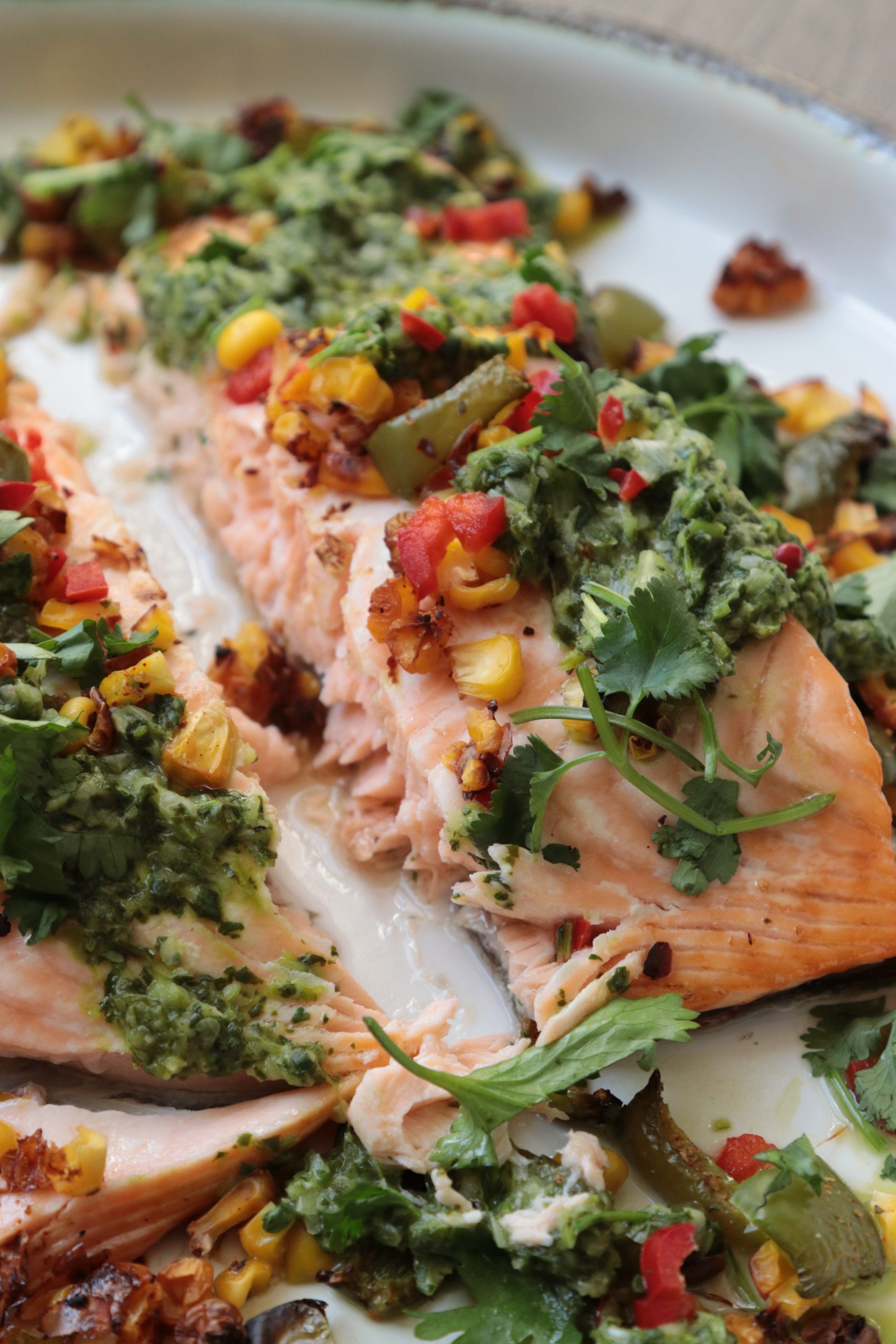 Fresh & Zingy Salmon Published: 24-04-2021 This is a great recipe to serve for lunch or a light supper at this time of year – it’s fresh, zingy and packed with flavour. Serve with steamed white basmati & wild rice. If you can’t get a half side of salmon, you can do the same with fillets just reduce the cooking time. Ingredients A half side of salmon 1 x red chilli, finely sliced 1 x green pepper, diced 2 x corn on the cob, shredded 3 x spring onions, chopped up A big handful of coriander 60ml of lime juice 2 tablespoons of extra virgin olive oil Sea salt and black pepper Method 1. Pre-heat the oven to 180°C fan, 200°C static. 2. Add the green pepper and corn to a baking tray – we use bake-o-glide to save on the washing up and it means you don’t need to add oil. If you don’t have a non-stick tray or bake-o-glide sheets, use a little olive oil. These will take around 30 minutes in a pre-heated oven. 3. After the pepper and corn tray has been in the oven for around 10 minutes, place the salmon on a roasting tray or baking dish (again, we use bake-o-glide). Season with salt and pepper and bake in the oven for around 20 minutes. We used a Meater probe and baked the salmon until it got to 62°C internal temperature. 4. While the salmon is cooking, put the coriander (reserve a few sprigs for garnishing), lime juice, spring onion and olive oil in a little blender and pulse into a sauce. Season with salt and pepper. 5. Place the salmon on a serving plate, and top with the grilled corn and green pepper, a few dollops of the sauce, fresh red chilli and fresh coriander. Enjoy! The sauce is actually really good with chicken burgers too, or make it into a creamy dip by adding 1 ripe avocado. Images: HM Share this article Copy this link https://www.humphreymunson.co.uk/fresh-zingy-salmon/ Share Copy link Previous Article HM Jute Bag Next Article Chiswick Project