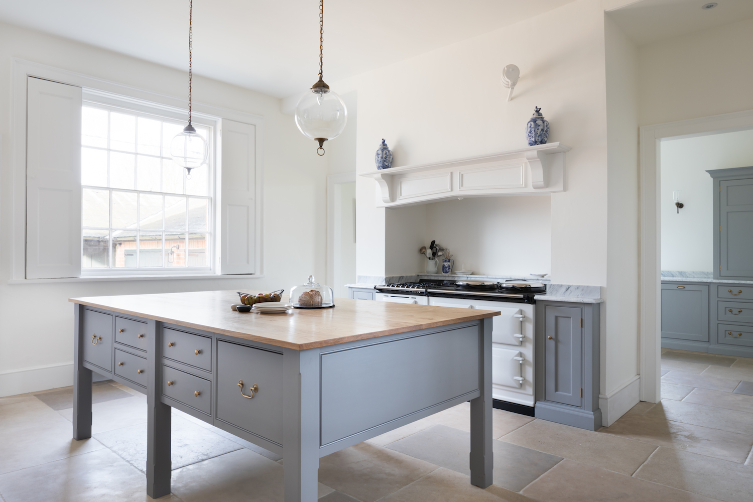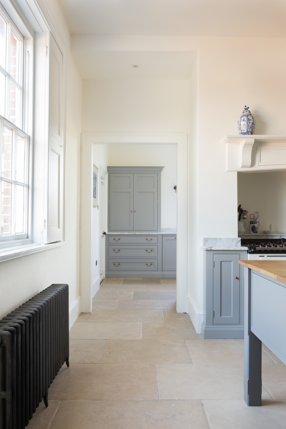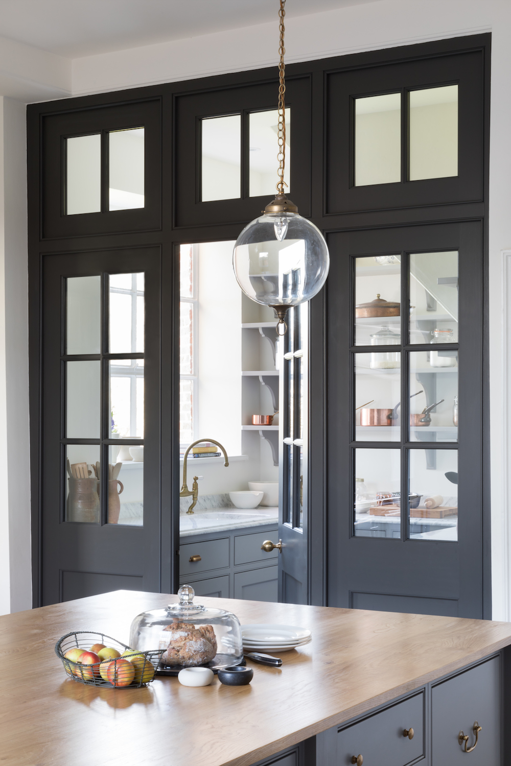 Georgian Hunting Lodge | Before & After Published: 01-10-2017 It’s always a wonderful feeling to see a space transformed and the kitchen at the Georgian Hunting Lodge project is no different. When it came to the interior design of this project, it was immediately obvious that the homeowners of this beautiful historic house had an incredible eye for balance and harmony and they were keen to restore some of the former glory to this Georgian family home. The initial design meetings highlighted a shared love of the English country-house aesthetic so we focused on creating a series of spaces that would give this home a kitchen it deserved. This is the before photograph above. The oil-fuelled AGA was housed in a chimney with doorways on either side leading to a larger utility / scullery room. The corner under the stairs had more cabinetry with a gas hob and a small sink area. The white doorway on the left opens into a larder comprising floor to ceiling shelving while the white doorway on the right leads onto the hallway. And this is the after photograph. Structurally speaking, the alterations to this space were minimal but the doorways either side of the chimney were opened up in order to connect both sides of the room and create a cohesive design that performed from a functionality point of view. Purely from an aesthetics point of view, incorporating furniture that reflected the scale and proportion of the room had the greatest impact. This photograph above captures the view as you enter the kitchen from the back door so you can see the focal point of the space is still the original chimney but the eye is then drawn across to the walk in pantry. Painted in our bespoke Top Hat colour, the height of the ceilings is emphasised with the Georgian style glazed screens and door that partition the walk in pantry off the main kitchen. The Nickeby prep table meanwhile sits quietly in the foreground – perfectly proportional to the room and providing a wealth of prep space – something the previous kitchen really lacked. The original oil AGA was replaced with a dual control electric AGA with a gas module positioned to the left and cupboard doors either side in the chimney itself. A shelf at the back of the AGA provides a convenient place to store cooking oils and condiments. Looking across from the AGA towards the walk in pantry, you can see in the photograph above that the artisan shelves on the back wall make maximum use of this under-the-stairs space. As with any self-respecting walk in pantry, there is a plethora of storage options and countertop space and this particular example also boasts a prep sink making it a really great space for baking prep. What’s interesting about this space is that aside from opening up the doorways either side of the chimney, the design of the space uses what is already there and simply maximises it at every turn. Positioning this sink under the window was a fairly straightforward design choice but when you look closer at the detail of this walk in pantry the choice of colours (Farthing on the shelves and cabinetry) and hardware (aged brass for the tap and cabinetry handles), even the finish on the worktop (ogee edge) – all blend together to create a space that celebrates the relaxed and welcoming English country house style that we love at HM. If you were to step into a kitchen in the Georgian era, one of the most striking differences to our modern ways is that there would be no sink or washing up area. The washing of pots and pans and tableware was all done in the scullery which was almost always housed nearby in a completely separate room. The kitchen was reserved for cooking and cooking alone. Given the heritage of this home, it made sense therefore to create a proper scullery run the other side of the chimney which you can just see in the image above. One of the main characteristics of the scullery is a big butler sink with space either side for drying tableware and plenty of cupboards for storing it when not in use. This scullery runs balances old and new perfectly: the overall aesthetic reflects the symmetry, simplicity and proportion of the historic Georgian design values, but with the modern convenience of incorporating an integrated Miele dishwasher and pull out Eurocargo bin behind the Nickleby cabinetry. Countertop cupboards at either end offer masses of storage for tableware and crockery that can be easily put away and stored once they are clean. It’s incredible to look at the space now – especially if you scroll up for a reminder of what it used to be… Image credit – Paul Craig. Share this article Copy this link https://www.humphreymunson.co.uk/georgian-hunting-lodge/ Share Copy link Previous Article Chicken Mulligatawny Soup Next Article Wolf Bake Stone Kit | Perfect Pizza!