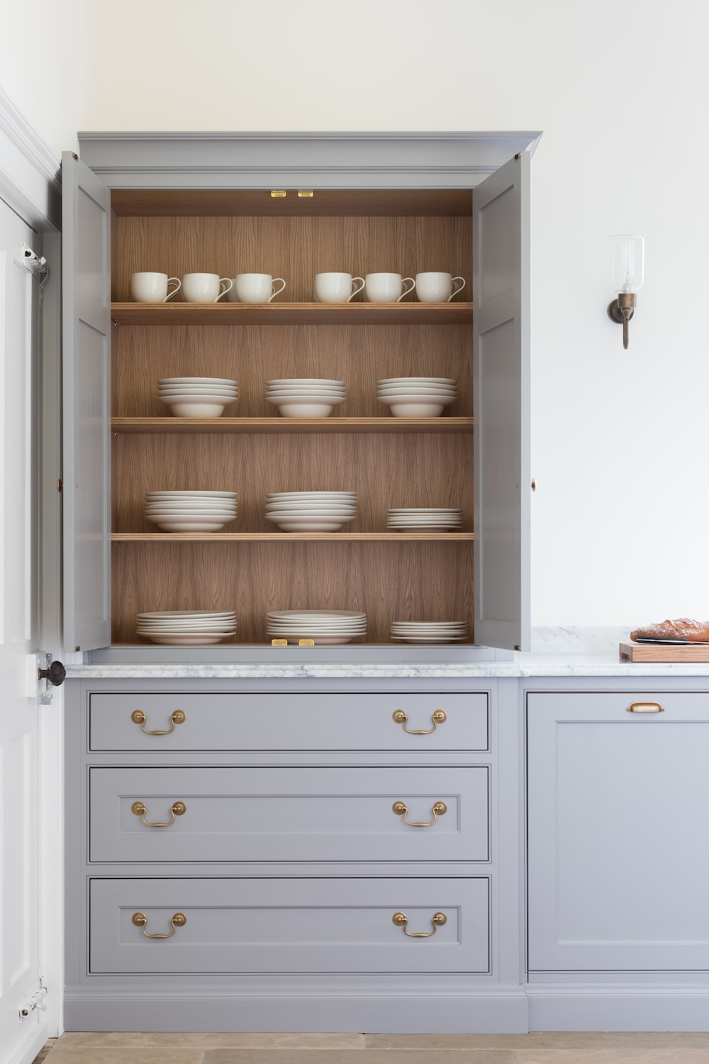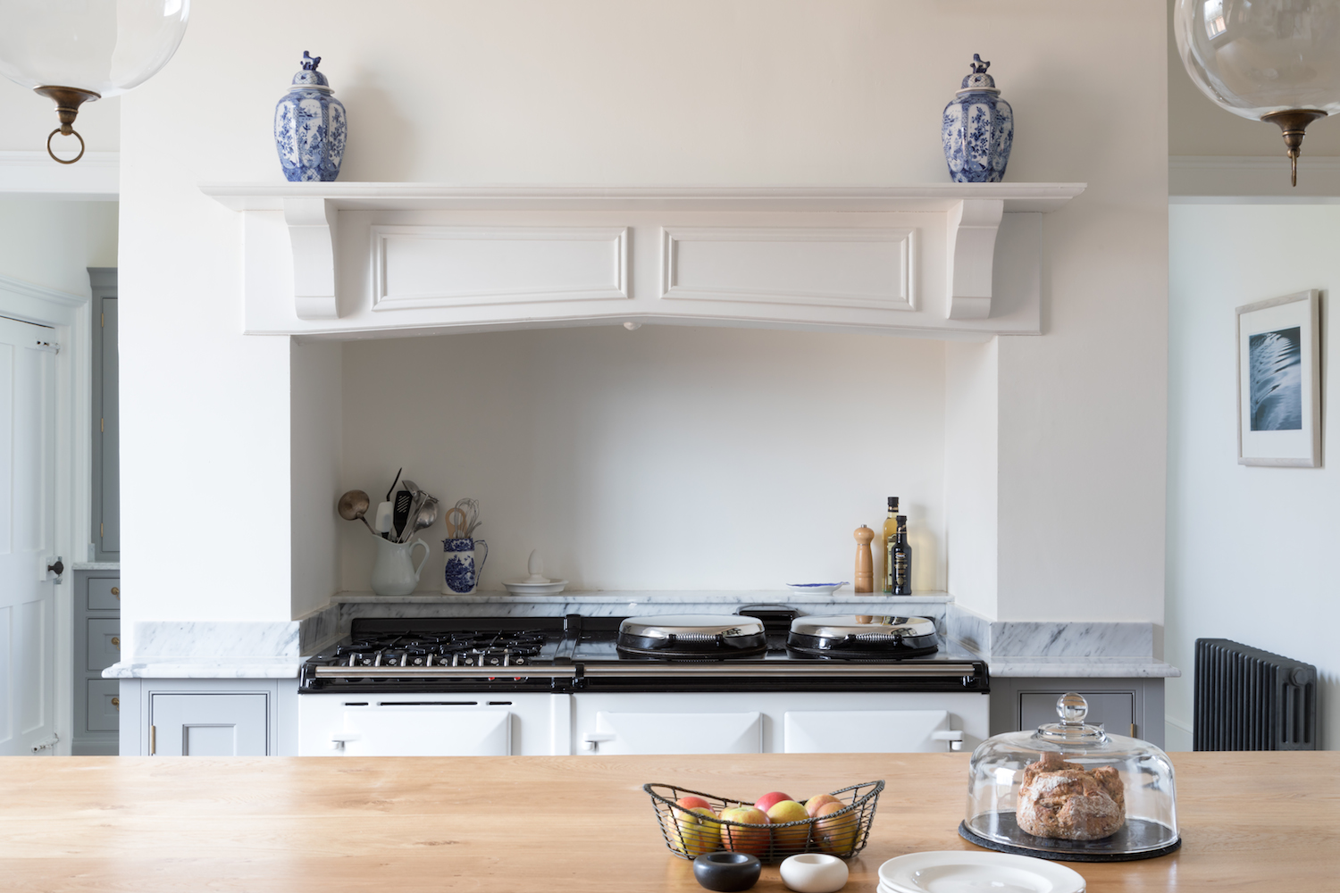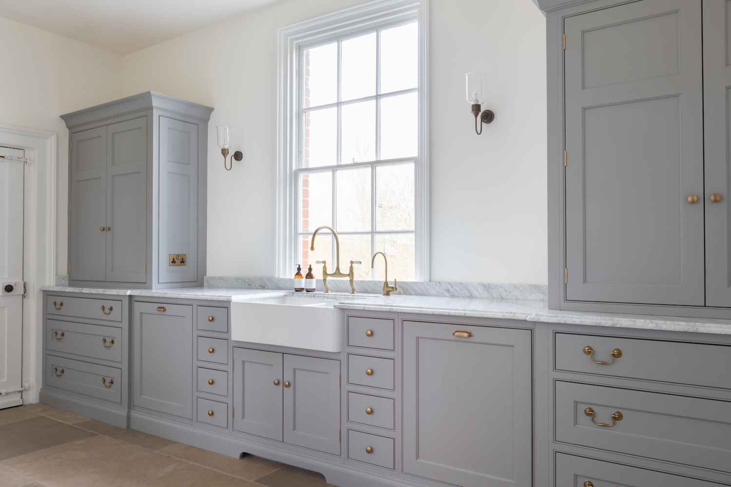 Georgian Hunting Lodge | Before & After Published: 01-10-2017 It’s always a wonderful feeling to see a space transformed and the kitchen at the Georgian Hunting Lodge project is no different. When it came to the interior design of this project, it was immediately obvious that the homeowners of this beautiful historic house had an incredible eye for balance and harmony and they were keen to restore some of the former glory to this Georgian family home. The initial design meetings highlighted a shared love of the English country-house aesthetic so we focused on creating a series of spaces that would give this home a kitchen it deserved. This is the before photograph above. The oil-fuelled AGA was housed in a chimney with doorways on either side leading to a larger utility / scullery room. The corner under the stairs had more cabinetry with a gas hob and a small sink area. The white doorway on the left opens into a larder comprising floor to ceiling shelving while the white doorway on the right leads onto the hallway. And this is the after photograph. Structurally speaking, the alterations to this space were minimal but the doorways either side of the chimney were opened up in order to connect both sides of the room and create a cohesive design that performed from a functionality point of view. Purely from an aesthetics point of view, incorporating furniture that reflected the scale and proportion of the room had the greatest impact. This photograph above captures the view as you enter the kitchen from the back door so you can see the focal point of the space is still the original chimney but the eye is then drawn across to the walk in pantry. Painted in our bespoke Top Hat colour, the height of the ceilings is emphasised with the Georgian style glazed screens and door that partition the walk in pantry off the main kitchen. The Nickeby prep table meanwhile sits quietly in the foreground – perfectly proportional to the room and providing a wealth of prep space – something the previous kitchen really lacked. The original oil AGA was replaced with a dual control electric AGA with a gas module positioned to the left and cupboard doors either side in the chimney itself. A shelf at the back of the AGA provides a convenient place to store cooking oils and condiments. Looking across from the AGA towards the walk in pantry, you can see in the photograph above that the artisan shelves on the back wall make maximum use of this under-the-stairs space. As with any self-respecting walk in pantry, there is a plethora of storage options and countertop space and this particular example also boasts a prep sink making it a really great space for baking prep. What’s interesting about this space is that aside from opening up the doorways either side of the chimney, the design of the space uses what is already there and simply maximises it at every turn. Positioning this sink under the window was a fairly straightforward design choice but when you look closer at the detail of this walk in pantry the choice of colours (Farthing on the shelves and cabinetry) and hardware (aged brass for the tap and cabinetry handles), even the finish on the worktop (ogee edge) – all blend together to create a space that celebrates the relaxed and welcoming English country house style that we love at HM. If you were to step into a kitchen in the Georgian era, one of the most striking differences to our modern ways is that there would be no sink or washing up area. The washing of pots and pans and tableware was all done in the scullery which was almost always housed nearby in a completely separate room. The kitchen was reserved for cooking and cooking alone. Given the heritage of this home, it made sense therefore to create a proper scullery run the other side of the chimney which you can just see in the image above. One of the main characteristics of the scullery is a big butler sink with space either side for drying tableware and plenty of cupboards for storing it when not in use. This scullery runs balances old and new perfectly: the overall aesthetic reflects the symmetry, simplicity and proportion of the historic Georgian design values, but with the modern convenience of incorporating an integrated Miele dishwasher and pull out Eurocargo bin behind the Nickleby cabinetry. Countertop cupboards at either end offer masses of storage for tableware and crockery that can be easily put away and stored once they are clean. It’s incredible to look at the space now – especially if you scroll up for a reminder of what it used to be… Image credit – Paul Craig. Share this article Copy this link https://www.humphreymunson.co.uk/georgian-hunting-lodge/ Share Copy link Previous Article Chicken Mulligatawny Soup Next Article Wolf Bake Stone Kit | Perfect Pizza!