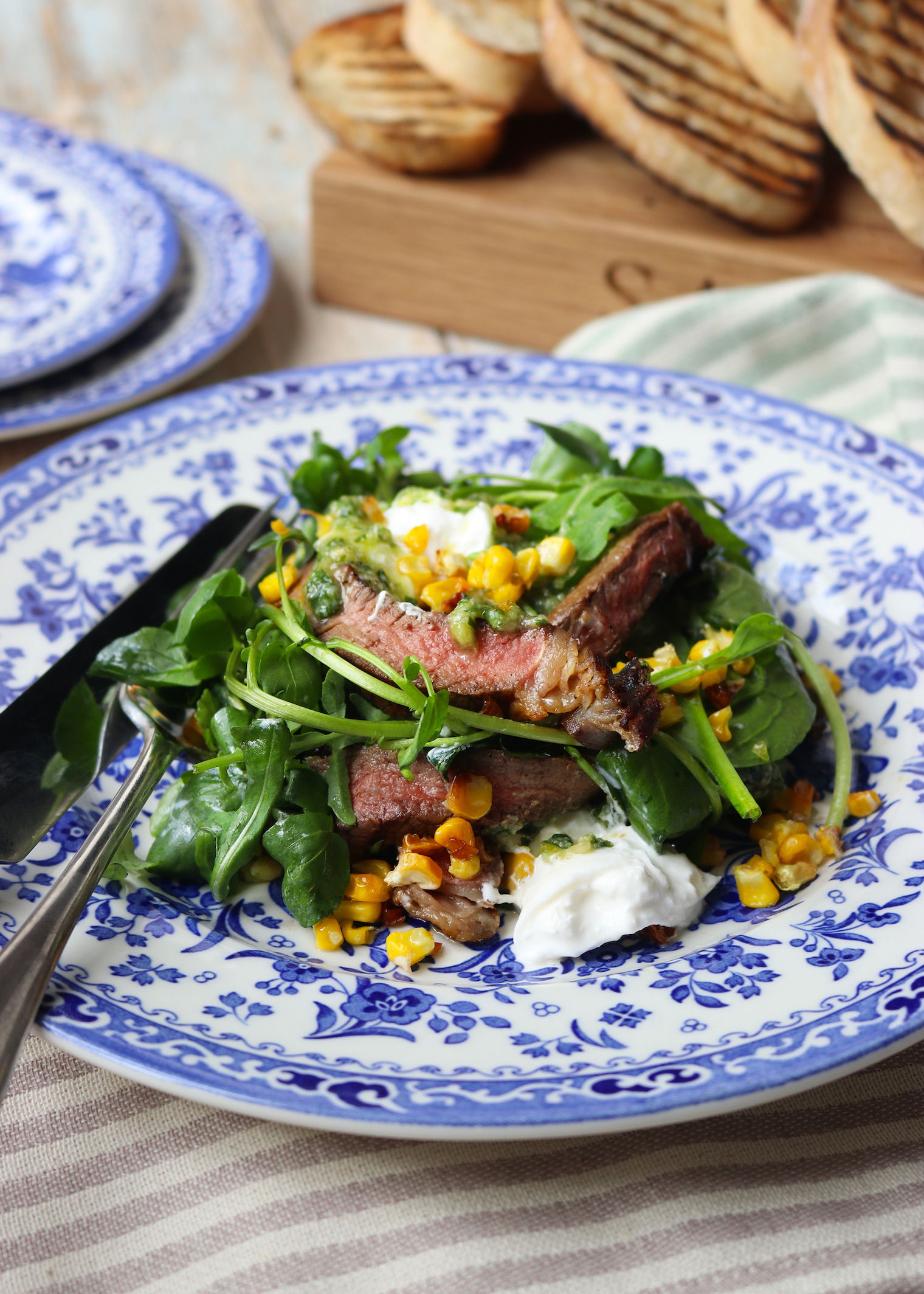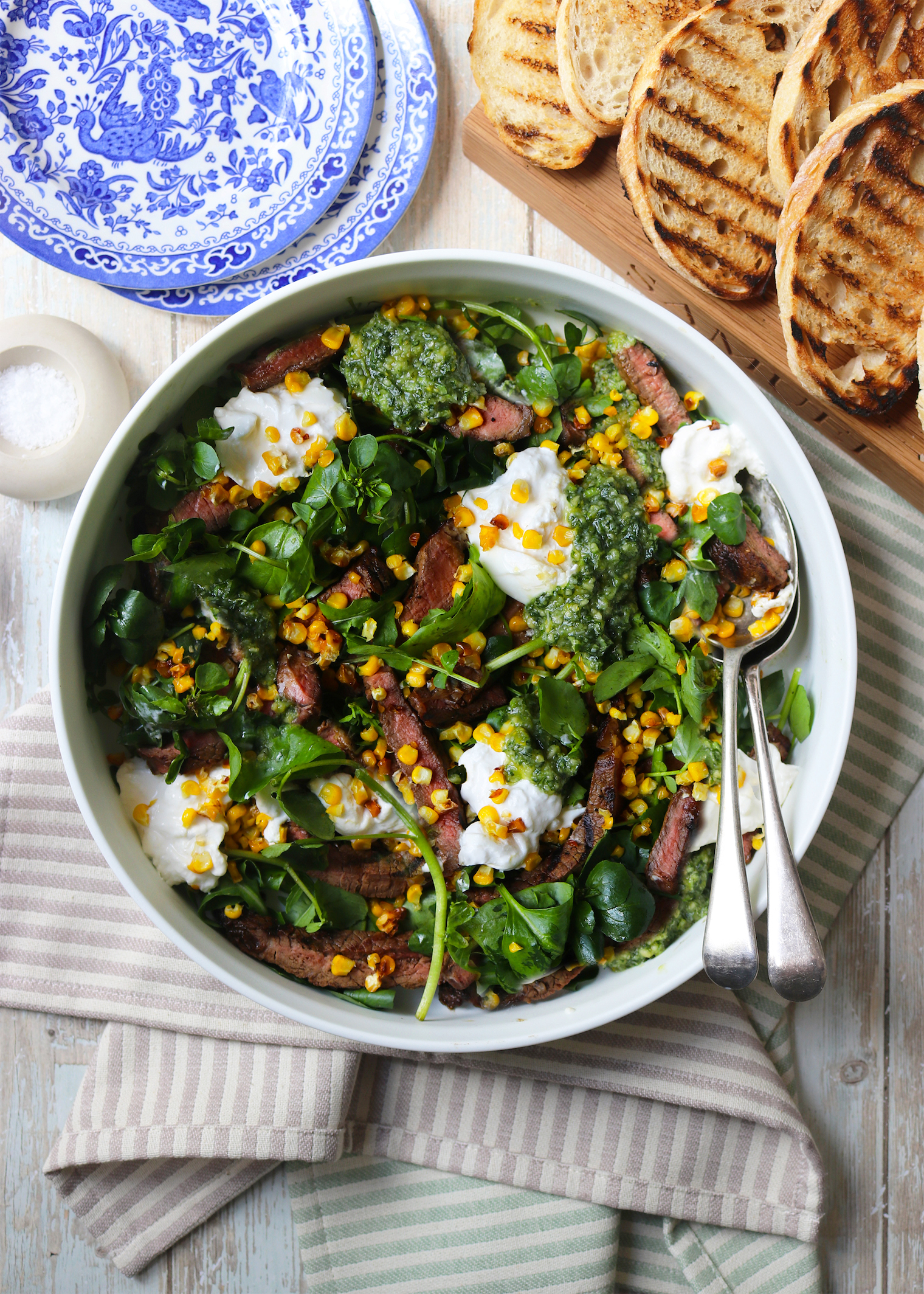 Grilled Steak Salad with Pesto and Burrata Published: 23-06-2024 The marinade for this steak is unreal and provides a sweet, salty umami that works so well with the homemade pesto, creamy burrata, sweetcorn and peppery salad. A winning dish that can be enjoyed by two for dinner or for four as the perfect lunch in the sunshine. The beauty of this recipe is that it can be cooked indoors, if the weather is being unpredictable… INGREDIENTS 2 Rump steaks (or another steak if you prefer!) 2 Balls burrata 4 ears of corn 1 bag of fresh salad leaves – we used watercress and rocket Fresh bread to serve MARINATE INGREDIENTS 2 large garlic cloves 4 tbsp olive oil 4 tbsp honey 2 tbsp dark soy sauce 2 tbsp red wine vinegar A good few cracks of black pepper PESTO INGREDIENTS 40g fresh basil Zest of 1 lemon 80g pine nuts 1 garlic clove 8 tbsp olive oil METHOD Whisk together the marinade ingredients and pour over the steak. Cover and let it marinade for a minimum of 30 minutes. Whilst the steak is marinating, turn the oven on at 200°c fan. Slice the corn from the cob and spread evenly onto an oven tray. Drizzle with a little olive oil and a pinch of salt. Place in the oven for 20 minutes, checking after 10 minutes to turn the kernels. You want some of them to be lightly browned, not burnt, so depending on your oven, they may be done sooner. Whilst the corn is cooking, pre-heat your grill and make the pesto. First blend the pine nuts, lemon zest, garlic and oil. Once blitzed, add the basil and parmesan until finely chopped. Add salt and pepper to taste. The corn should be about halfway so it’s time to cook the steak. Using tongs, remove the steak from the marinade and cook for 2 minutes per side on high heat. The steaks will go quite dark in colour, but don’t panic, this is due to the marinade and will add to the flavour. If of course, you prefer your steak well done, cook for a minute longer on each side. Transfer the steaks to a cutting board and let rest for at least 4 minutes before thinly slicing. Cover the base of your chosen dish with the salad leaves, and slices of steak, tear and arrange pieces of burrata, sprinkle over the corn and add spoons of pesto before serving. Serving suggestion: We used the seasoned griddle pan to toast pieces of fresh bread. It gave it such a lovely flavour and was so delicious with the salad. Images: HM Share this article Copy this link https://www.humphreymunson.co.uk/grilled-steak-salad-with-pesto-and-burrata/ Share Copy link Previous Article Grilled Peach and Burrata salad with Basil and Mint Vinaigrette Next Article Summer Sparkler | Mirabeau Spritz