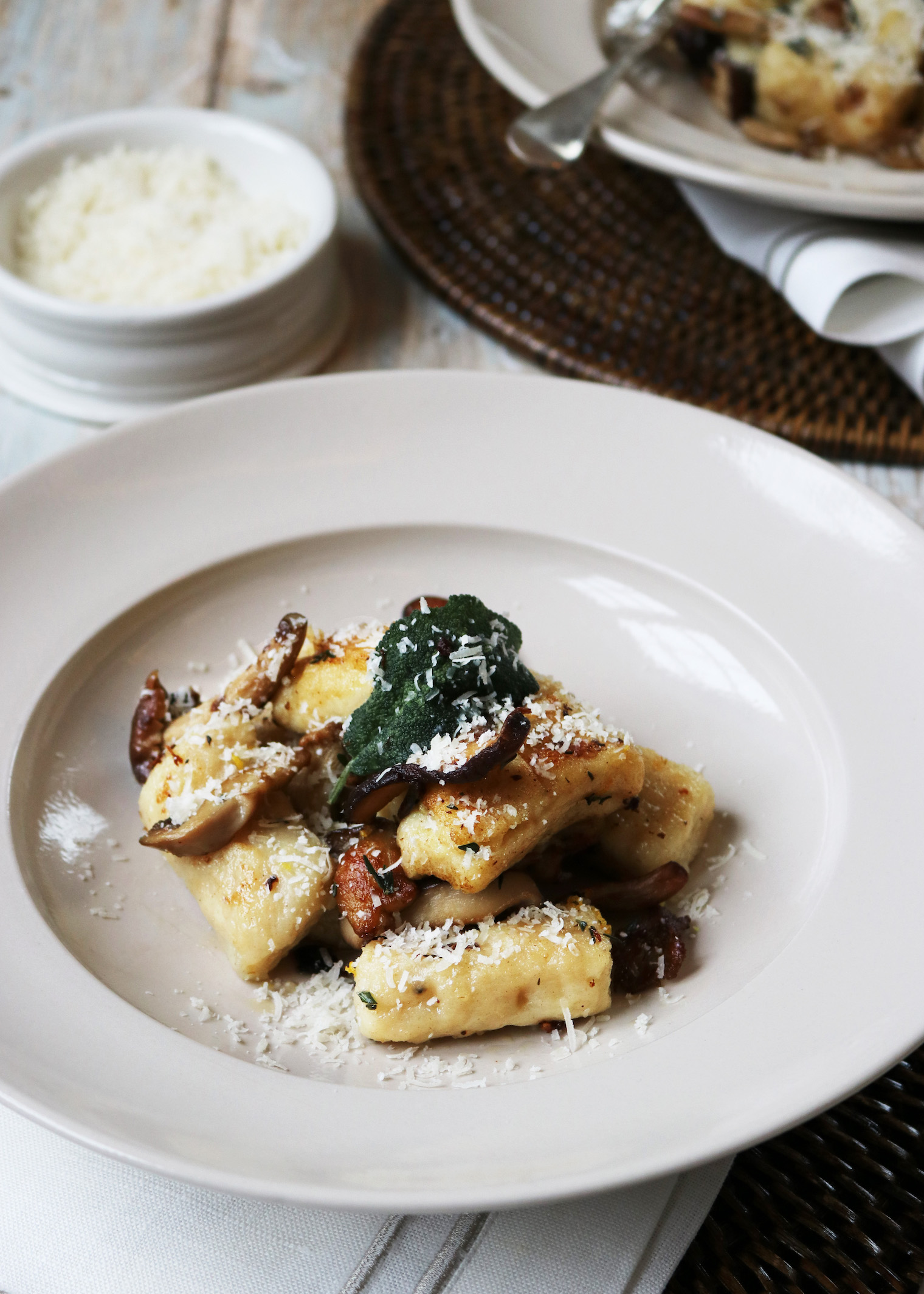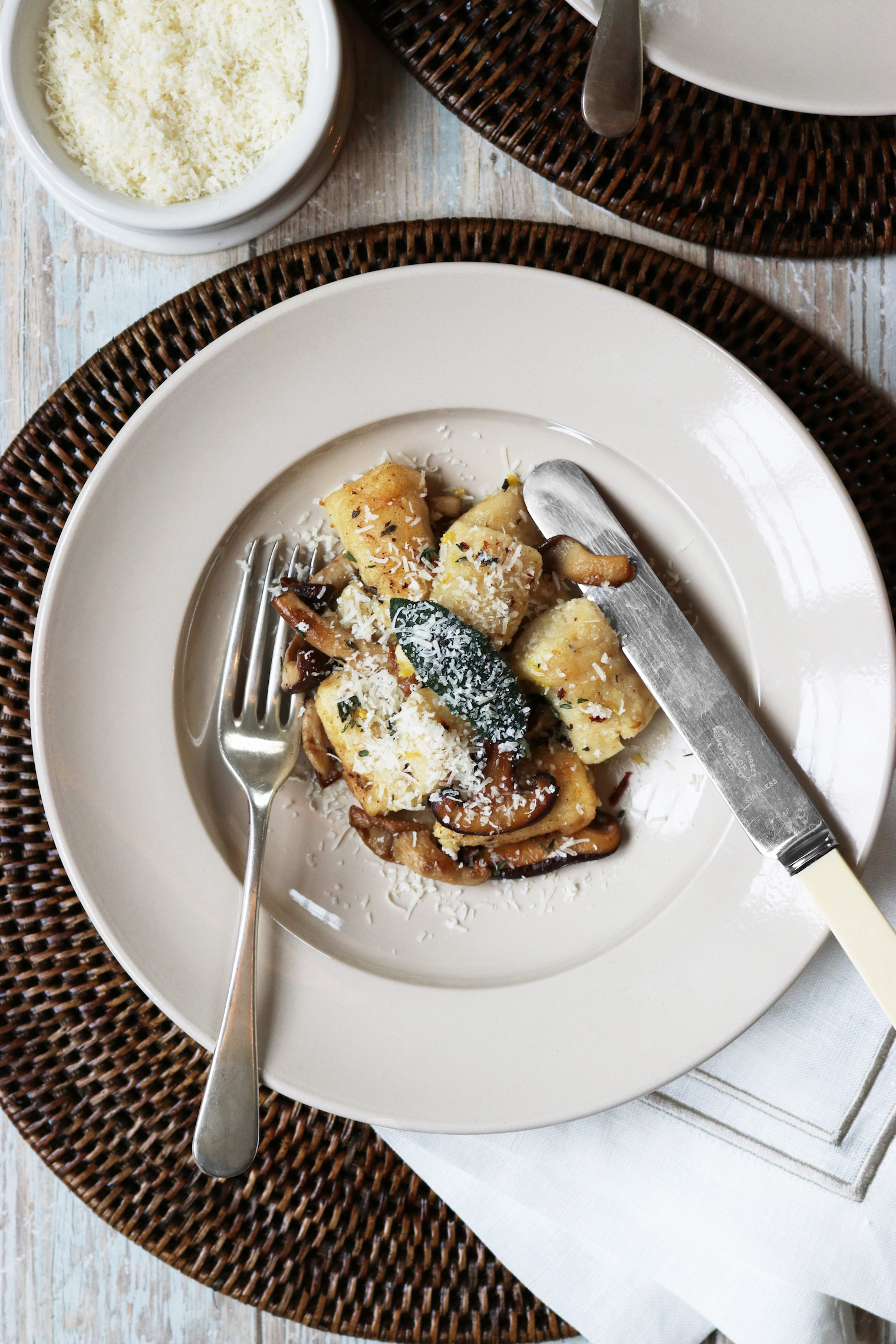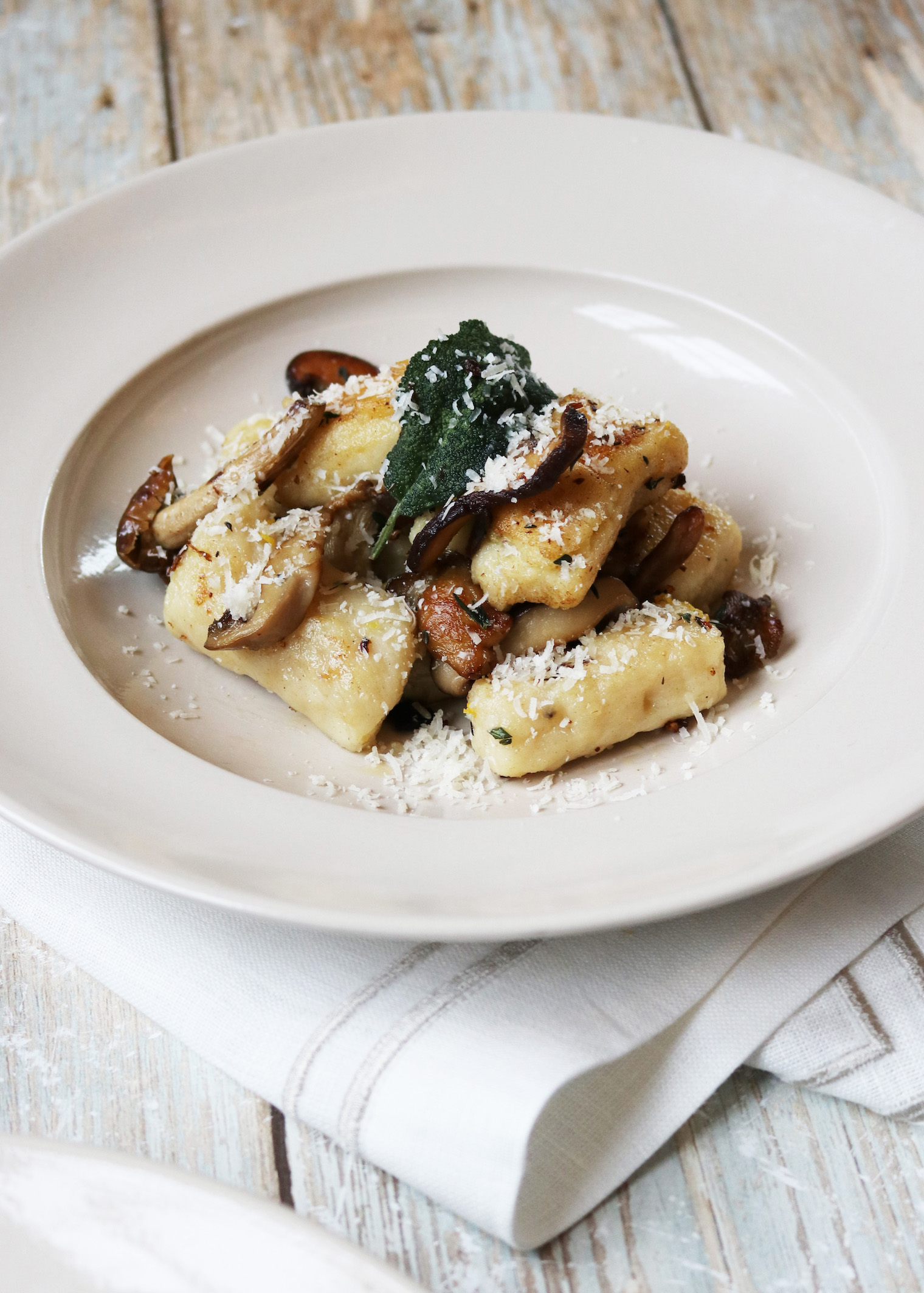 Herby wild Mushroom Homemade Gnocchi Published: 22-03-2025 Homemade gnocchi might seem a little daunting at first, however, once you’ve tasted these soft pillowy delights and seen how easy they are to make you’ll never look back. This pasta alternative is incredibly versatile and can be made in advance, which is perfect for impressing guests. The type of potato you use plays a crucial role in the texture and flavour of your gnocchi. For the best results, opt for floury varieties like Desiree, King Edward, Maris Piper, Russet, or Vivaldi, which yield a light and fluffy consistency. Once you’ve mastered the basics, experimenting with different flavours – like spinach, pumpkin, or even truffle – makes it even more fun. INGREDIENTS Gnocchi 600g floury potatoes 2 large eggs, beaten 200g plain flour, but keep extra to hand, you may need a little more or less, depending on the texture of the potatoes Sea salt Toppings 2 packs of wild mushrooms 1 lemon 50g parmesan 6 sage leaves 100g salted butter (you may not need it all, but it’s good to be prepared!) METHOD Cook the potatoes by lowering them into a pan of salted boiling water with their skins on. Simmer for 15-25 minutes until just soft (the time will depend on the size of your potatoes). Test with a sharp knife – you should have to push the knife in, it should not slide in too easily, otherwise the potatoes will be overcooked and mushy and will have absorbed too much water. Peel them as quickly as you can. The cooler they get, the less fluffy they will become. The potatoes will be super hot, hold them in a tea towel to peel off the skins to avoid burning your hands. Using a potato ricer (or mouli if you have one), cut the potatoes into manageable pieces and pass them through the ricer and into a large bowl. If your ricer has larger holes, you may need to pass the potato through twice to get the right texture. Make a well in your pile of potatoes, then pour in the egg and sprinkle over some of the flour. Start to blend everything with your hands, adding more flour but as little as you can get away with, you want the flavour of the potato to remain. Combine the dough as carefully and quickly as you can, the more you handle the dough, the harder it will become. Try to use the same lightness you would for pastry. You should now have a soft dough that holds together, doesn’t feel sticky and can be easily shaped. Divide the dough into 3 equal pieces. Begin by rolling a piece at a time into long, thumb-nail thick cylinders on a lightly floured surface, again working lightly and quickly. As you roll, you will also be gently stretching the dough. Keep the surface well-floured as you want to avoid the gnocchi sticking to the surface. Cut the dough into thumbnail long lengths. Cut the first to the length you’re happy with, then use that as your control sample. You can cook them as they are, or if you have a little more time, you can shape them with hollows on one side, allowing sauce to cling better. We left ours chunky, but here’s some tips if you’d like to shape yours: Roll the gnocchi in a little flour. Holding them very lightly, form each into a small concave, hold them against the prongs of the back of a fork, pressing just firmly enough to get the imprint (not so firmly that they go through the prongs), then guide each one so it tumbles away from the fork. Use your thumb as a guide and your fingers to pick and curl the gnocchi up. Spread them on a large board until required. Fill a pan with salted water, a good amount of salt is needed as it will help to give the gnocchi flavour. Whilst the water warms up, place 50g of butter into a low frying pan with three large gloves of whole garlic lightly crushed down with a knife. Warm the pan until the butter simmers slightly, and add the wild mushrooms and a tsp of fresh thyme. Keep stirring until the mushrooms are nicely browned, add salt and pepper to taste, then either remove from the pan and set aside in a pre-warmed bowl for a few minutes. Keep the pan on a very low heat Turning our attention back to the gnocchi, add the gnocchi to the boiling water and cook for after 30 seconds -1 minute, depending on their size. You want them to be just cooked. If the mushroom pan is looking a little dry, add another large knob of butter and 5-6 sage leaves and gently removed the gnocchi from the water with a slotted spoon – they will be delicate so be a little gentle with them – place into the warm buttered pan, once all in, keep the gnocchi moving so it doesn’t stick and turn to ensure both sides are slightly browned. Add the mushrooms back in and a good sprinkle of lemon zest and more salt to taste. Serve with a good squeeze of fresh lemon and a very generous amount of freshly grated parmesan. Serve as it is or as a side to roasted chicken or on its own with fresh garlic sourdough bread. Top tip: add fresh herbs or cheese to the gnocchi for a different flavour. Images by HM Stoneware Bowls and Large Pinch Pot by John Julian Placemats and Napkins by Rebecca Udall Share this article Copy this link https://www.humphreymunson.co.uk/herby-wild-mushroom-homemade-gnocchi/ Share Copy link Previous Article Q&A with Collier Webb’s Managing Director, Danielle Collier Next Article at home drinks bar