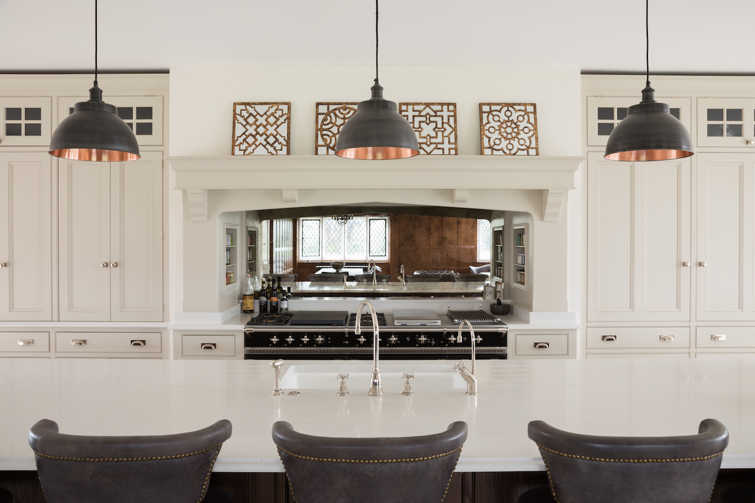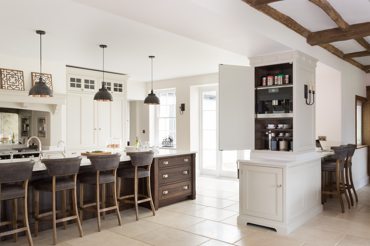 Kitchen Confidential | Tudor Manor House Published: 31-03-2018 The Tudor Manor house project was a dramatic and at times incredibly difficult project for its new owners. The incredible grade II listed property in Kent has worn many hats in it’s impressive 500 years including offices and a wedding venue. The kitchen was originally four smaller less useable rooms. The clients and architectural team worked to re-arrange the space with the result being a large open plan kitchen with space for a 10 seater dining table, soft seating area and a hidden walk-in pantry behind the main kitchen. In all, a space that would have been otherwise difficult to negotiate has been transformed into the perfect family home. The focal point to this space is the large false chimney and Lacanche Belmont Range cooker in Anthracite which is positioned centrally to ensure the space retains symmetry and balance. The Lacanche has an amazing array of hob options including gas burners, a simmer plate, electric plancha and indoor grill plate. Directly opposite is the behemoth island which quite simply enormous by anyones standard but is completely at home and in proportion to the space in which it resides here. Finished in the classic HM Portobello dark oak it suits the aesthetic and heritage of the family home and hides a wealth of storage including and appliances. The Island is designed to be the main prep area of the kitchen with the main sink located centrally across from the Lacanche making this a useable and easy space by zoning all important areas there is no need to walk across the kitchen with pans when the sink is nearby. Hidden in the longford cabinetry in the island are two eurocargo pull out bins and two Fisher & Paykel fridge freezer drawers at either end on the opposite side. To the right of the Lacanche are two Sub-Zero integrated fridges with fridge/ freezer drawers below, chosen by the clients for their reliability and precision the Sub-Zero’s with a busy family of 5 and entertaining is essential. To the left of the Lacanche is a large countertop appliance cupboard with an integrated Miele microwave and plenty of useable space below for storing pans, servingware and other large kitchen items like a KitchenAid. Sitting proudly between the kitchen and the dining/ living area are two peninsulas. The family have found these additional spaces incredibly useful for everyday living for example, one is used as a desk area which is perfect for children to catch up on homework and also conveniently houses a Miele coffee machine in a cupboard built into the pillar along with additional space for cups, coffee etc. The other peninsula is used as a scullery area with two dishwashers, a sink and a crockery cupboard all in one tidy space to aid with clearing up after dinner. The perimeter cabinetry of the kitchen has been finished in Lapel to contract perfectly with the dark portobello oak. The light quartz worktop is not only a strong logical choice for a family kitchen but offers a clean and fresh feel to the space. Hidden behind the main kitchen is the all important walk-in pantry which was originally a lean-to addition to the property which was altered to create the walk through pantry with a glazed door at each end. A sink space was incorporated into the worktop along with plenty of countertop space so it can also be used for baking or preparing cake mixtures etc. With artisan shelves running the full of the pantry, a Portobello oak ladder has been made for aiding in reaching the hard to reach higher shelves. As the main storage area for dry goods it had to be accessible and easy to maintain. Share this article Copy this link https://www.humphreymunson.co.uk/kitchen-confidential-tudor-manor-house/ Share Copy link Previous Article Recipe Notes | Chicken Biryani Recipe Next Article 6 Stands to Visit | Pimlico Road Farmers Market