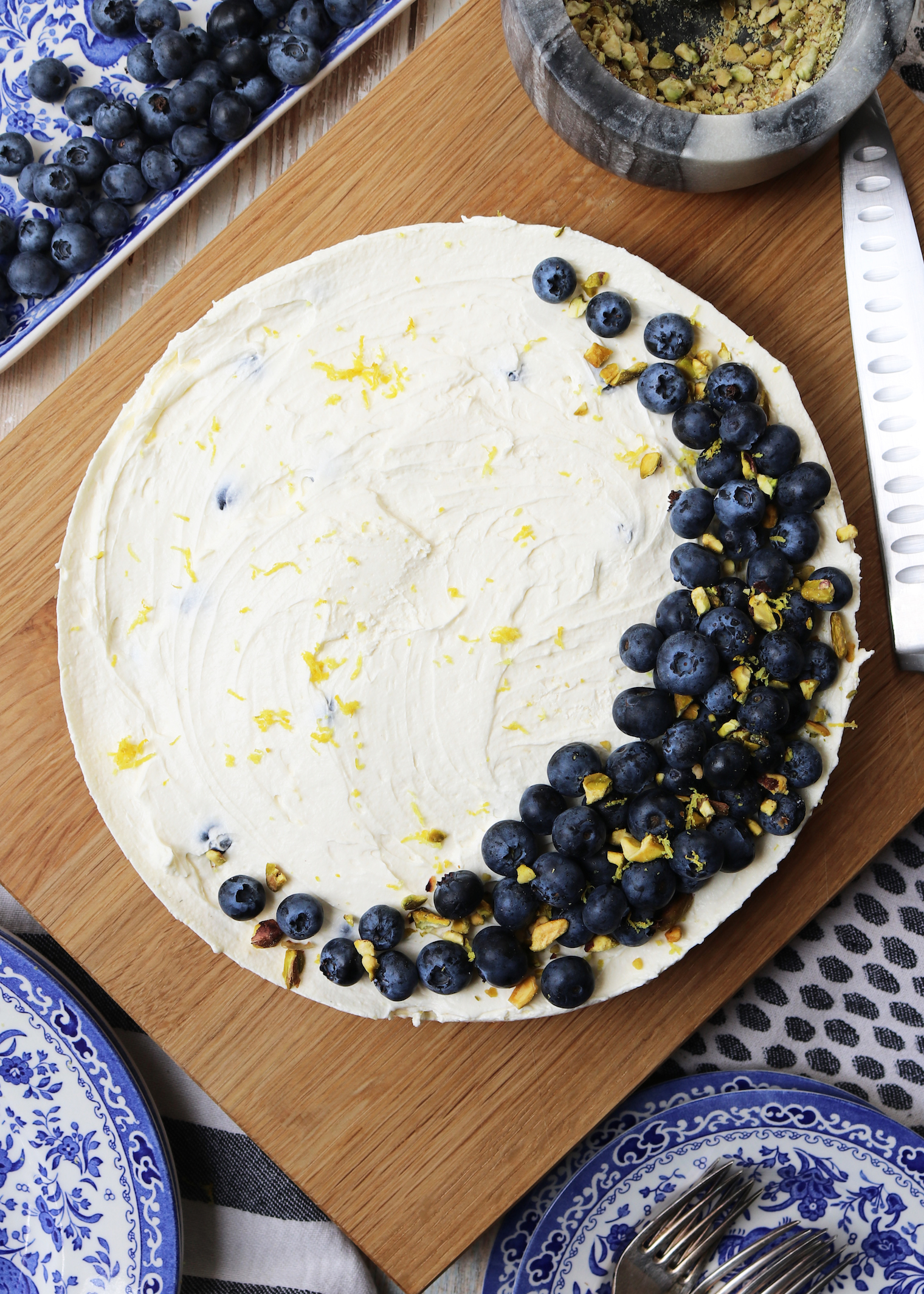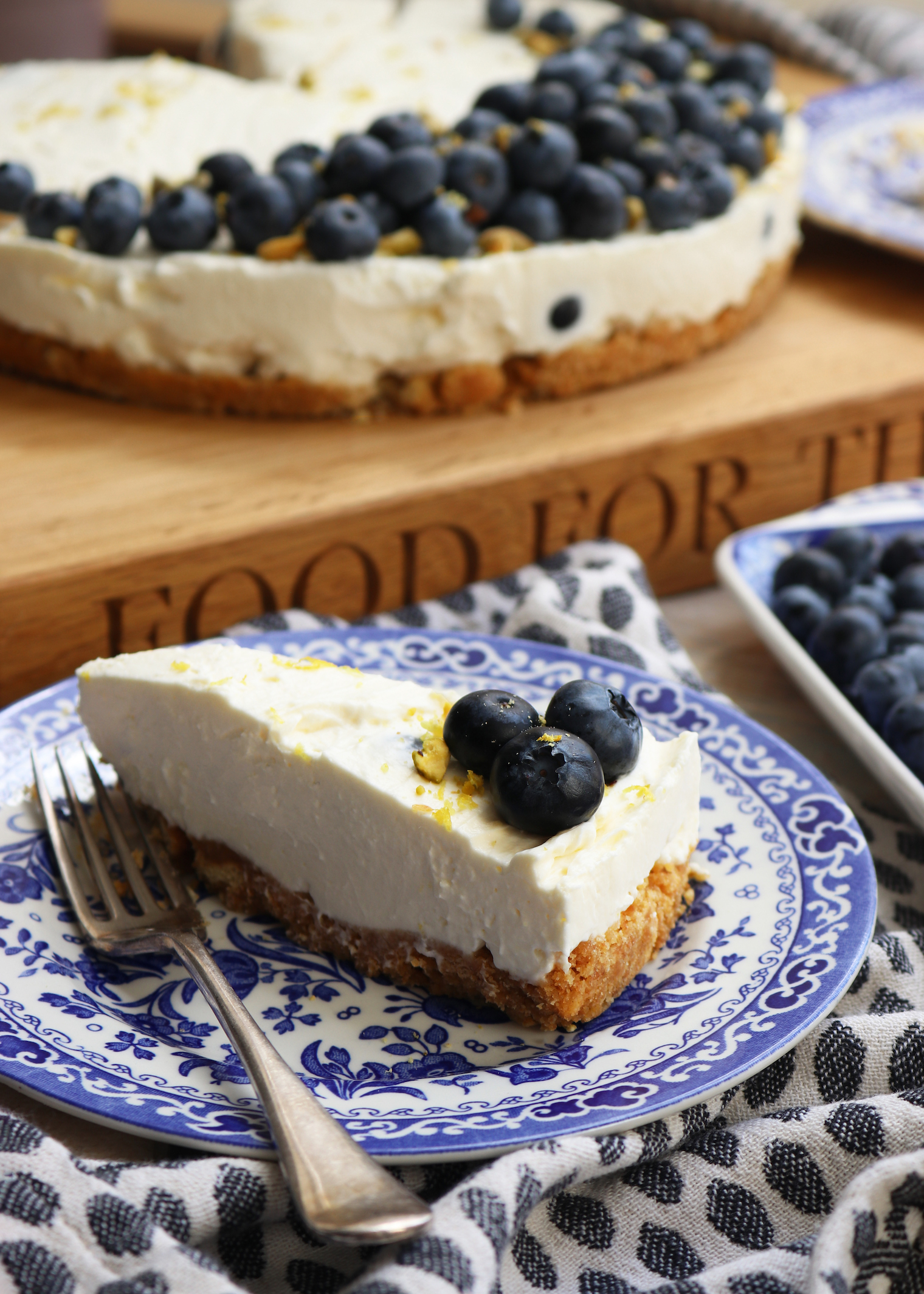 Lemon and Blueberry Cheesecake | The No-Bake Showstopper Published: 10-09-2023 This cheesecake is fresh in taste, light in texture and super easy to make. A maximum of 20 minutes to prepare and serving 12 generous portions, this is a quick recipe that definitely offers the wow-factor and doesn’t just need to be reserved for summer guests – it works all year round. Ingredients 260g digestive biscuits 110g butter, melted (we use salted to balance out the sweetness) 600g cream cheese 300ml double cream 120g icing sugar 300g blueberries 1 lemon, zested and juiced Method Before you begin, lightly butter and line a 25cm spring form or loose bottomed tin with baking paper, if you have a 23cm tin this will work just as well. Place the digestives into a food processor and blitz until the biscuits are crushed into crumbs (we left ours quite chunky). If you prefer a more traditional approach, put the digestives into a food bag, zip tight and and crush using a rolling pin. Pour the crumbs into a bowl and mix in the melted butter until all crumbs are completely coated. Empty the bowl into the lined tin and press down firmly with a metal spoon pushing out from the centre, until you have an even layer. Chill for a minimum of 15 minutes in the fridge whilst you prepare the topping. To make the creamy topping, combine the cream cheese, double cream, icing sugar and half of the lemon zest in a bowl. Whisk until the mixture becomes a thick consistency with very little wobble (we used a KitchenAid electric mixer but an electric hand-whisk works just as well), pour in the freshly squeezed lemon juice and mix again until fully combined. Gently fold in the blueberries being careful not to squash them if possible and spoon the mixture onto the chilled biscuit base, firmly spread out the mixture to remove any air bubbles and smooth out where necessary, don’t worry, it doesn’t need to look perfect! Leave to set in the fridge for 2-3 hours or overnight. Once set, remove from the fridge and let it sit for at least 10 minutes before removing from the tin. For a spring form tin, you may need to run a knife around the edge of the cheesecake to loosen and for a loose bottom tin, place a can underneath before gently pulling the sides of the tin down. Slow and steady wins the race with this. Carefully slip the cheesecake onto a serving plate of choice, removing the paper and metal base. To decorate, form a semi-circle with the remaining blueberries before sprinkling over crushed pistachios and the remaining lemon zest (be sure the do this from a height to try and avoid clumps of lemon). If you aren’t a huge fan of blueberries, raspberries and blackberries work just as well. Tableware by Burleigh Pottery Napkins by Tori Murphy Chopping board by Humphrey Munson Images: HM Share this article Copy this link https://www.humphreymunson.co.uk/lemon-and-blueberry-cheesecake-the-no-bake-showstopper/ Share Copy link Previous Article The Art of Collaboration | Burleigh x Barneby Gates Next Article La Cornue in London