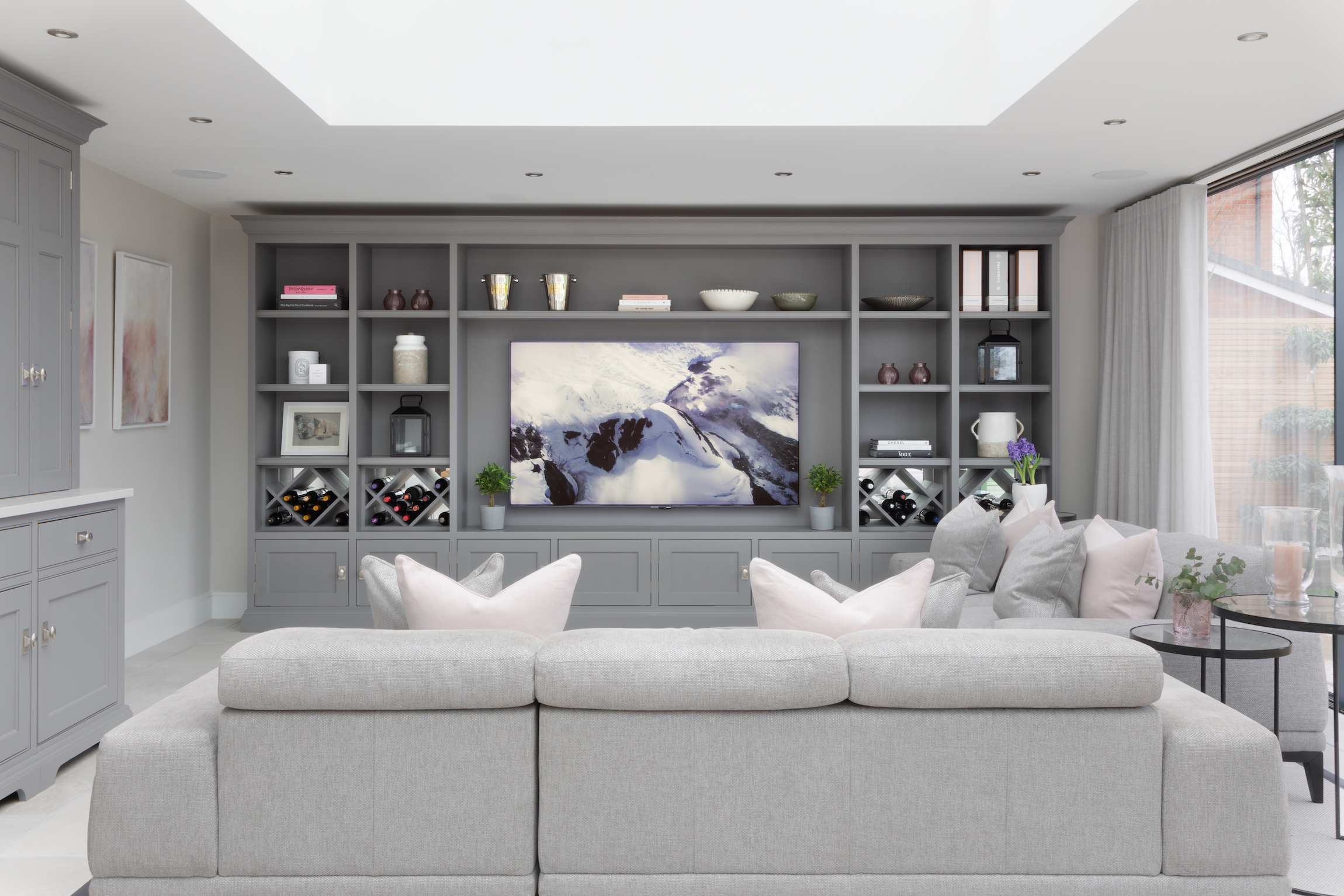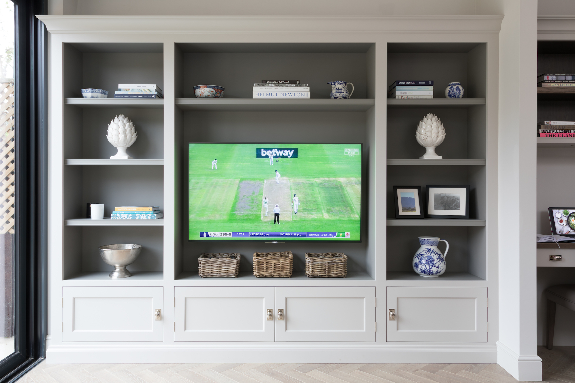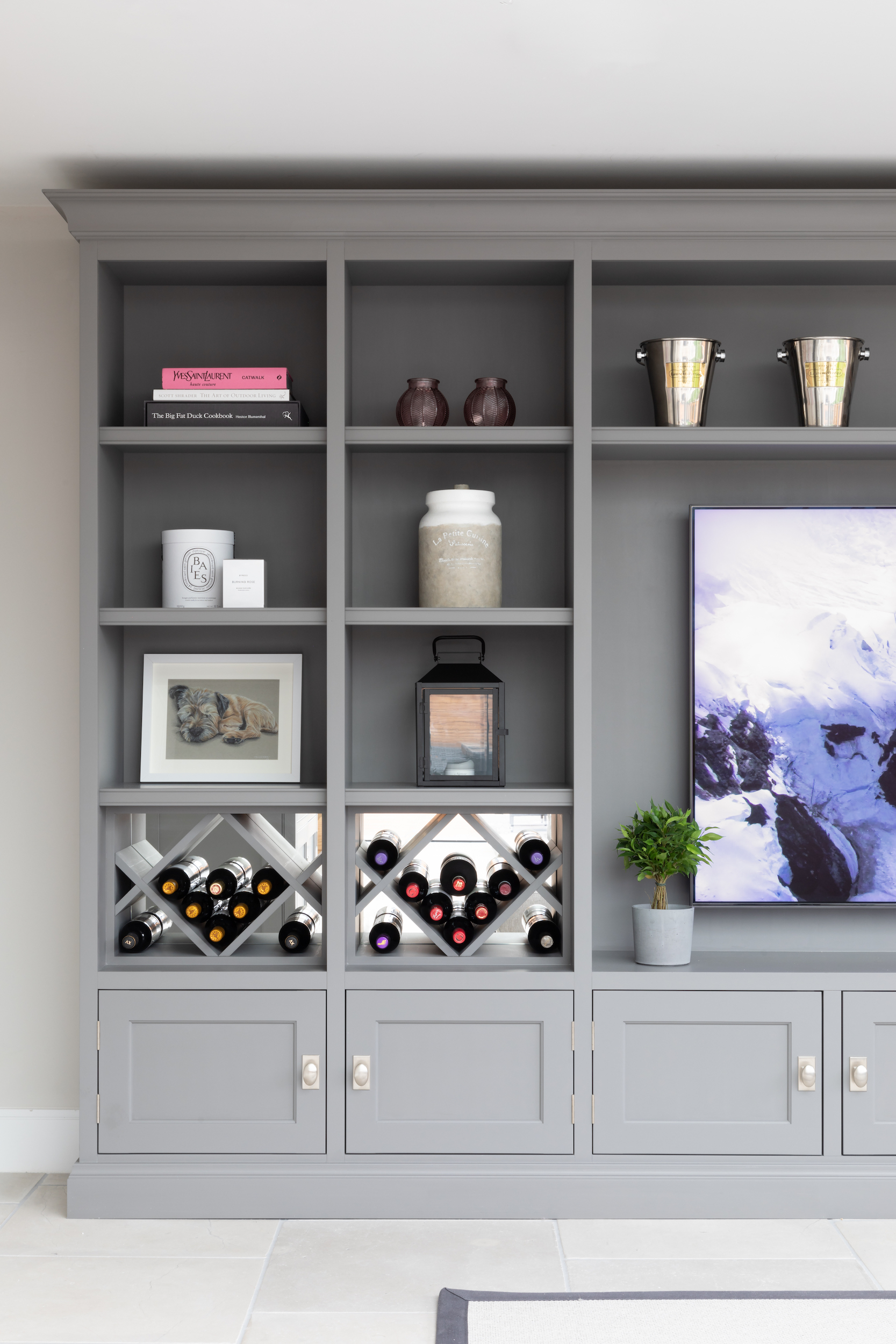 Media Cabinetry | Design Tips Published: 16-12-2020 Media cabinetry can be so much more than just a stand for your new 8K smart TV. It can be a stunning piece of useful furniture than not only houses a television, but books, vases, pictures, wine (yes wine!) and even games consoles etc, all in one beautifully designed space. Media cabinetry is quickly becoming an ever popular request in both larger open plan living spaces and cosy living rooms. We love what a well designed media cabinetry piece of furniture can bring to a room, here are a few reasons why… When we design media cabinetry there’s two things that determine the overall size. The first is the size of the television (and sound bar etc) and the second is the space available. The reason for this is proportion. You’ll notice in the image above (which is the Worcestershire project), the shelf heights are all aligned and are also the same height as the cupboards beneath. Keeping these storage spaces that surround the TV uniform, means this (usually very large) piece of cabinetry is well balanced and looks like it belongs perfectly in the space. Made using traditional joinery techniques, this media cabinetry at the Worcestershire project is finished in the HM paint colour ‘Farthing II’ the same as the nearby drinks cabinetry and also the kitchen island to maintain a sense of flow and continuity. Closed cupboards designed beneath the open shelving provide a place to conceal games consoles, internet hubs, DVD’s, remotes and other items you may not necessarily want on display. Perfect for an open open plan kitchen, dining and living space such as the North London project pictured above. Usually painted, media cabinetry looks particularly incredible with a lighter painted exterior and darker interior and this helps to conceal the television when it’s turned off. The cupboards below open to reveal a Berkeley oak finish, the same as the interior cabinetry specified throughout the kitchen. Another element worth considering to include in the design is wine/ drinks storage. Now more than ever, evenings at home have become the norm whether you are looking to entertain a small group or enjoy a new movie with the family, so why not include additional wine storage with a mirror back for a touch of glamour. To find out more about media cabinetry or to make a kitchen enquiry call us on 013721 821300 or email us at info@humphreymunson.co.uk. Share this article Copy this link https://www.humphreymunson.co.uk/media-cabinetry-design-tips/ Share Copy link Previous Article Burford Limestone Weathered | Indoor + Outdoor Flooring Next Article Dining Room | Design Tips