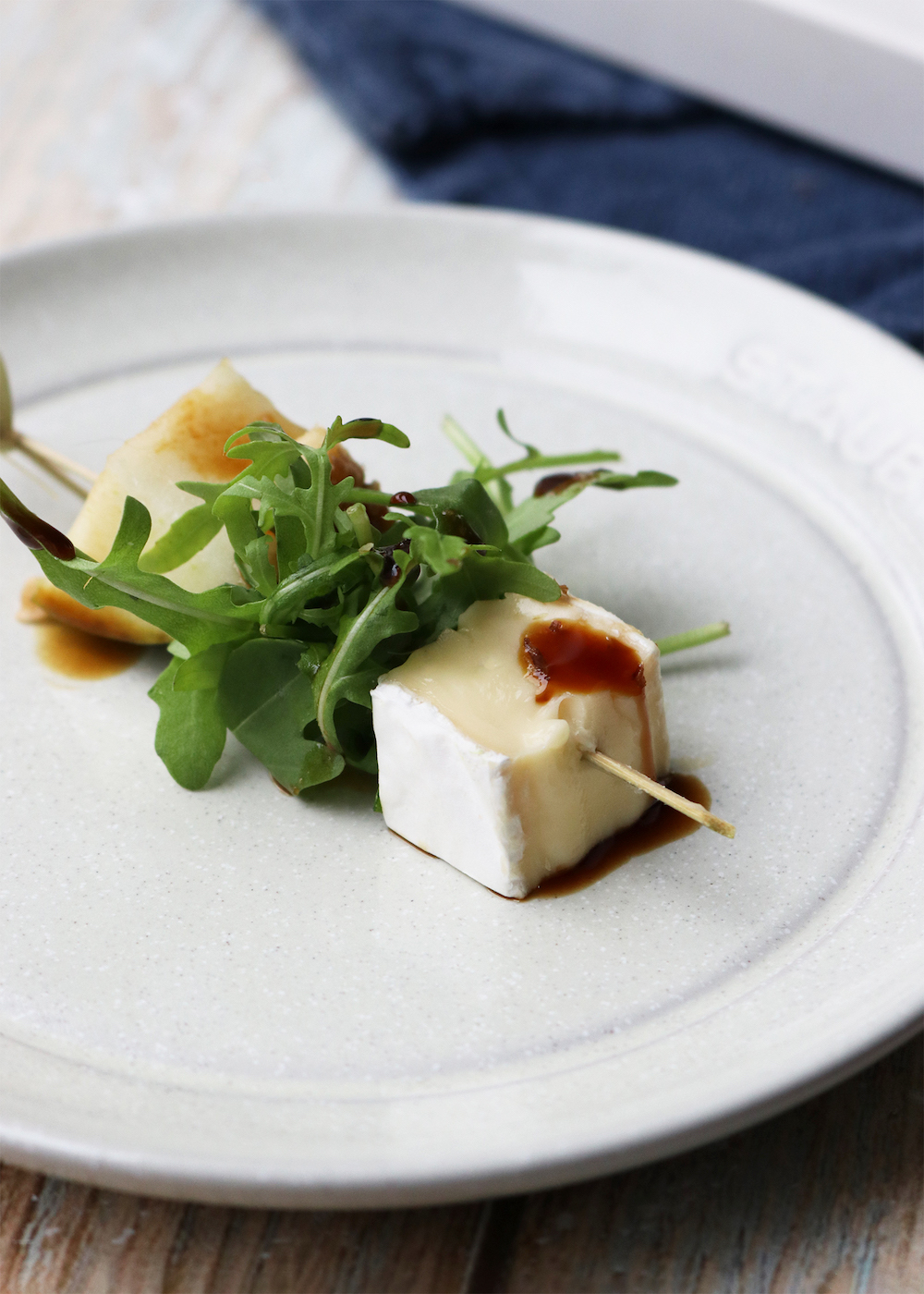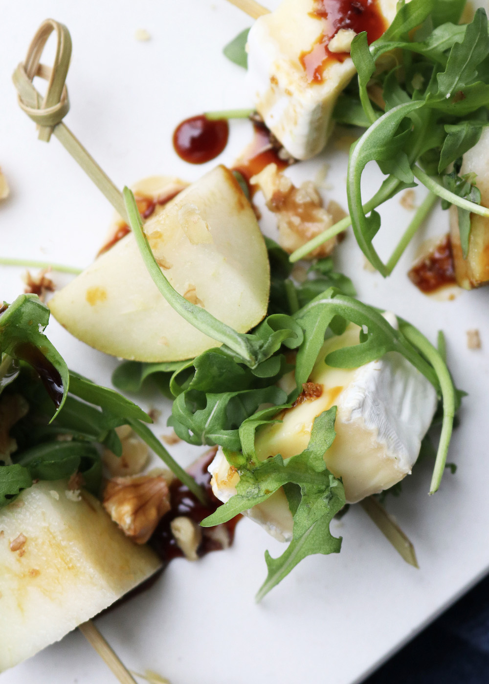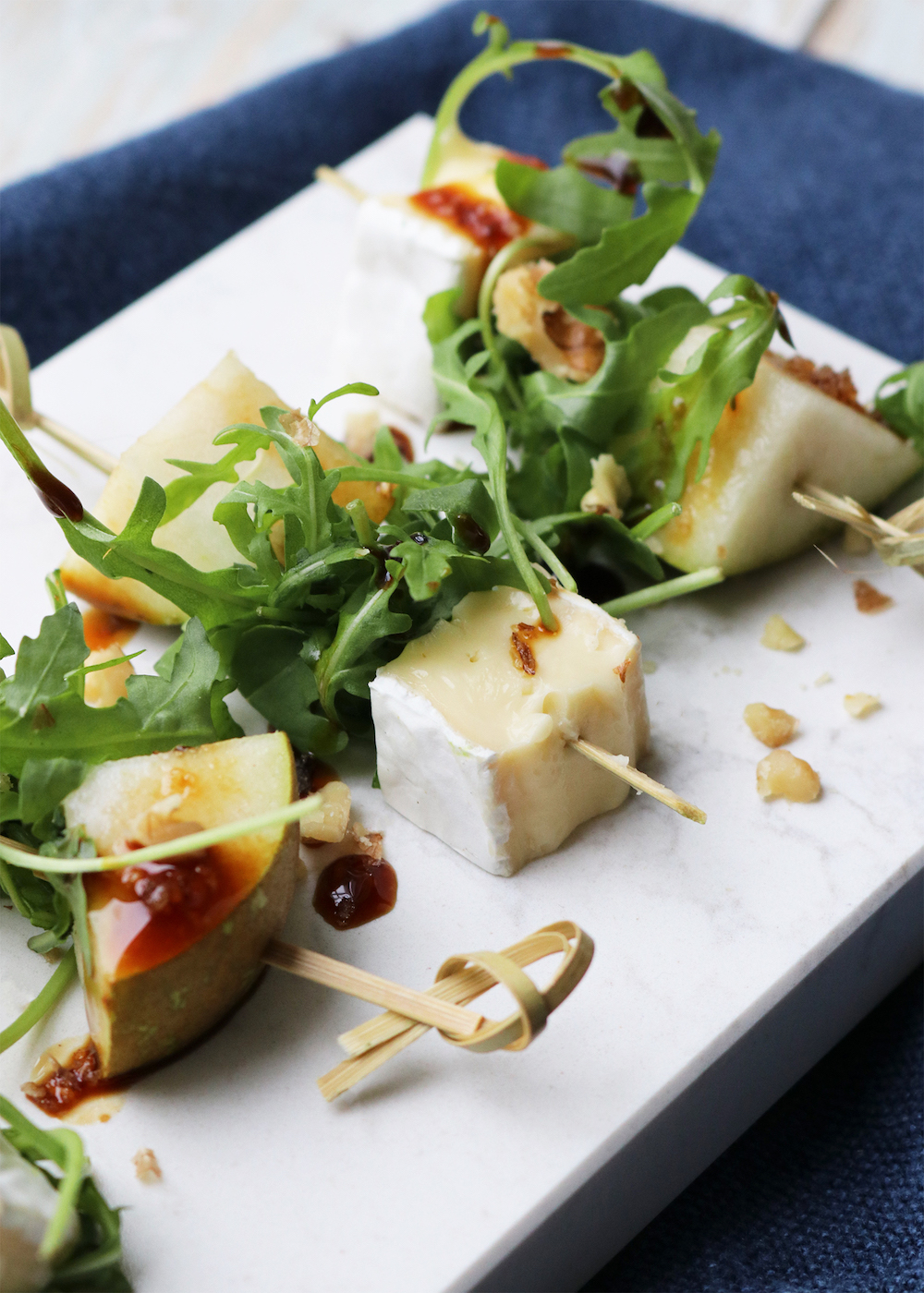 PEAR & BRIE SKEWERS WITH A DRIZZLE OF BALSAMIC VINEGAR Published: 12-11-2024 Party season is almost upon us. Entertaining a crowd doesn’t have to be complicated and we are here to help keep it as stress free as possible with this super simple canapé recipe… well, it’s more an assembly of ingredients than anything else but it’s absolutely delicious… INGREDIENTS 2-3 ripe pears (but not too ripe, they need a little it bite to them) 225-250g brie A bag of rocket 50g walnuts, crushed/chopped 1 tbsp good quality balsamic vinegar (you don’t want it too runny) 1 tsp honey Pinch of sea salt Bamboo skewers (or similar) METHOD Begin by slicing the pears into quarters, and removing the seeds and stems. Cut the quarters into rough cubes and slice the brie to match, leaving the rind on. It will all get a bit messy otherwise! Take a skewer and thread a piece of pear, a bundle of rocket, followed by a piece of brie. Arrange on a serving dish or platter and repeat until all the cheese and pears are used up. Mix the balsamic and honey in a small bowl and drizzle over the skewers with a sprinkling of walnuts and salt before serving to guests. Images: HM Share this article Copy this link https://www.humphreymunson.co.uk/pear-brie-skewers-with-a-drizzle-of-balsamic-vinegar/ Share Copy link Previous Article HOMEMADE ROSEMARY SALTED CRACKERS Next Article BLINIS WITH BUTTERED BEETROOT & SMOKED MACKEREL