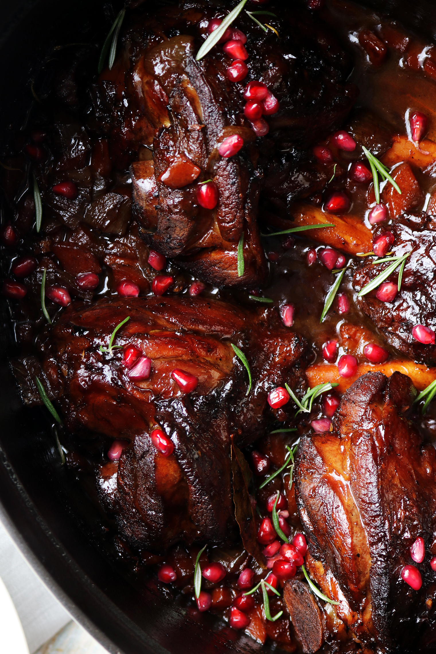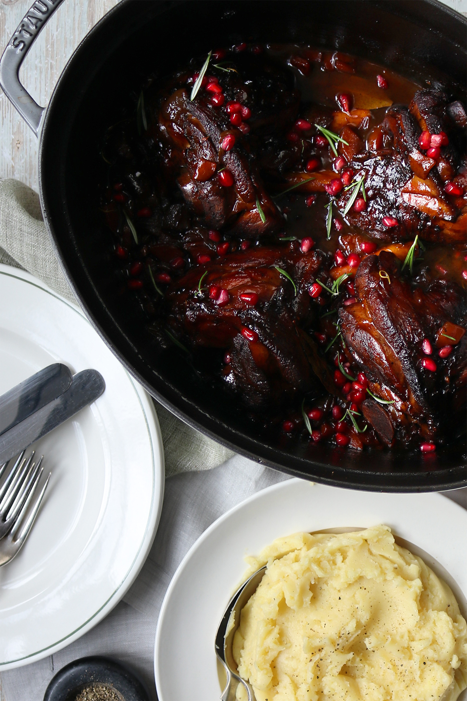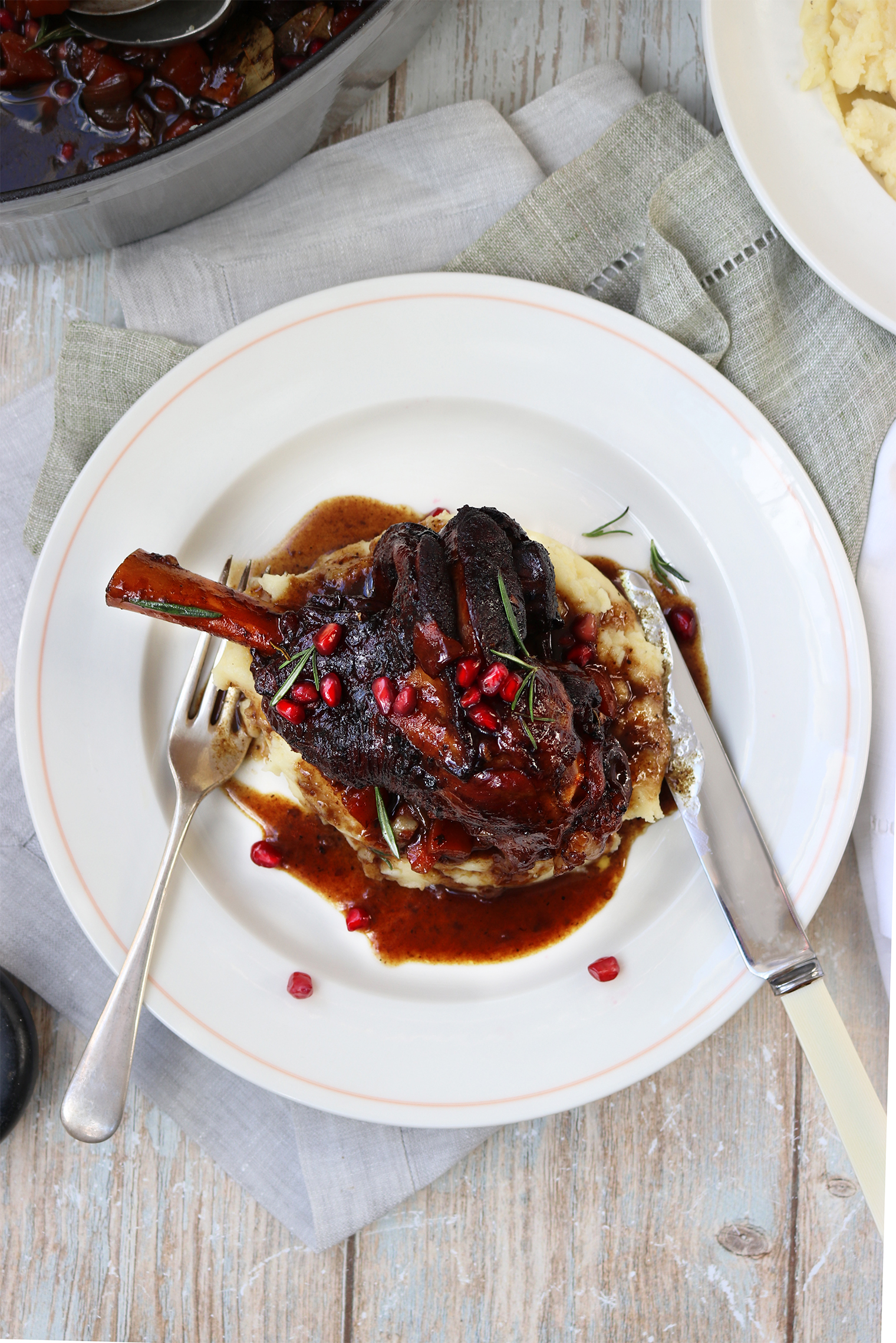 Pomegranate Braised Lamb Shanks Published: 14-11-2025 This dish is a real winter warmer and perfect to prepare in the afternoon for a dinner party. The fall-off-the-bone lamb shanks are braised in a beautifully balanced pomegranate infused sauce that has the perfect touch of sweetness while still being savoury. Pair these shanks with your favourite side, we chose classic buttery mash. Ingredients 4 Lamb shanks Olive oil to brown the meat 2 shallots cut into 8ths 3 medium carrots, diced 4 cloves of garlic, diced 1 tbsp of flour 1 tbsp soft brown sugar 1 tsp paprika 1 tsp ground cumin 1/2 tsp allspice 1/4 tsp chilli flakes 2 tbsp balsamic vinegar 240ml pomegranate juice 500ml beef stock 2 sprigs of fresh rosemary 2 bay leaves Pomegranate arils to garnish Method To begin, season the lamb shanks with salt and pepper and leave them to come to room temperature. Then preheat the oven to 160°C. Next, brown the lamb shanks. To do this, heat the oil in a large Dutch oven and add the lamb shanks two at a time, turning every few minutes until a crust forms on all sides. Transfer the shanks to a clean plate and continue until all the shanks are browned. Now add the diced carrot and shallots to the Dutch oven and saute until golden. Then add the garlic and continue cooking for a few more minutes. Next, sprinkle over the flour and stir until everything is coated. Add the sugar, paprika, cumin, allspice and chilli flakes and stir again to combine. Then add the balsamic vinegar and deglaze using a wooden utensil to scrape off any caramelisation. Now return the lamb shanks to the pot and pour over the pomegranate juice and beef stock. Add the rosemary sprigs and bay leaves. The shanks should be about 2/3 covered with liquid. Bring everything to a boil and then place the lid on the dish and braise in the oven for 3 hours. Serve with your accompaniment of choice and pomegranate arils sprinkled on top. Enjoy! Images by HM Dutch oven – Staub Crockery – John Julian Linens – Gayle Warrick Share this article Copy this link https://www.humphreymunson.co.uk/pomegranate-braised-lamb-shanks/ Share Copy link Previous Article How to include texture in a kitchen Next Article The HM 2025 Gift Guide