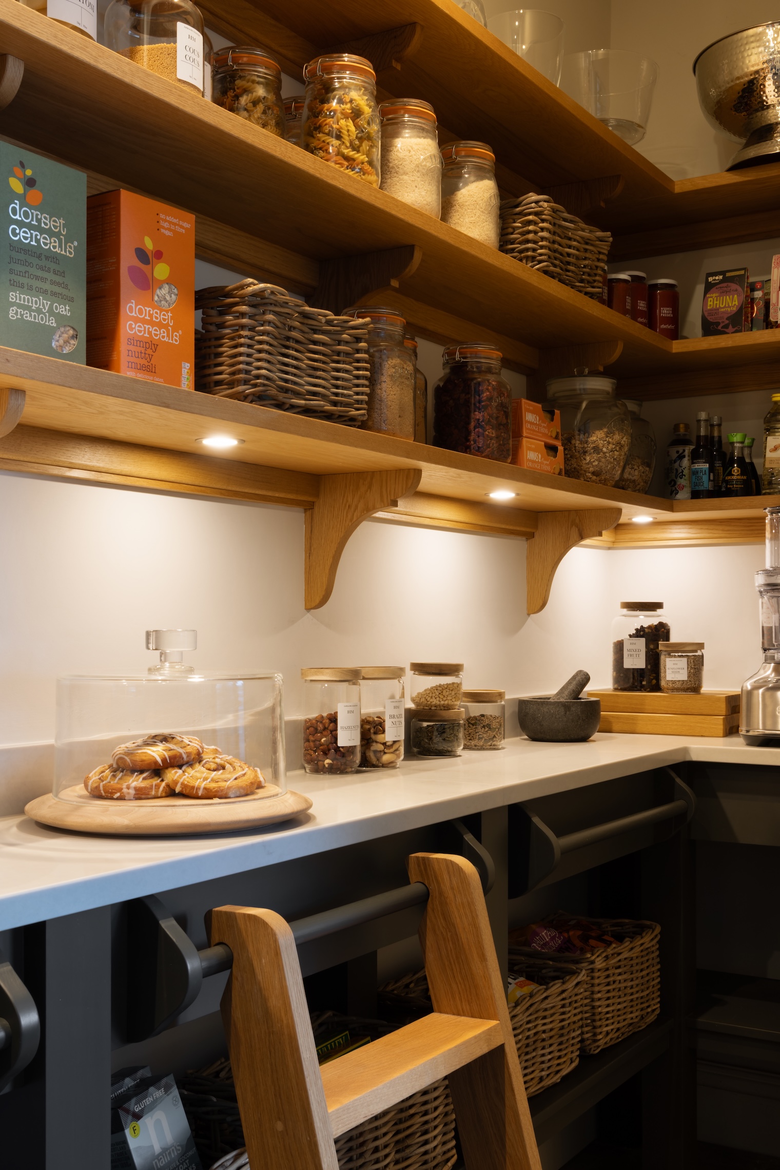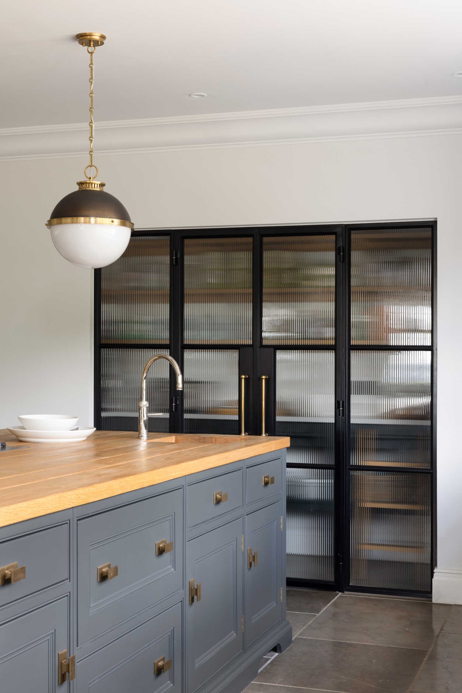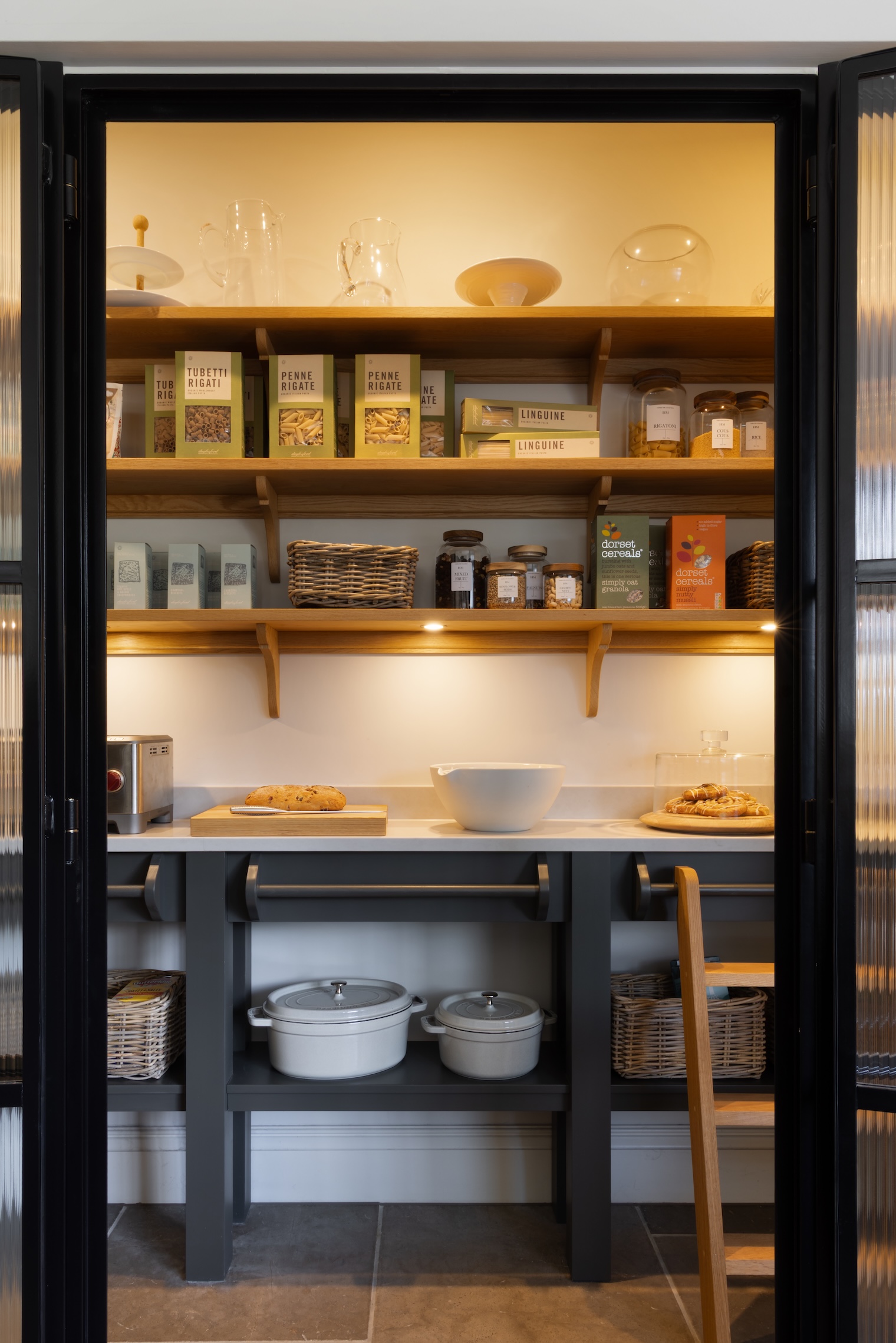 Featuring Classic oak artisan shelves and HM worktables below finished in Soot, the pantry continues the thread of texture and colour from the kitchen in a quiet and cohesive way. A super practical space all hidden behind unique Crittall-style fluted doors.