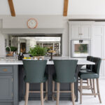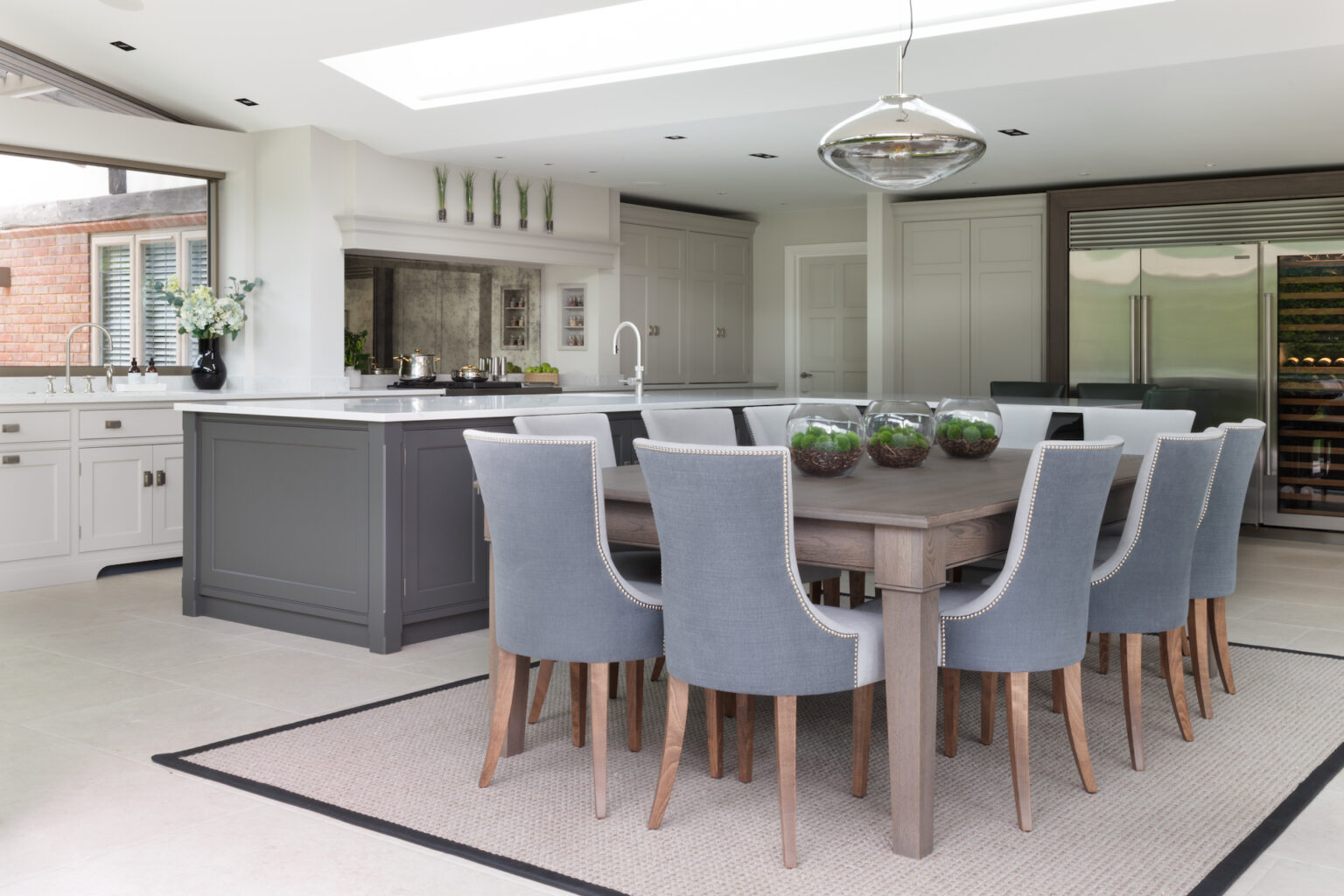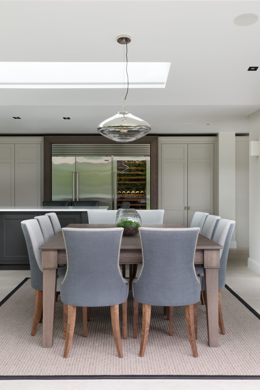 The sitting room at the Cobham project is located towards the back of the open plan space with access to the utility/laundry room. We designed the media cabinetry to ensure a cohesive feel across the entire space, adding a lovely L-shape sofa and rug that brings texture and warmth to the room. The attention to detail on the lighting makes all the difference.