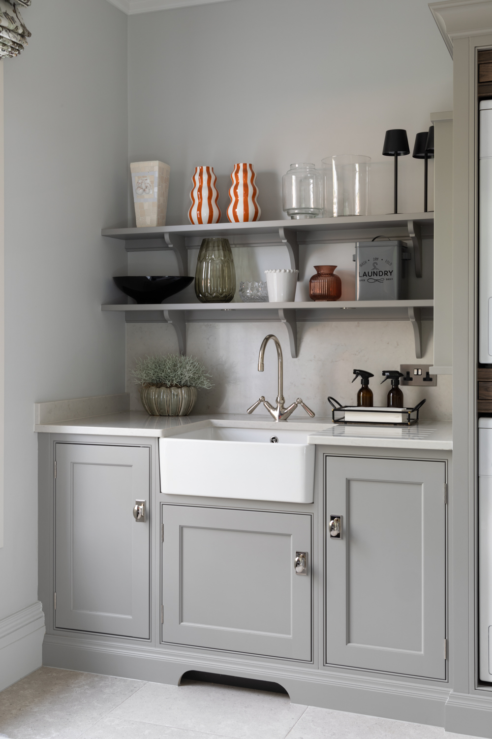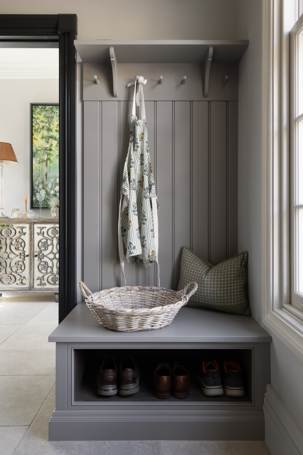 This beautifully considered project revolves around the orangery extension to the main house which is now home to a beautiful light and airy Humphrey Munson kitchen, walk in pantry as well as this super practical and essential bootility room.