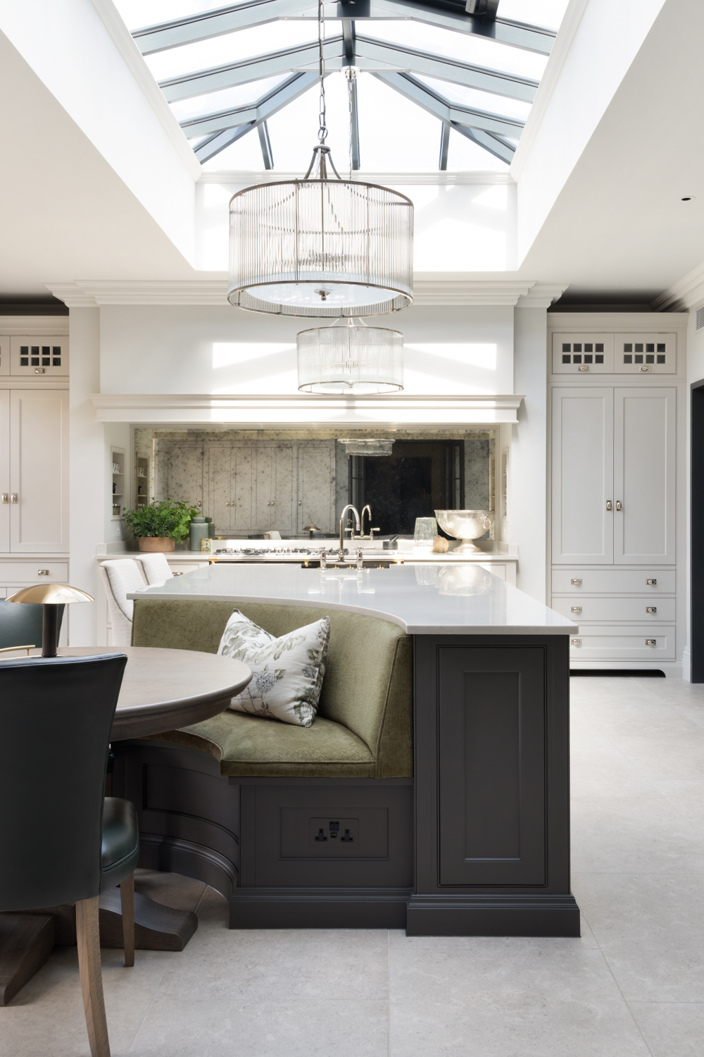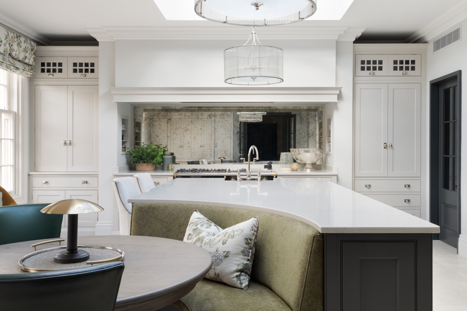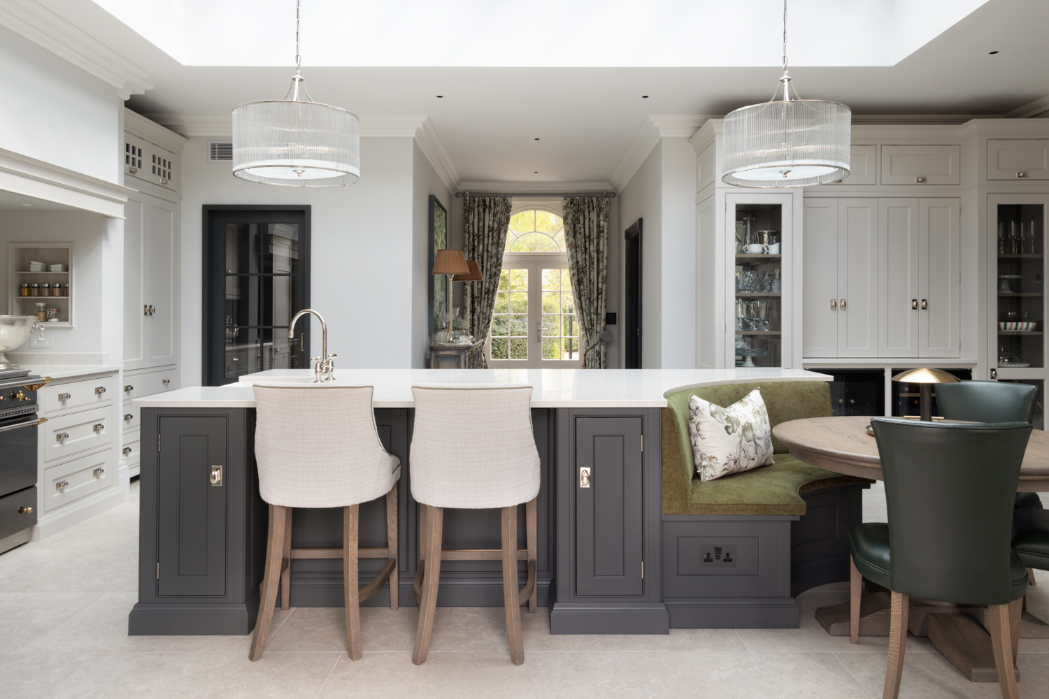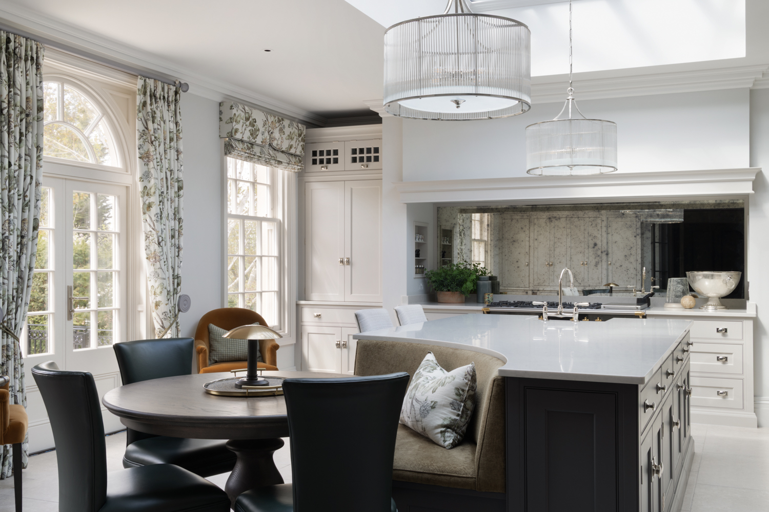 Entertaining was cleverly woven into every detail of this design. A discreet drinks bar offers a moment for aperitifs before dinner, while a large television is cleverly concealed behind countertop cabinetry, maintaining the room’s refined aesthetic. Banquette seating at one end of the island creates a more relaxed, sociable dining alternative – perfect for informal suppers for two, along with a pair of counter stools to be used as an everyday perch.