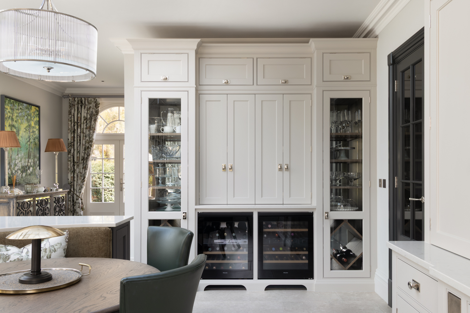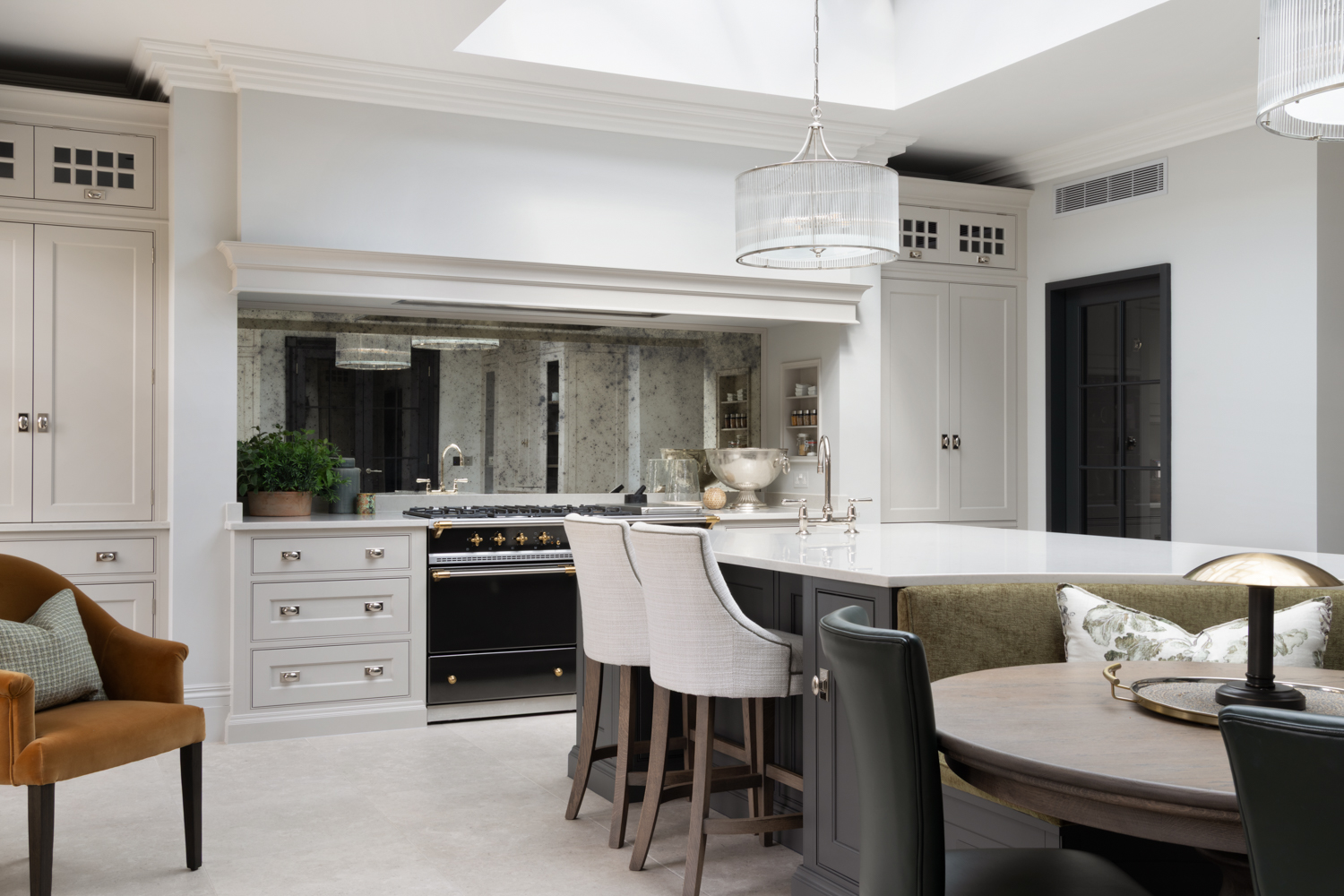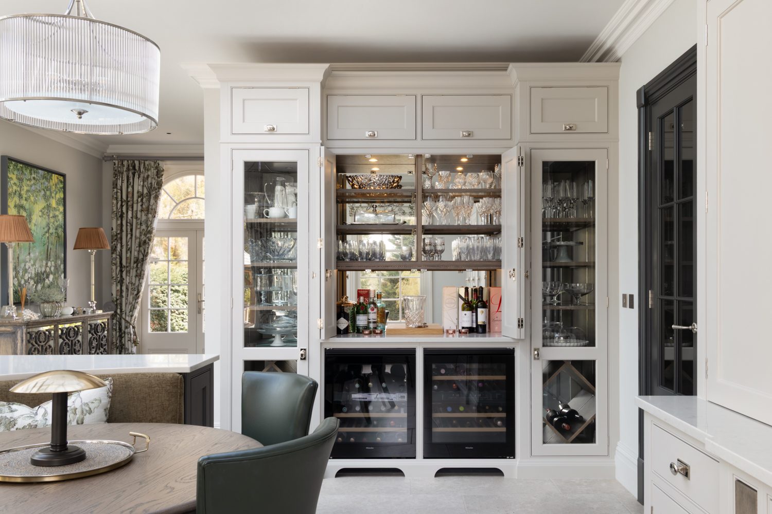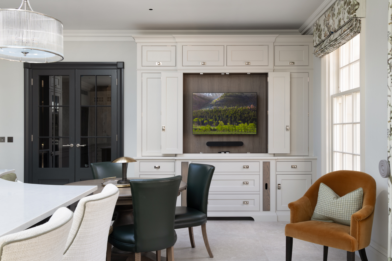 Entertaining was cleverly woven into every detail of this design. A discreet drinks bar offers a moment for aperitifs before dinner, while a large television is cleverly concealed behind countertop cabinetry, maintaining the room’s refined aesthetic. Banquette seating at one end of the island creates a more relaxed, sociable dining alternative – perfect for informal suppers for two, along with a pair of counter stools to be used as an everyday perch.