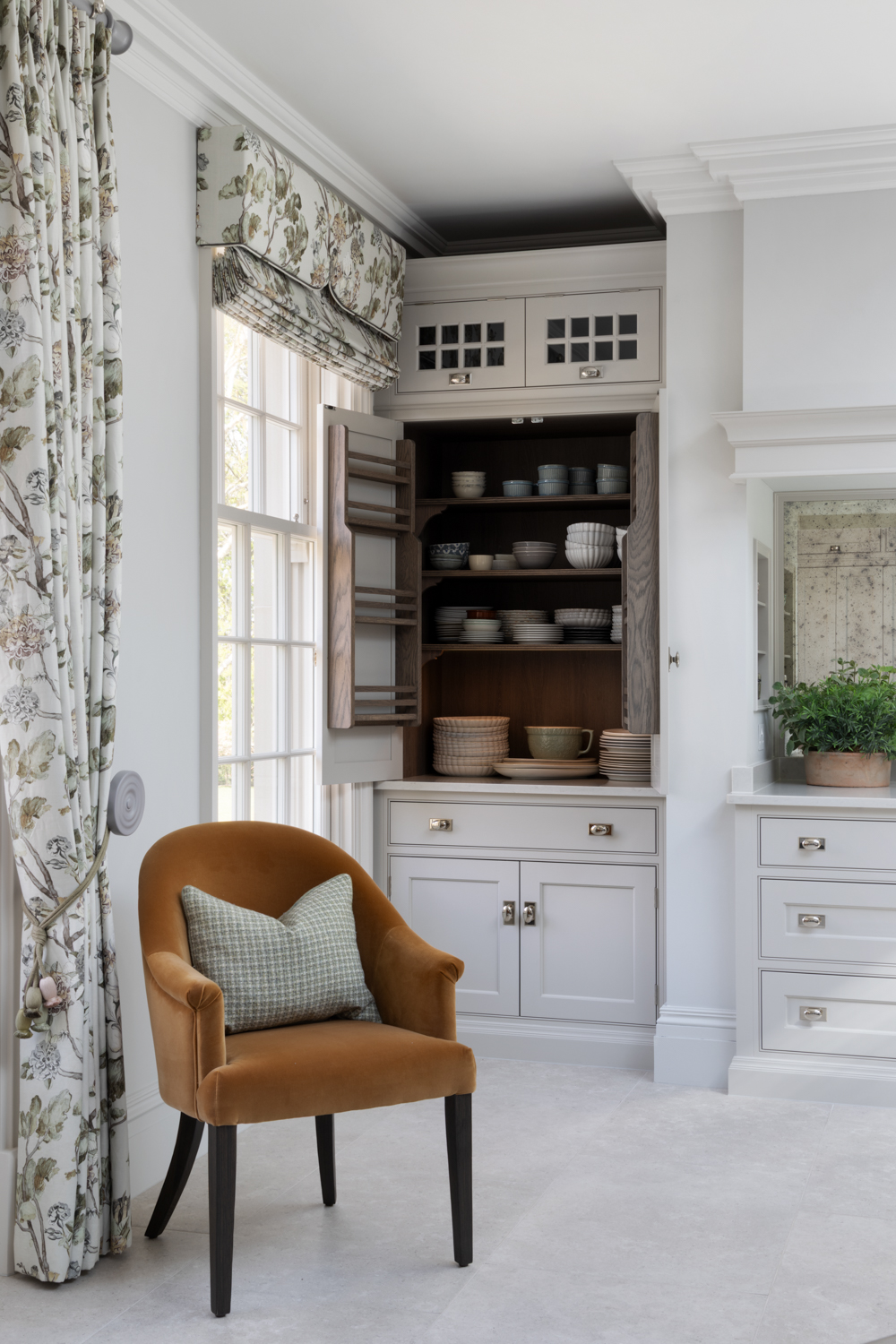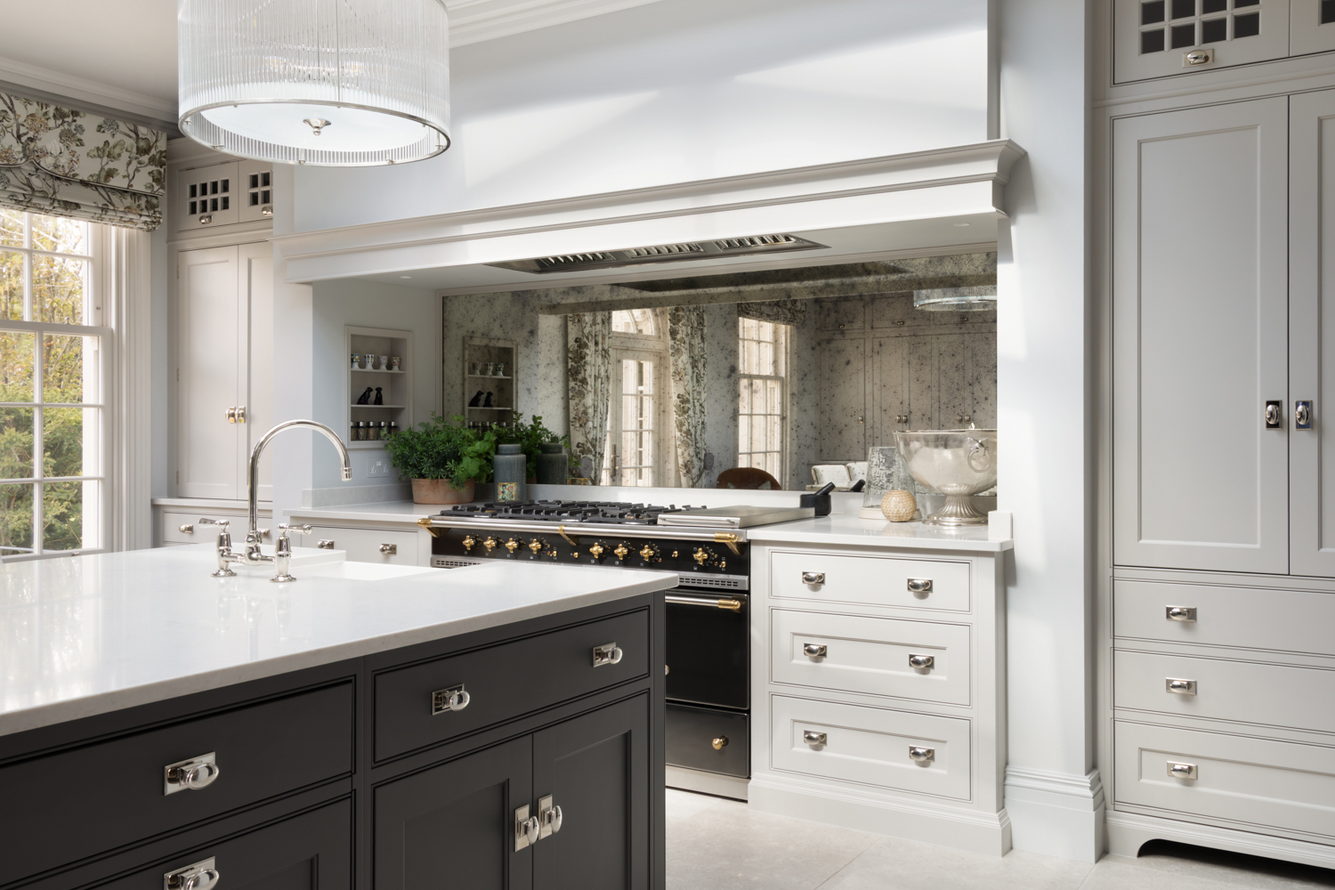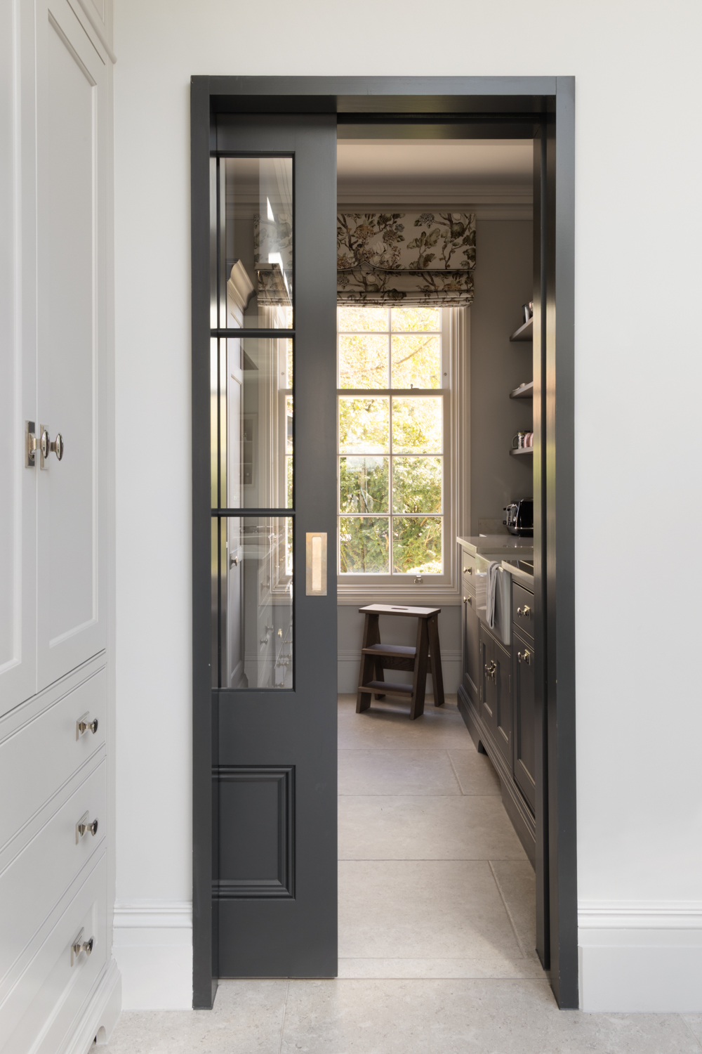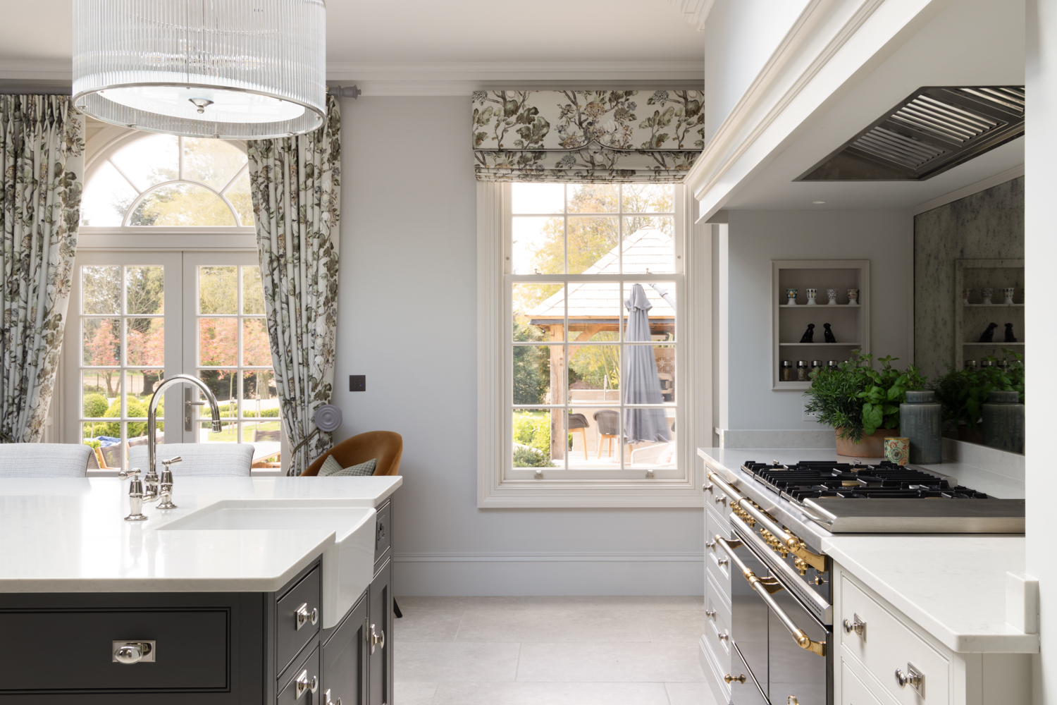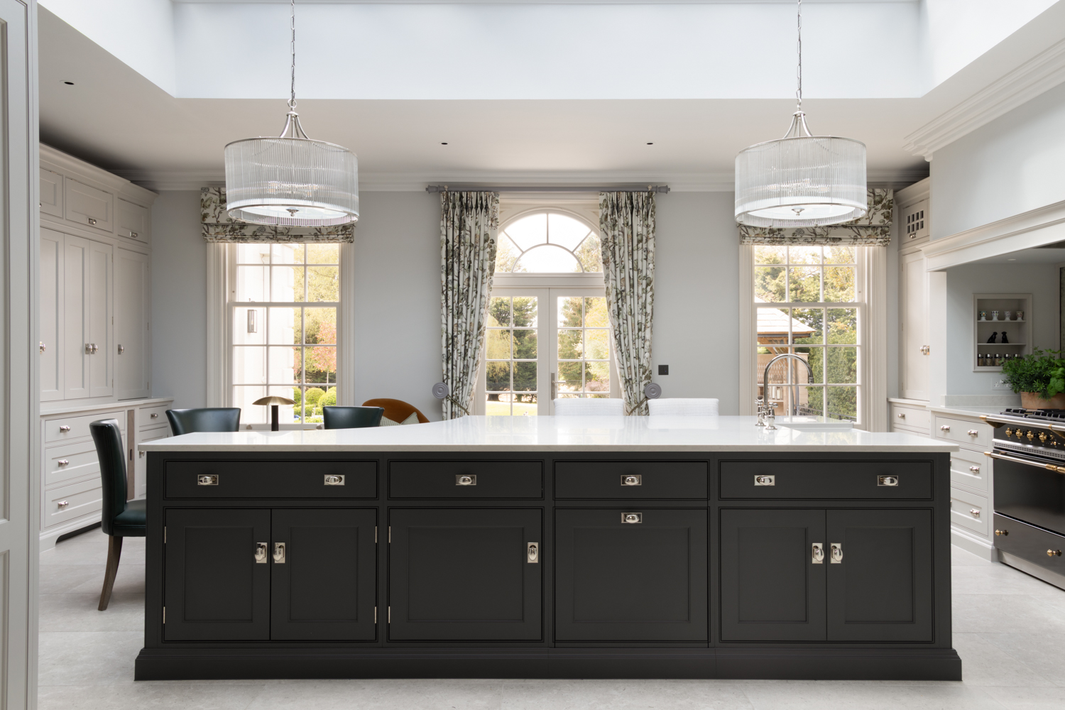 At its heart lies a kitchen designed to perform a delicate balancing act: expansive enough to host many guests with ease, yet considered and intimate when occupied by just two. The space is intentionally calm and composed, with a strong emphasis on clarity and order. A large central island anchors the room, painted in our bespoke ‘Top Hat’ to ground the volume, while the softer, more natural ‘Tailored Grey’ was used on the cabinetry wrapping the perimeter to ensure warmth throughout.