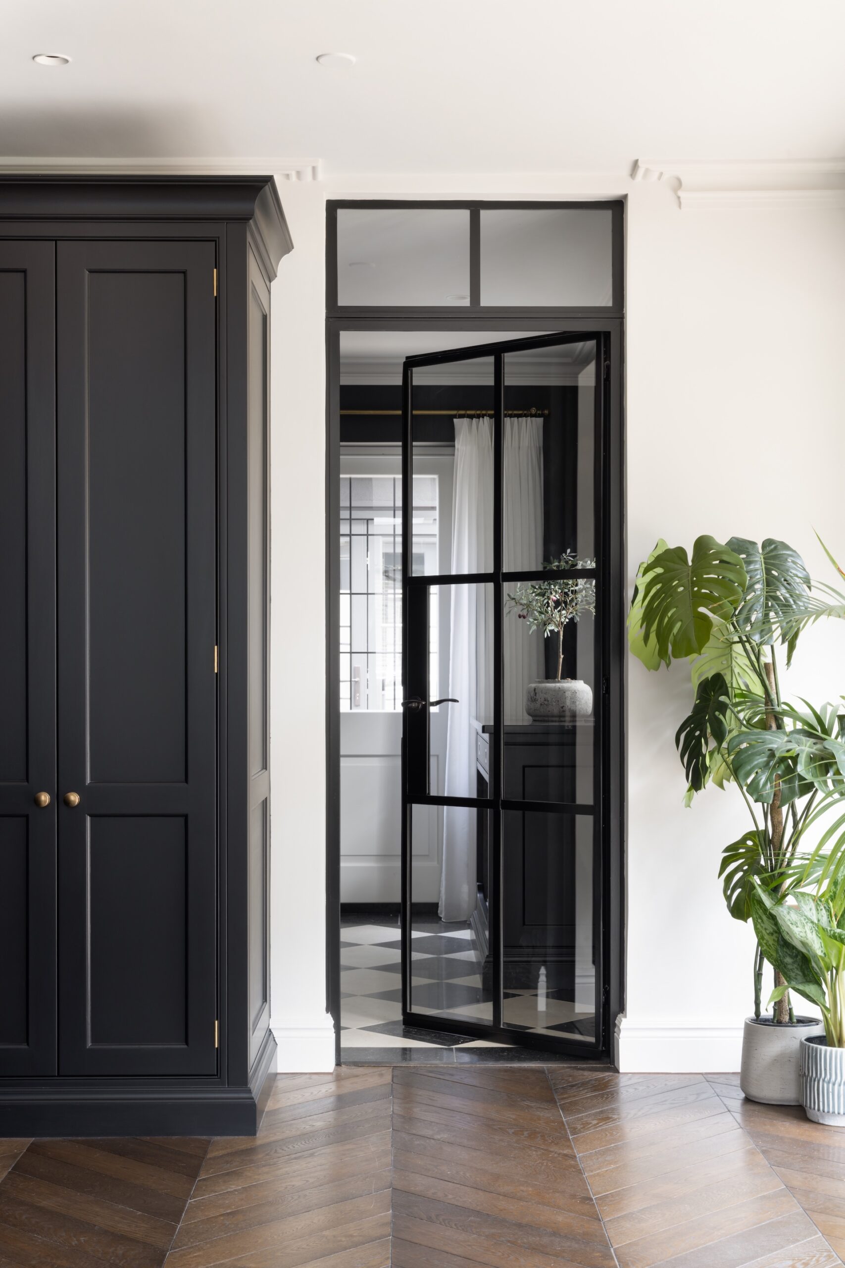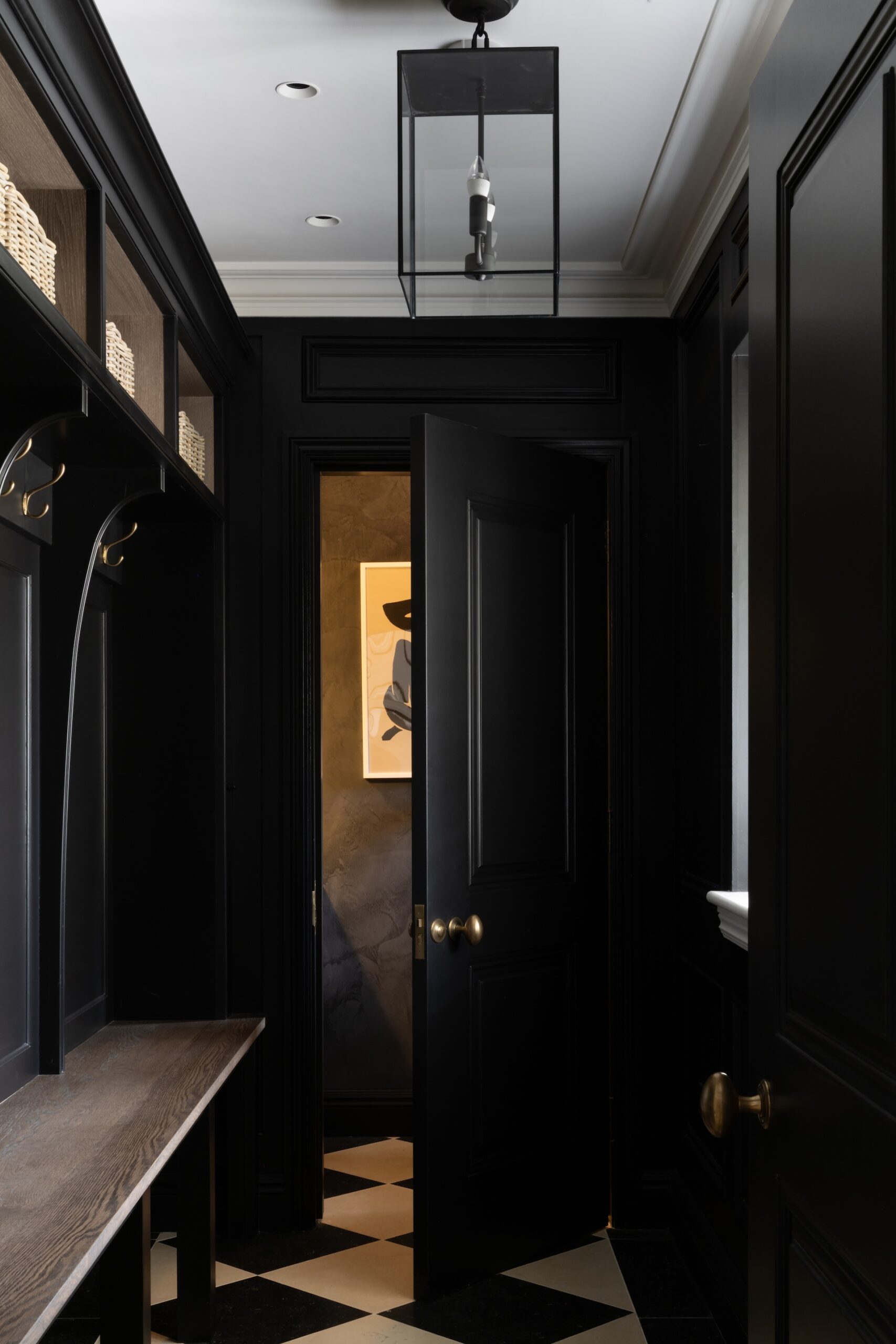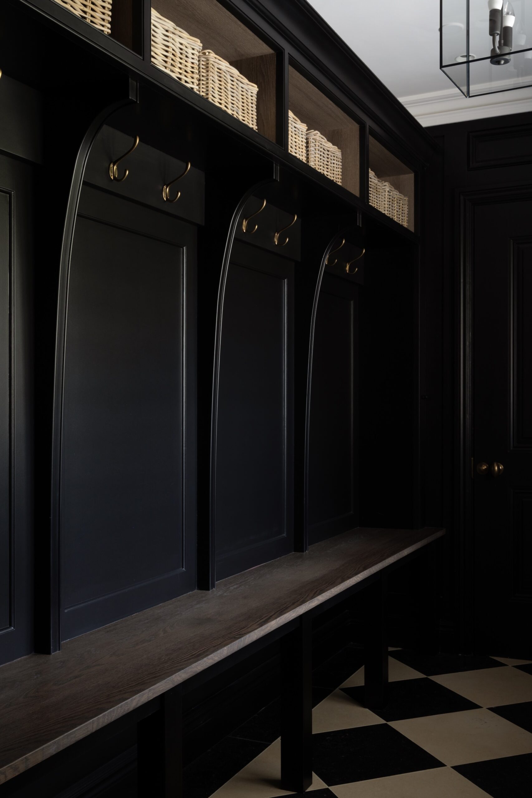A practical and stylish boot room that leads through to the downstairs guest loo. Finished in HM’s Mr Banks with brass coat hooks and Berkeley oak bench and interior finish, this room is testament to HM’s dedication to classic and enduring design.