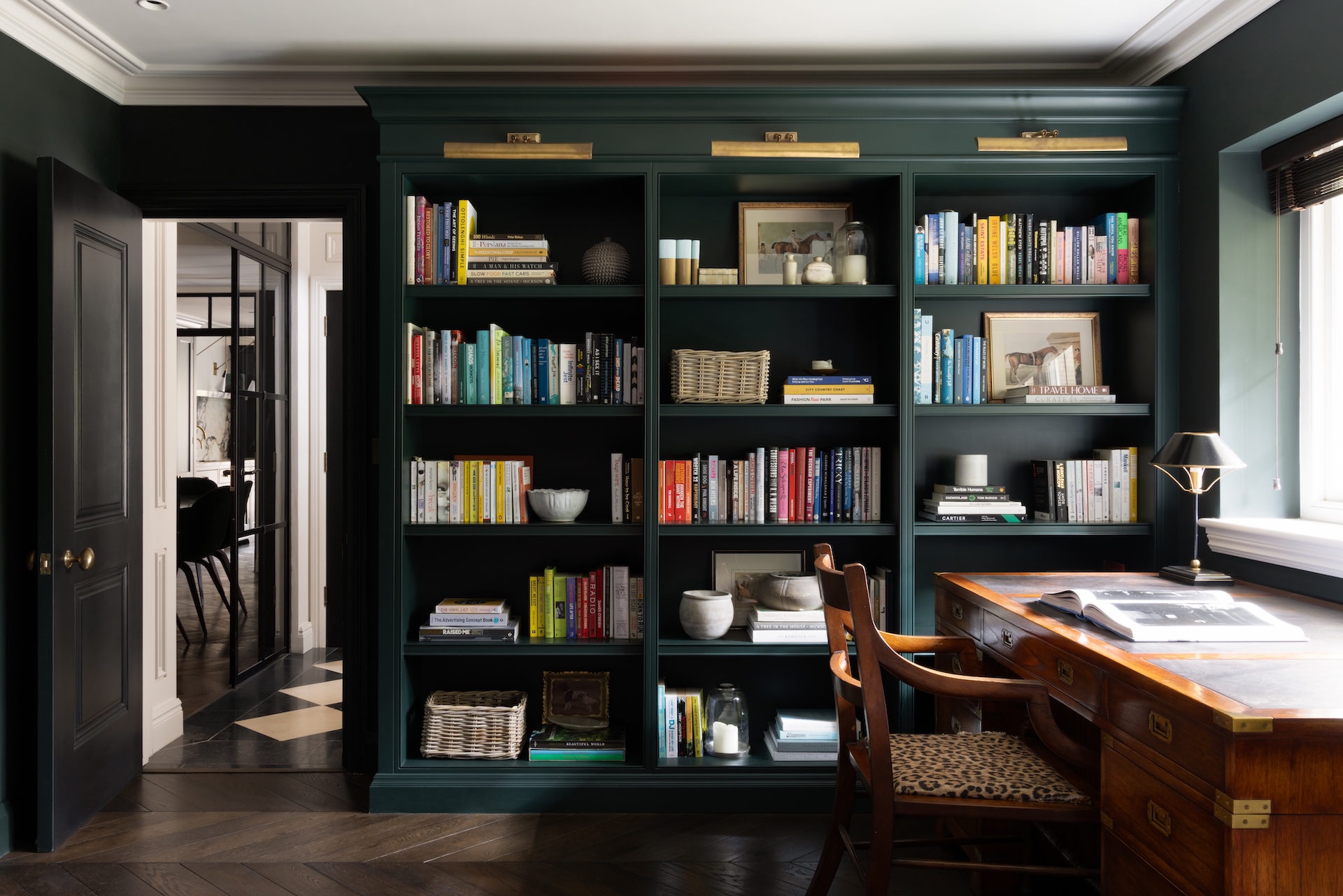 Cool, cosy and colour drenched in the deep green ‘Black Thorn’ by HM. We love this with the fluted Portobello oak detailing and a statement striped sofa. The result is bright, bold and we love it.