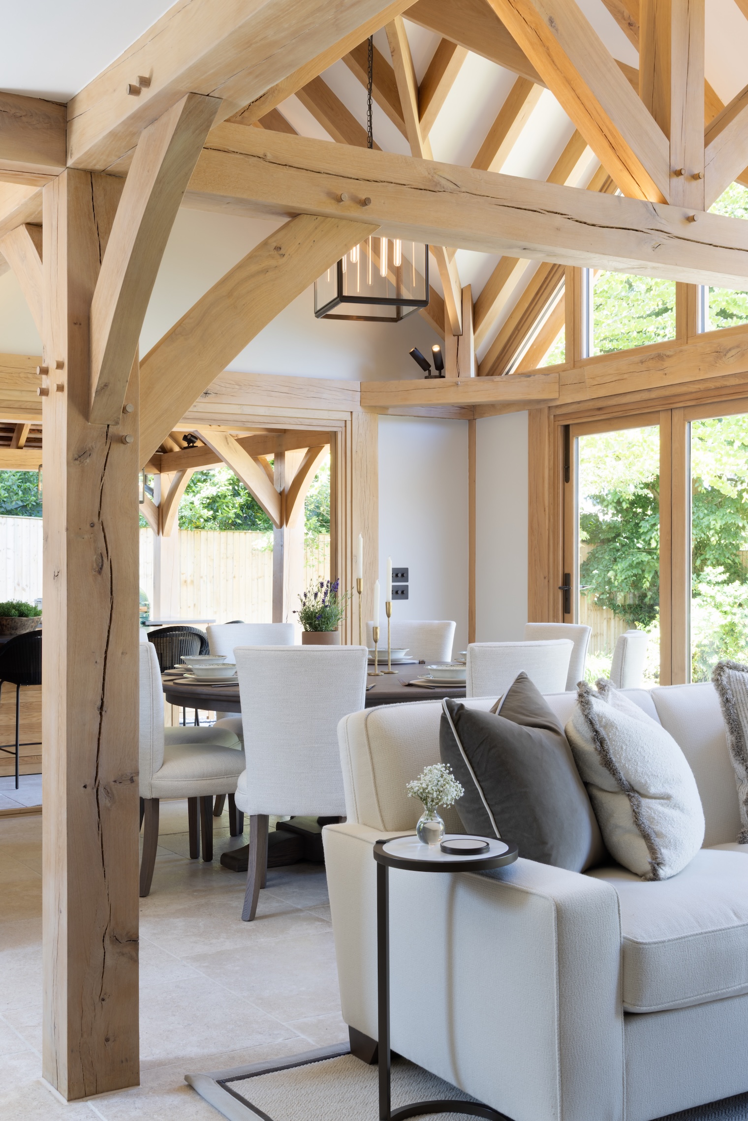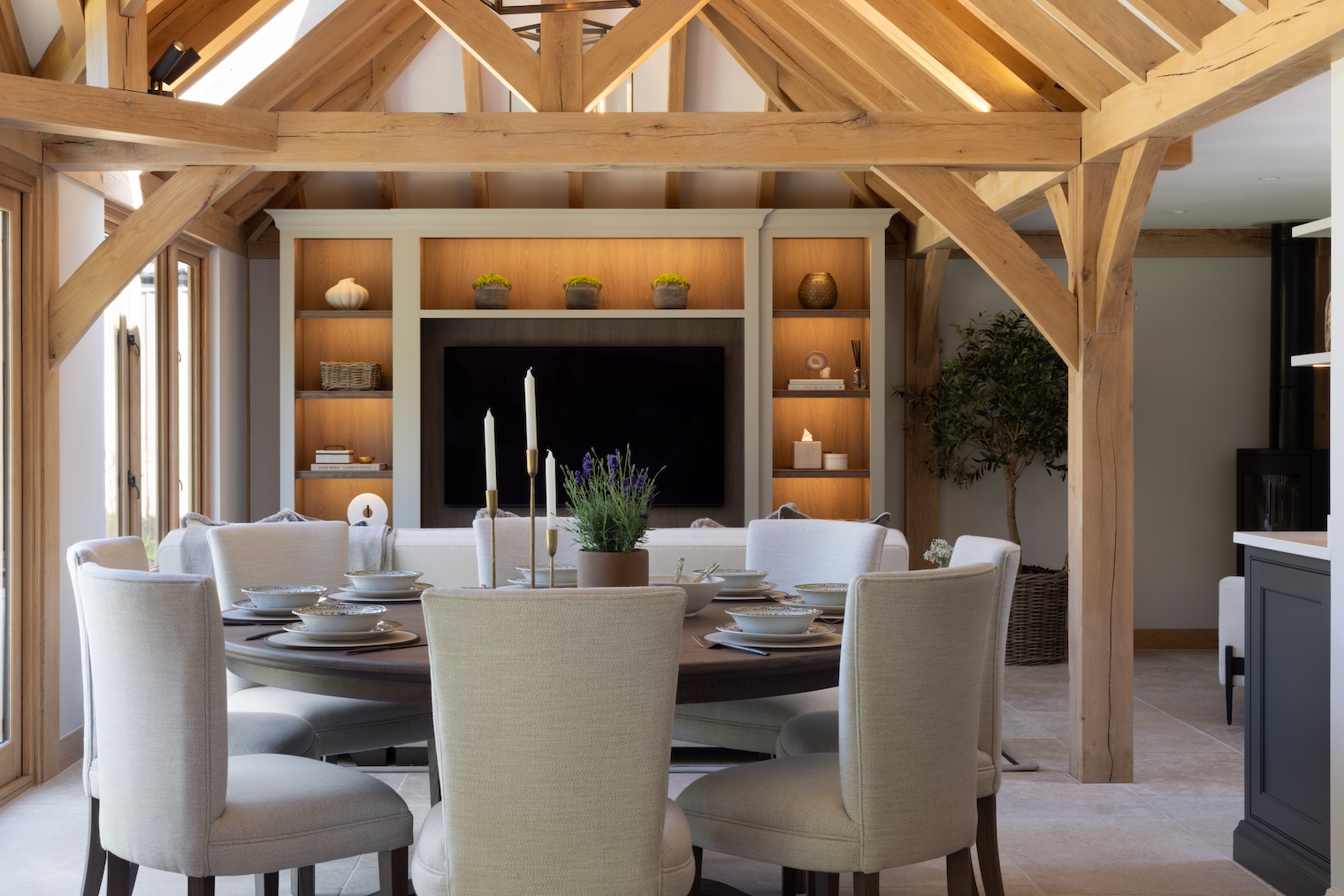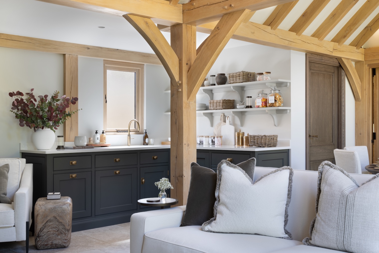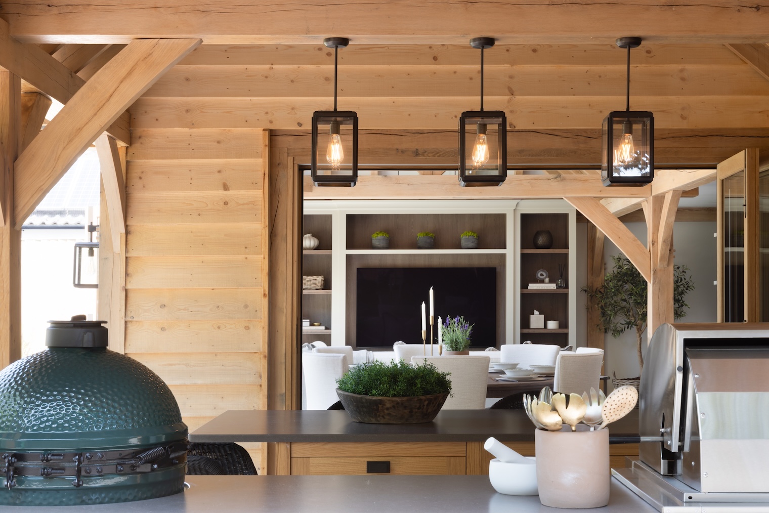 Our clients envisioned the ultimate indoor-outdoor entertaining space as a seamless blend of comfort and functionality. Complete with an outdoor kitchen, prep kitchen, dining area, soft seating, and a bathroom, the space offers everything needed for effortless hosting. Rustic oak beams infuse the space with character and warmth, creating an oasis from the everyday.