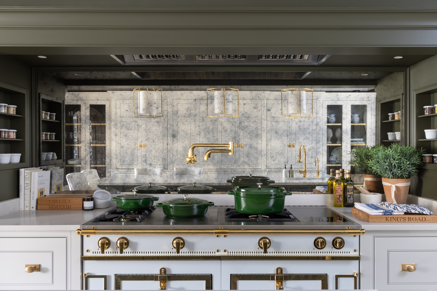 A striking contemporary kitchen featuring bold colours, brass accents and an iconic La Cornue range cooker that serves as the focal point for the room.