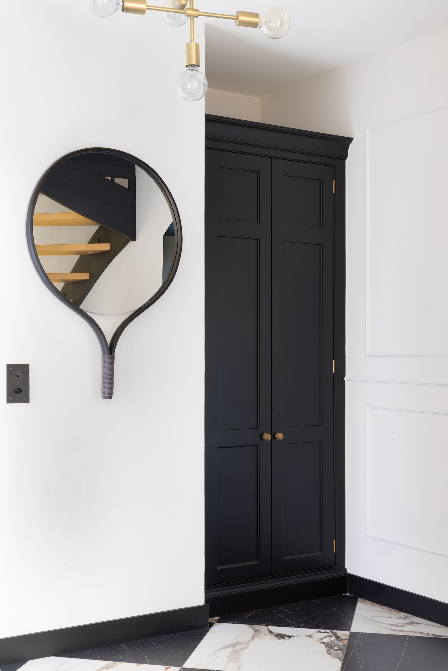 The bright and airy hallway at the Lake Geneva Project features a super practical tall cupboard for coat storage alongside an upholstered bench; perfect for putting on shoes.