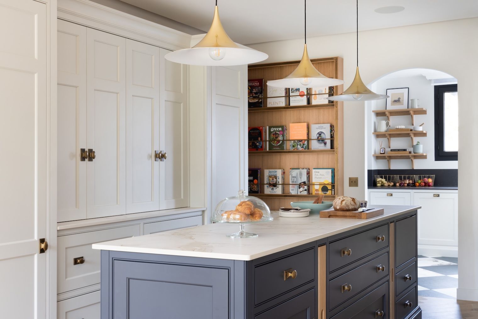 A hugely spacious and practical pantry that works as a standalone prep kitchen. With open shelving, drawers, tall cupboards and additional sink and much more. This pantry really has everything one could possibly need.