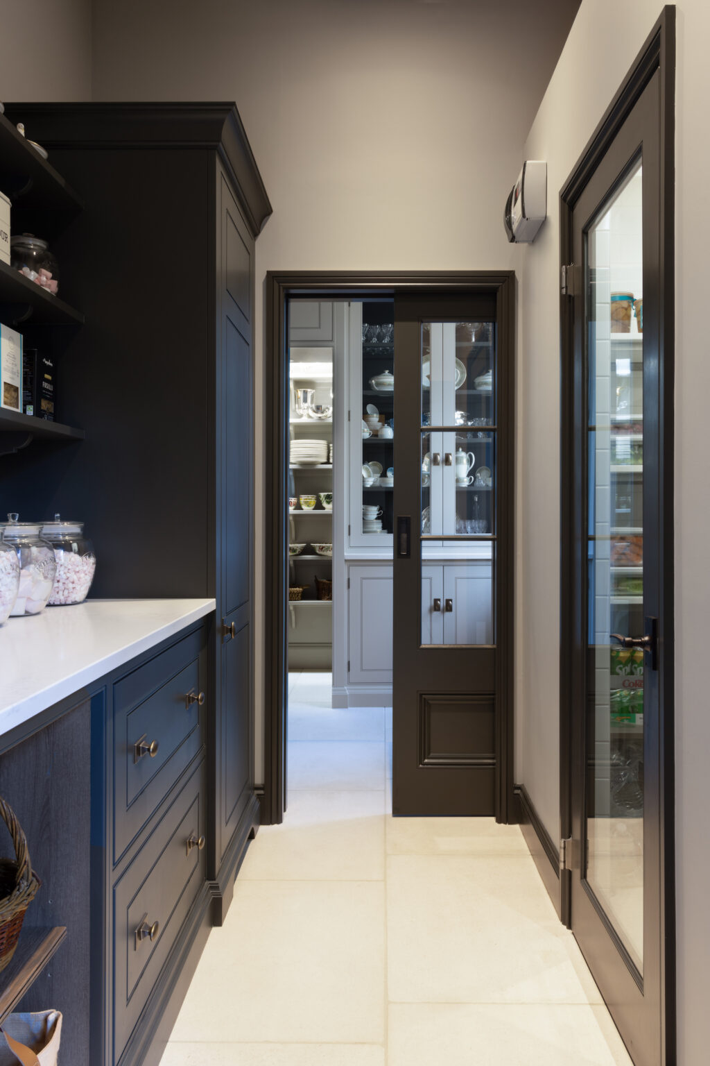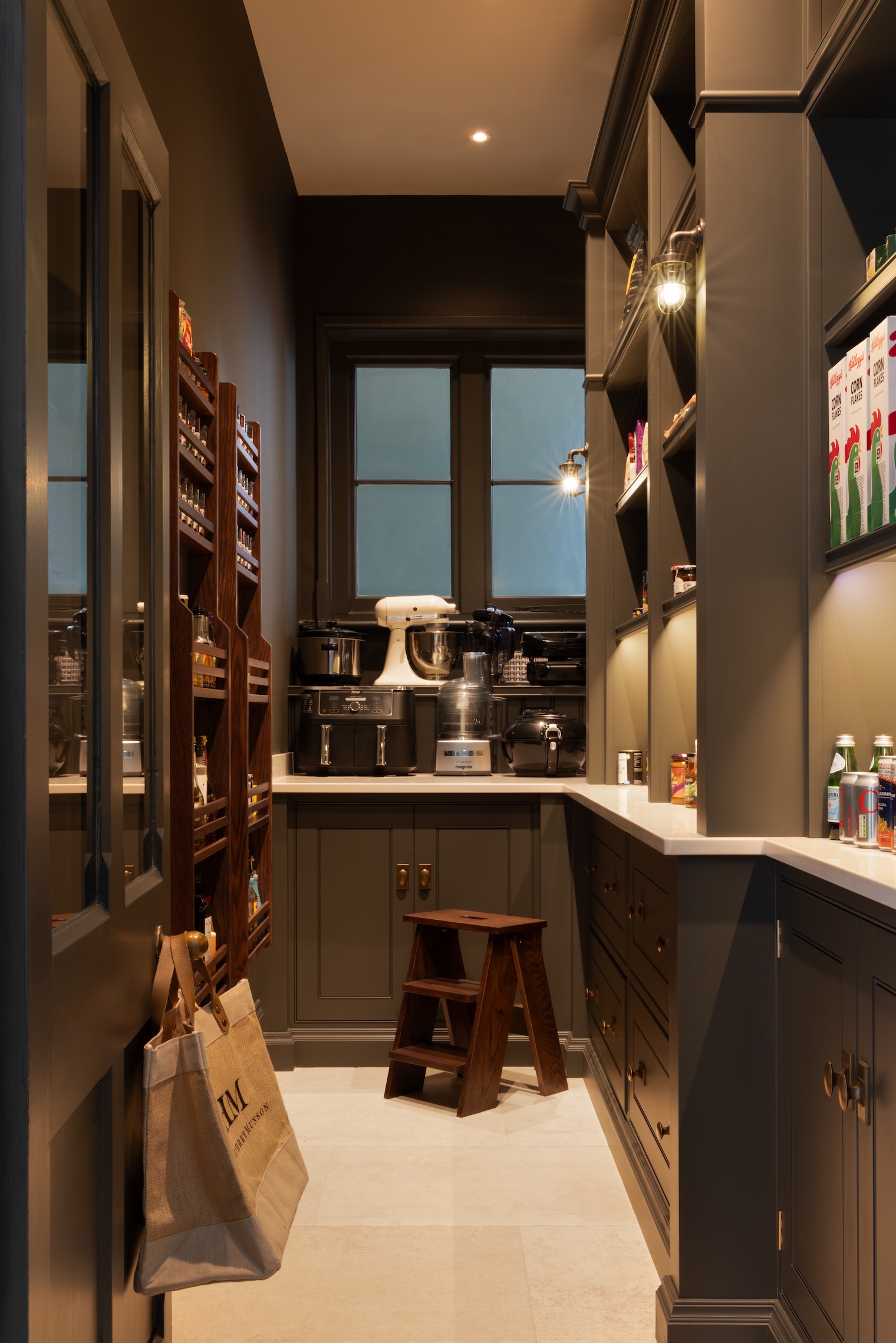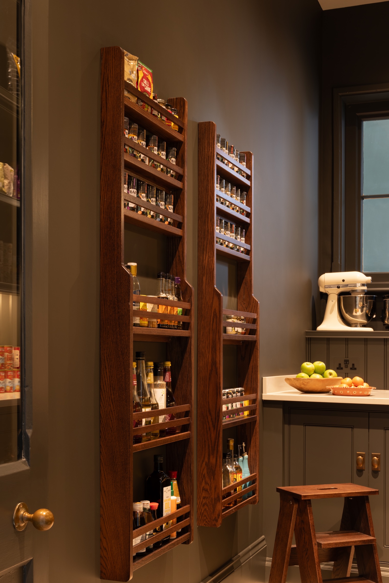 A standout pantry in its original, historic position that has been reworked to bring it into the 21st century. The moody colour palette and stocked shelves feel luxurious yet practical and the numerous storage types create a functional and cohesive space that our clients just love.