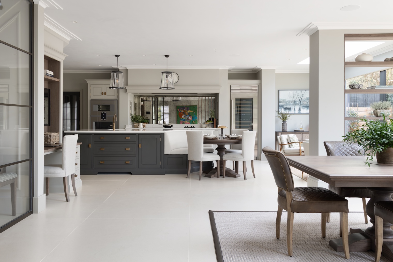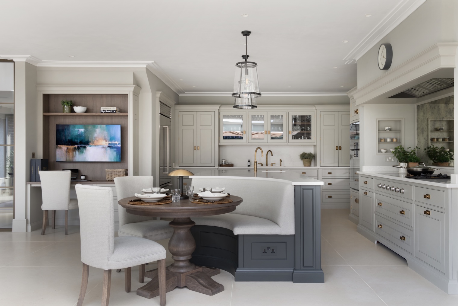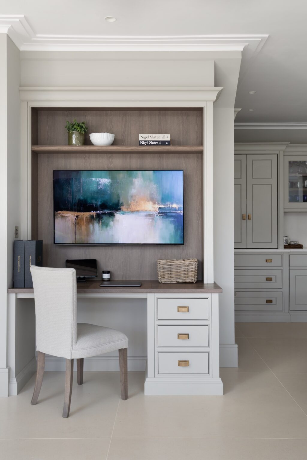 The everyday desk in the kitchen reflects this layered approach to living. A smaller, more discreet television sits above the kitchen desk and is ideal for background viewing, while the main media unit at the other end anchors the primary soft seating area for proper movie nights and evenings in. Importantly, the desk area itself was designed to feel separate from the main office, connected to family life, yet distinct enough for focus.