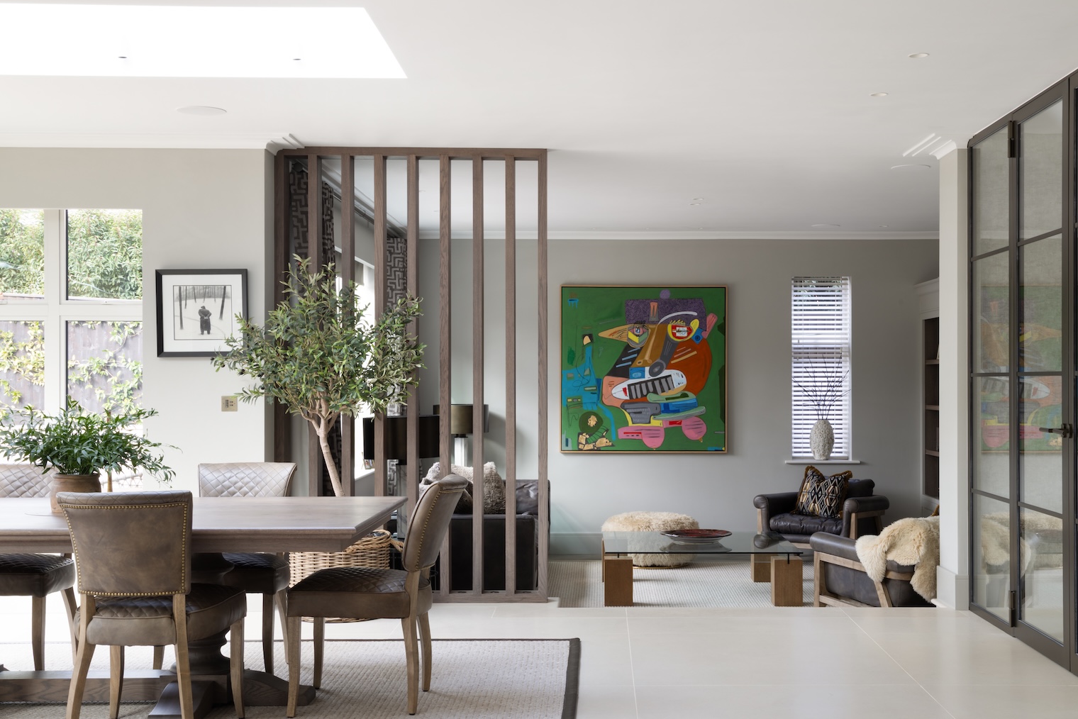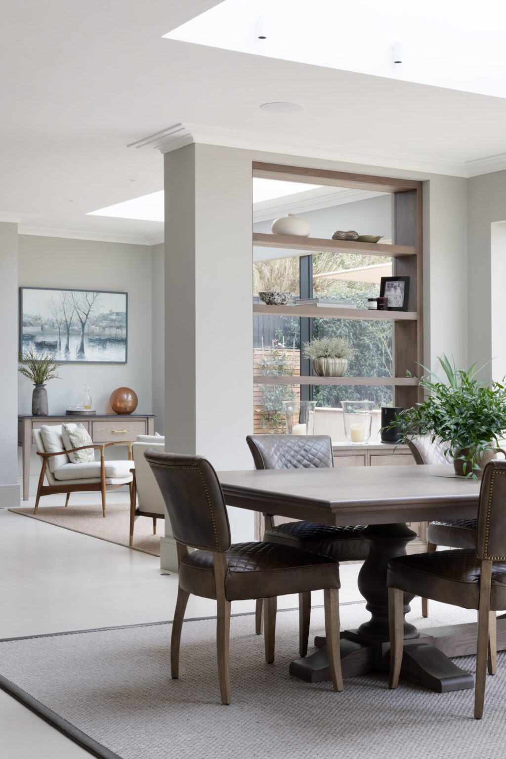 Structural pillars, required due to the scale of the open-plan space were carefully integrated within bespoke Portobello oak slatted detailing and a bookshelf so that practicality quietly disappears into design.
