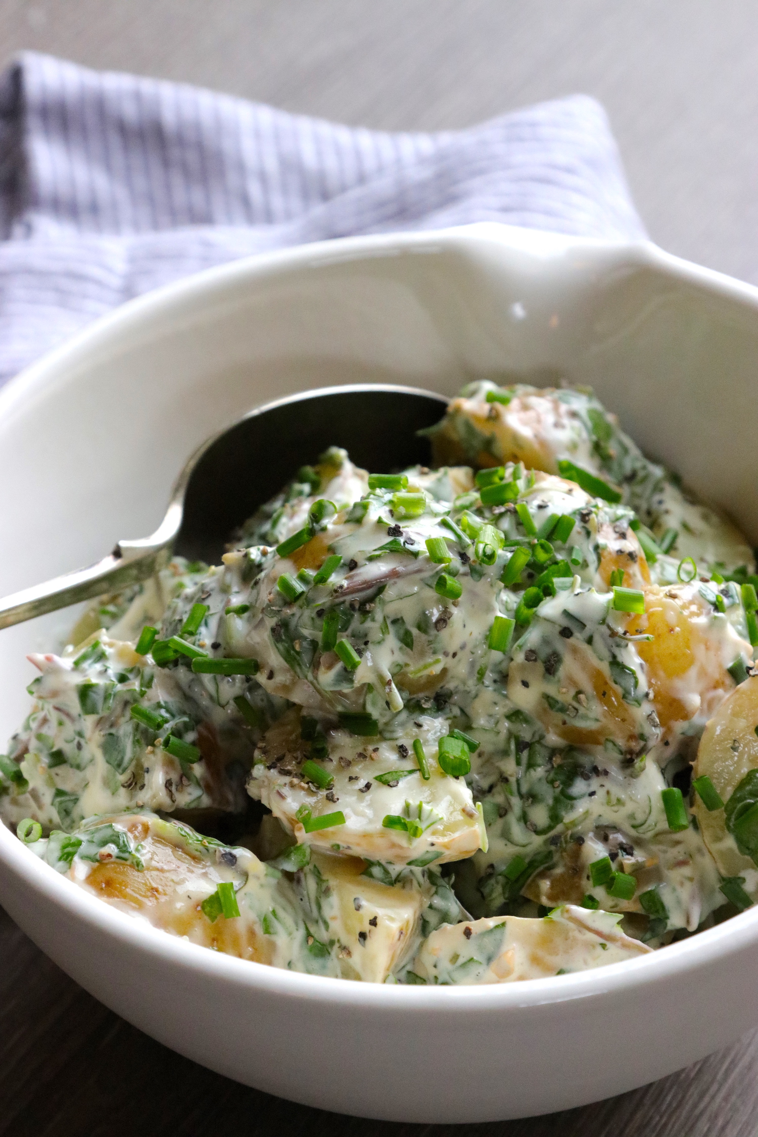 Recipe Notes | Quick and Easy Potato Salad Published: 08-05-2020 We are obsessed with this herby lemony potato salad especially as it’s so easy! We love La Ratte potatoes from Waitrose – they are a traditional French variety that is a little bit nutty and so so flavoursome. To make the potato salad, I mean everyone knows how to make potato salad, but this is how we do it – bring the potatoes to boil in salty water until they are cooked. Very important to use cold water otherwise the potato cooks too quickly from the outside and cracks. Drain the potatoes, and while they are still warm, decamp them to a large mixing bowl (the one in the images is our favourite from John Julian). Add a good dollop of mayonnaise (make your own for extra everything), a tsp of so of Dijon mustard, a squeeze of lemon, fresh cracked black pepper, seat salt, chives and parsley. Taste it and see, if you want it more lemon-y or mustard-y – add more… It also works well with tarragon and optional added crispy bacon for real va-va-voom. Must serve with a glass of crisp chilled white wine. Images: HM Share this article Copy this link https://www.humphreymunson.co.uk/recipe-notes-quick-and-easy-potato-salad/ Share Copy link Previous Article The Marton Handle By Humphrey Munson Next Article Orange Polenta Cake | Dairy Free & Gluten Free