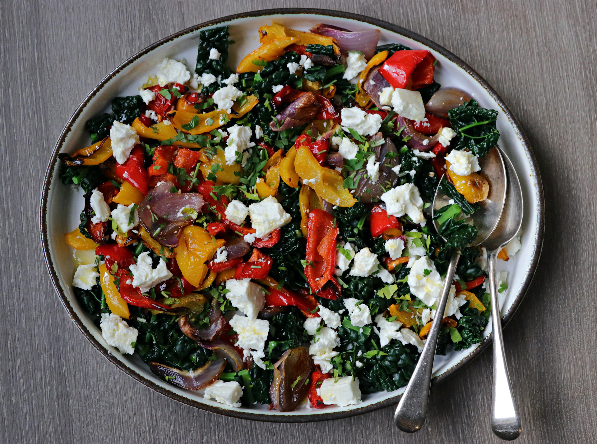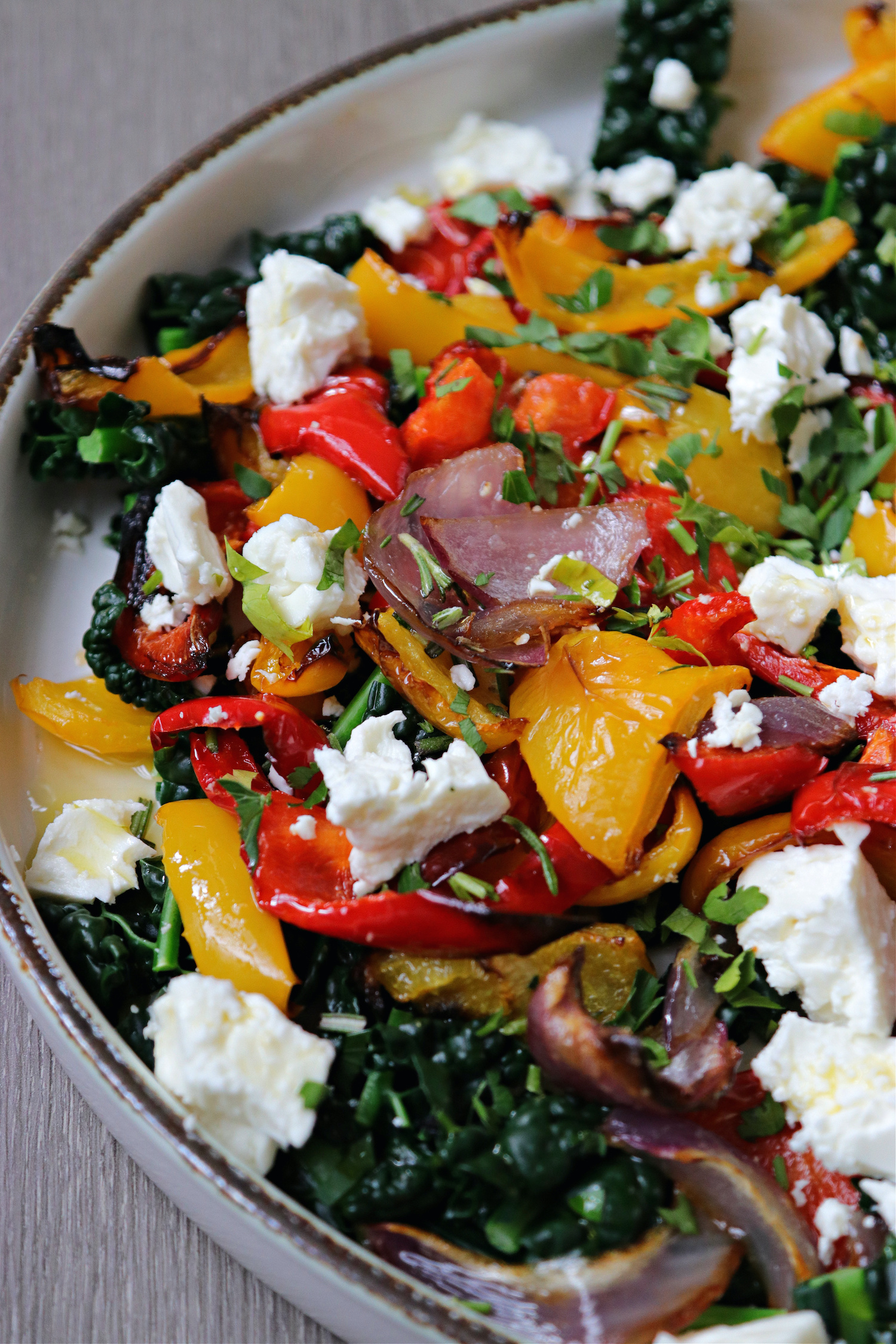 Recipe Notes | Roasted Winter Vegetable Salad Published: 31-10-2020 A tasty greek inspired side to a not so traditional Sunday roast or a delicious light lunch, this recipe for roasted winter veggies and feta is so easy it doesn’t really need a recipe! We roasted red and yellow peppers with a red onion for around 30 minutes, just drizzle a little olive oil and season with salt and pepper. After 30 minutes we added some chopped up cavalo nero and popped back in the oven for 5-6 minutes. Next we removed from the oven, added to a pre-warmed serving dish and crumbled some feta cheese on top with a sprinkling of fresh herbs (we had parsley to hand). You could also use goat’s cheese. This is the kind of recipe you can adapt and just roast whatever veggies you have in the fridge that needs using up. It’s amazing how even tired old carrots can be resurrected in the oven! We drizzled a little extra virgin olive oil over the top and seasoned with a little salt and pepper. You could also use a little balsamic vinegar for an extra tang if you wish. Images: HM Share this article Copy this link https://www.humphreymunson.co.uk/recipe-notes-roasted-winter-vegetable-salad/ Share Copy link Previous Article Recipe Notes | Rosemary Roasted Parmentier Potatoes Next Article NEW Longford Pantry | Felsted Showroom