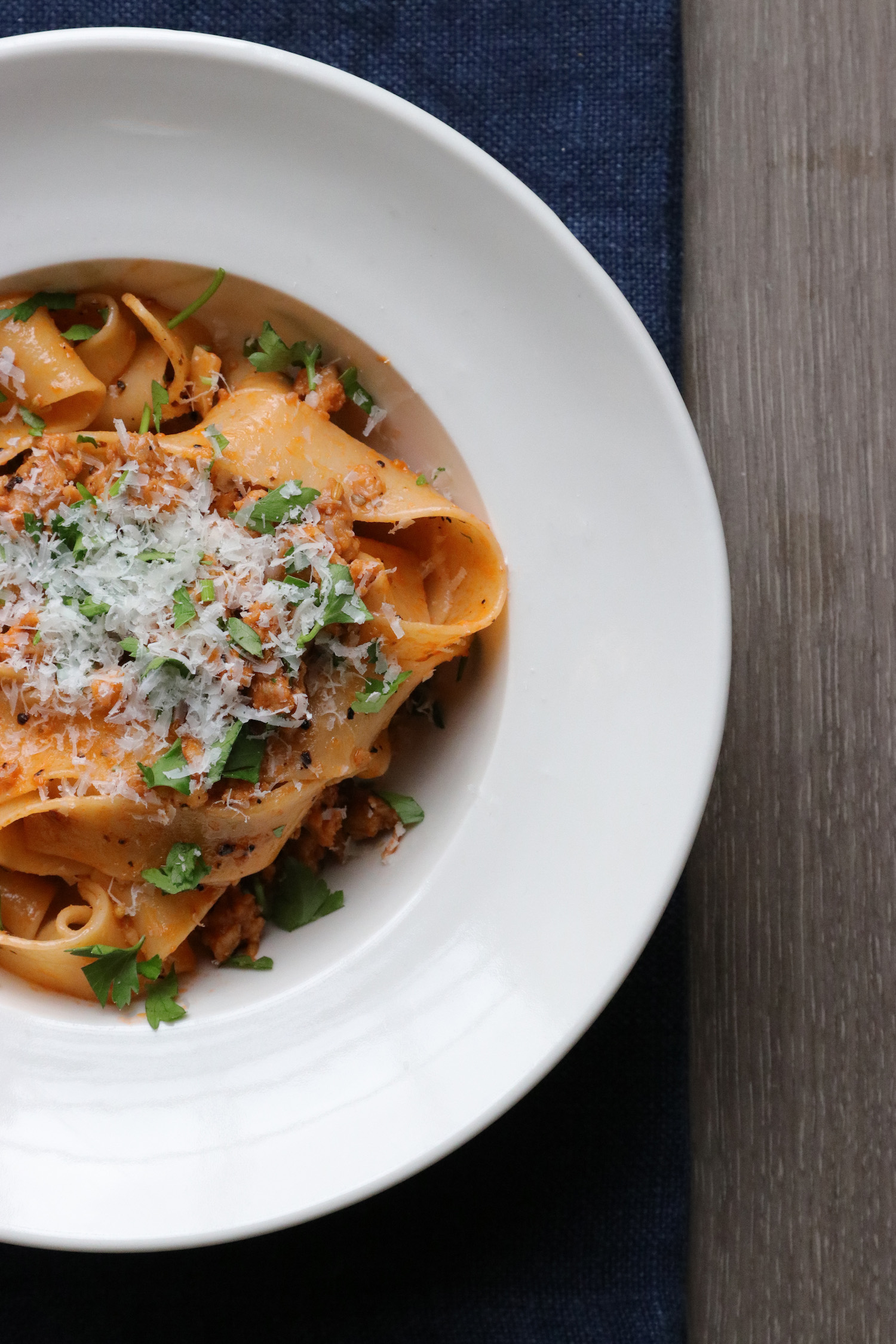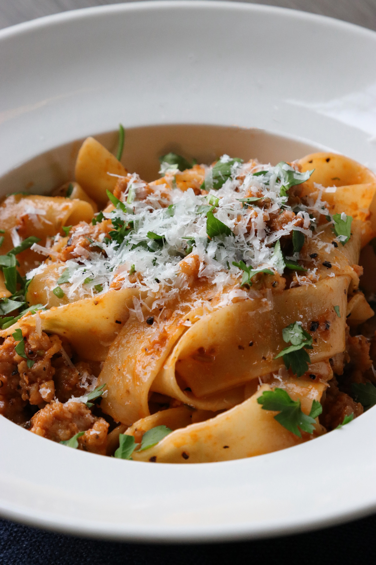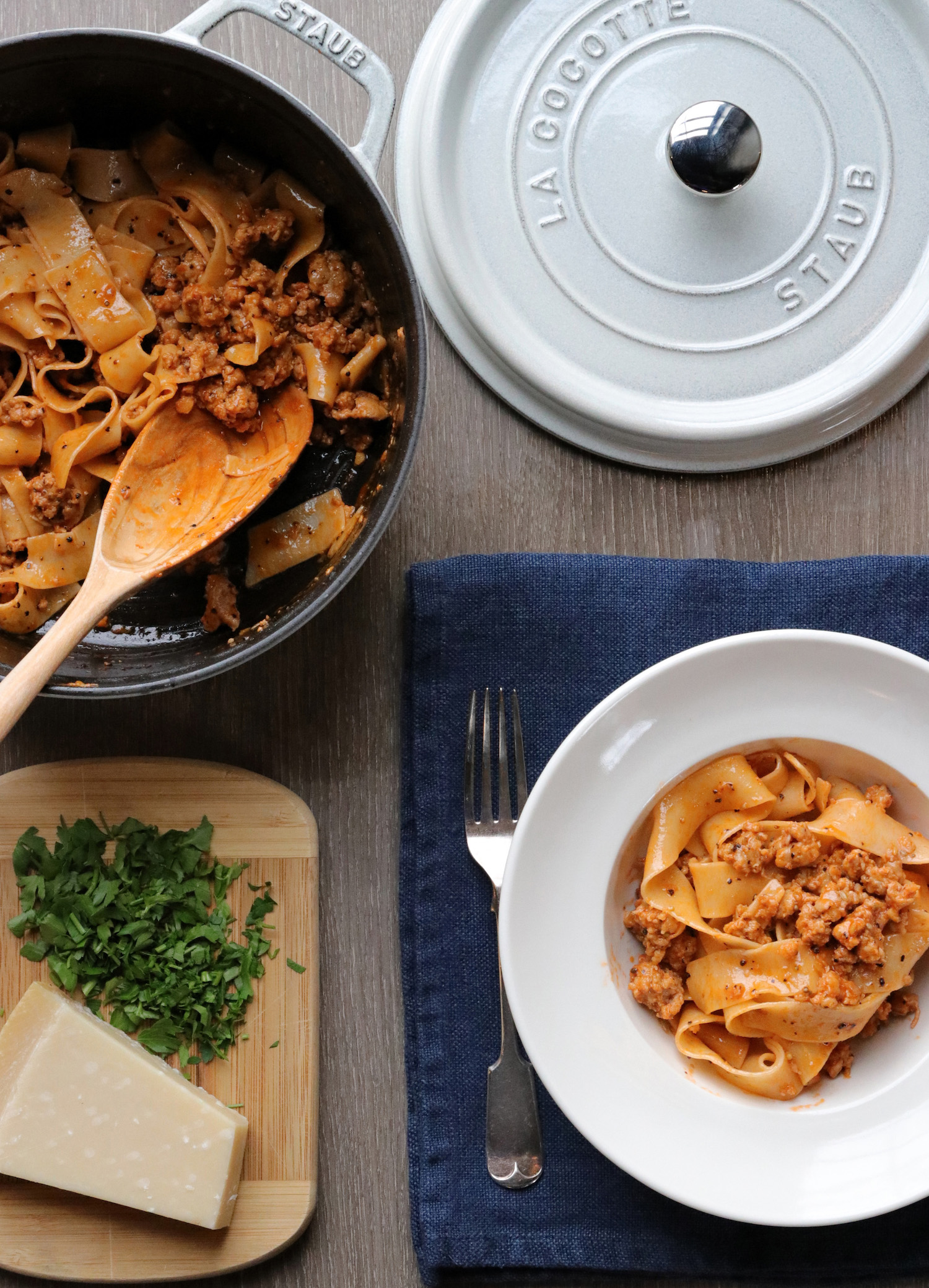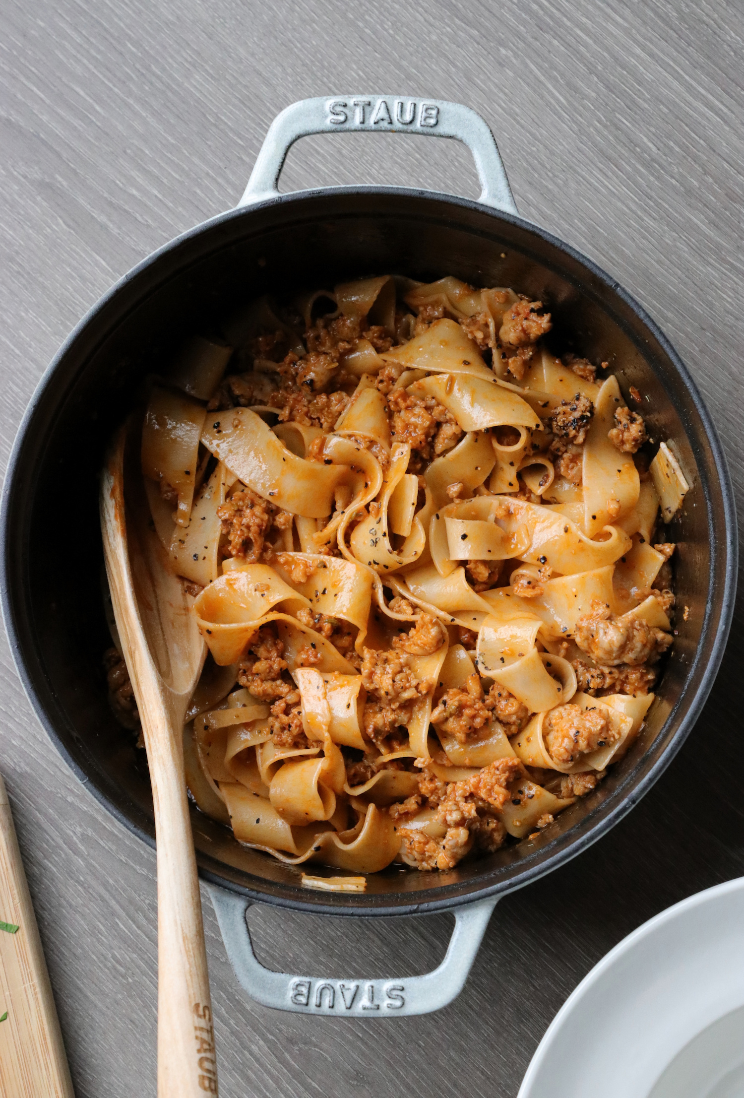 Recipe Notes | Sausage and Fennel Pappardelle Published: 24-07-2019 Another super fast and delicious dish that we recently made during the unseasonably cool weather is this sausage and fennel pappardelle pasta. Using only a handful of ingredients and with just two pans, we were thrilled with how great this tasted considering the lack of time and effort required! Ingredients 500g pappardelle pasta 1 x pack of 6 good quality sausages, skins removed 2 heaped tsp fennel seeds, crushed in a pestle and mortar 1 tbsp tomato purée 1 clove of garlic, peeled and finely chopped/crushed A glug of white wine Freshly grated parmesan Parsley (optional) Sea salt and black pepper to taste. Method 1. Boil a pan of water and add a pinch of salt. Add the pappardelle pasta and cook according to packet instructions. 2. Using a heavy bottom pan (we use the Staub cast iron cookware), heat a little olive oil over a medium heat. Add the sausage meat and fry off until lightly browned. Add the crushed fennel seeds and garlic and stir for 1 – 2 minutes to combine. At this stage the sausage meat may be sticking to the pan slightly and continuing to brown so add a good glug of white wine and stir in – you may want to increase the heat to reduce the added liquid. Once the wine has reduced, add the tomato purée and stir in. Turn the heat down to a low heat and pop the lid on. 3. Drain the pasta using a slotted spoon and add to the sausage meat mixture – if it looks a little dry, add a little pasta liquid to loosen it up. Stir to combine and season well with salt and lots of cracked black pepper. 4. Once plated, we added parmesan and fresh parsley but you could omit these completely or use other herbs if desired. Images: HM Share this article Copy this link https://www.humphreymunson.co.uk/recipe-notes-sausage-and-fennel-pappardelle/ Share Copy link Previous Article Sophie Paterson Interiors x Coze Linen Next Article Recipe Notes | Super Fast & Easy Crab Linguine