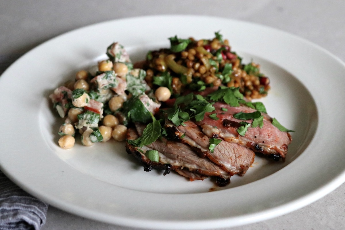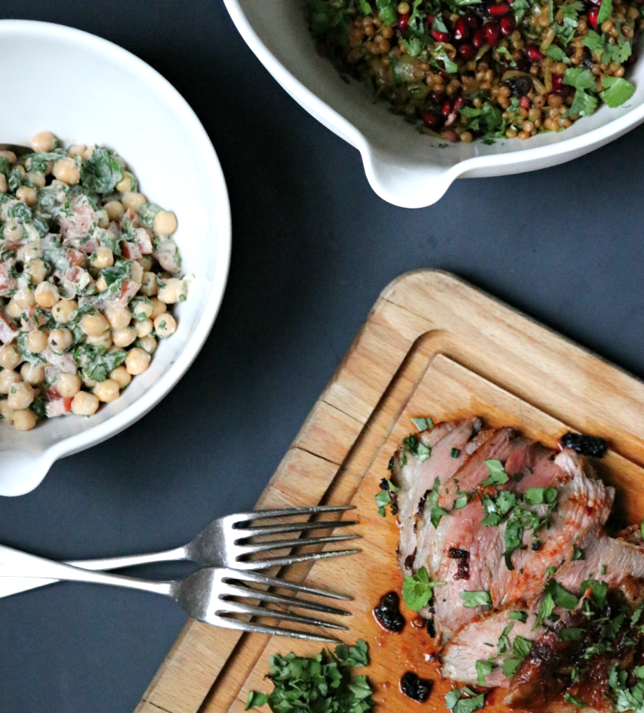 Recipe Notes | Roasted Harissa Lamb, Spiced Cous Cous and Chickpea Salad Published: 31-03-2018 An epicurean delight, lamb has been a religious symbol of Easter for centuries that continues today. Given the terrible weather in England of late, we wanted to create some recipes for Easter Sunday that brought some warmth and colour to the table so below are the recipes we created for Harissa Lamb, Spiced Cous Cous and Chickpea Salad… Ingredients harissa Lamb 3 heaped teaspoons of Harissa paste (we used Al’Fez) Half a leg of lamb 3 large cloves of garlic, minced 1 tbsp olive oil Salt and pepper Spiced couscous 100g Giant wholewheat couscous (we used this one) 500ml hot water (or use vegetable stock) A good glug of Olive oil 1 x onion, cut in half and sliced 2 tsp cinnamon 1 tsp Cardamon pods, deseeded 1 tsp Ground turmeric 2 tsp Cumin seeds 2 tsp Coriander seeds 1 tsp Ground ginger Large handful of sultanas Large handful of Pomegranate Large handful of fresh coriander Large handful of fresh mint Salt and Pepper chickpea salad 1 x 400g can chickpeas, rinsed and drained 1 x large bunch of chives, finely chopped 1 x large tomato, core removed and finely chopped 2 x tbsp tahini 1 x clove of garlic Juice of two lemons Large handful fresh coriander, chopped Large handful fresh mint, chopped Salt and pepper method 1. Mix the harissa paste, garlic, olive oil and salt & pepper in a small bowl and rub onto the lamb. If you have time, cover and refrigerate for a few hours or if you are short on time 30 mins will be fine. 2. Heat the oven to 200°c fan and insert a meat probe (if using) into the thickest part of the meat – making sure you don’t touch the bone – and set the core temperature at 50-55°c for medium- rare. If you aren’t using a meat probe, cook for 45-50 minutes. 3 Next prepare the chickpea salad. Take a mixing bowl and with the cut side of the garlic clove rub the bowl around with both halves. This gives the salad a hint of garlic without overpowering it (also a good trick for guacamole!) Anyway, drain the chickpeas and place them in the mixing bowl. Add the chopped tomato and give the mix a good stir. Next add the lemon juice, tahini, salt and pepper and combine. You could add chopped red pepper and/or cucumber to this too and if you wanted a more oniony flavour, some diced red onion would work well. Cover and leave to one side (if making ahead this chills really well but allow it to come to room temperature before serving). 4. For the cous cous, add all the spices to a pestle and mortar and crush. Add a splash of olive oil to a large deep pan and fry off the onions on a low to medium heat, stirring occasionally so they caramelise slightly. Should take around 10 minutes. Once browned and softened, add the spices to the pan over a medium heat and stir well for 1 minute. Add the cous cous and give it a good stir for 1 minute. Allowing the cous cous to be coated in the oil and spice mix will help them keep their shape because the outer edge gets sealed (same principle as risotto). Pour in the water or stock if you’re using this, then mix and cover with a lid for 10 minutes or whatever the directions say on the packet. After 5 minutes add the sultanas to the mix as these will become all plump and juicy in the mix. 5. Once the cous cous has softened, let it cool ever so slightly for 2-3 minutes and add the chopped mint, coriander and pomegranate seeds to serve. 6. Rest the lamb for a good 20 minutes before serving. We used a half shoulder which is enough for 4 with the quantities above. Another idea would be to add a cucumber yoghurt side dish – there is a great recipe in Ottolenghi’s book Jerusalem. Images: HM Share this article Copy this link https://www.humphreymunson.co.uk/roasted-harissa-lamb-spiced-cous-cous-chickpea-salad/ Share Copy link Previous Article Kitchen Confidential | Tudor Manor House Next Article Q&A with Debra Kacher | dk INTERIORS