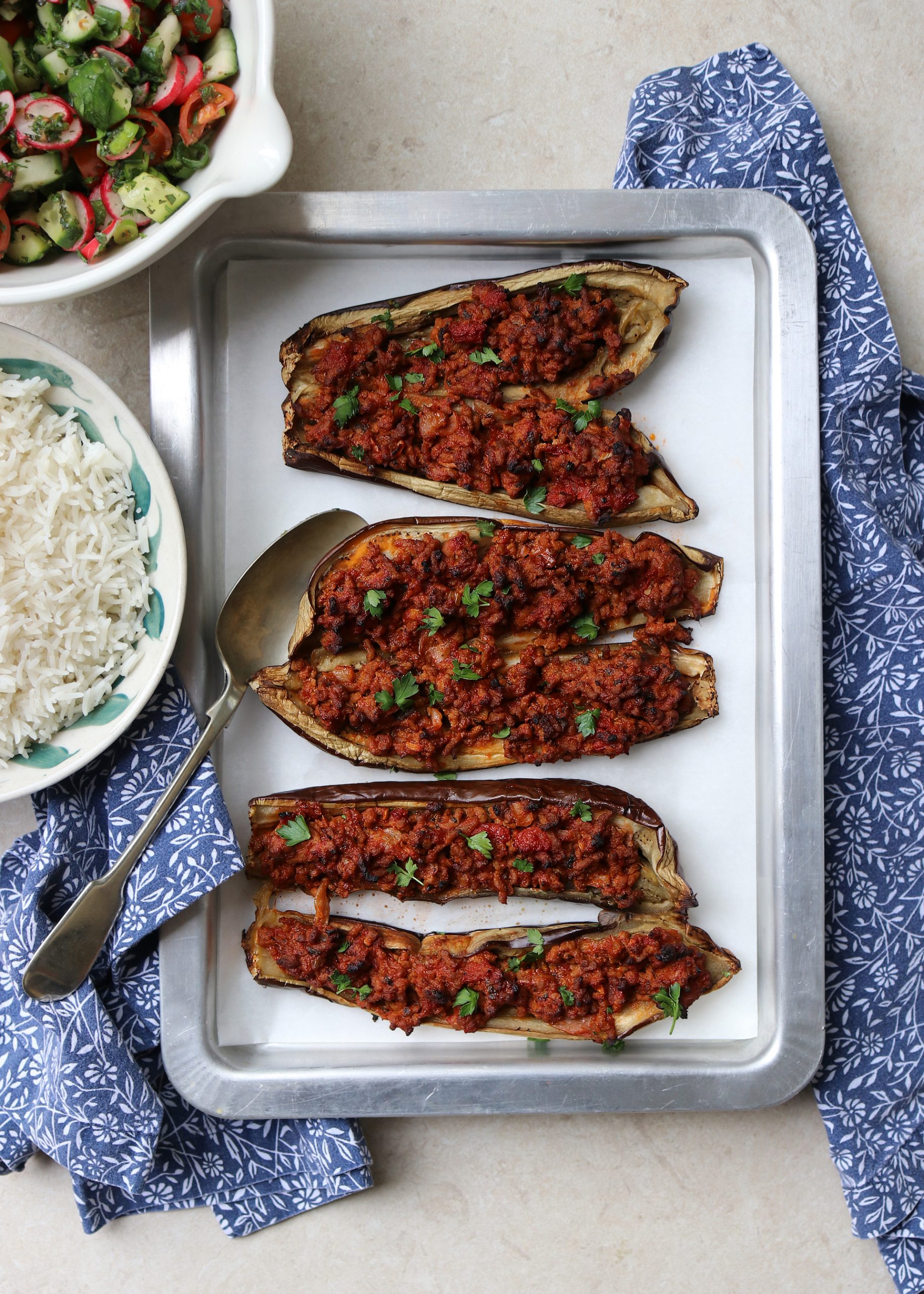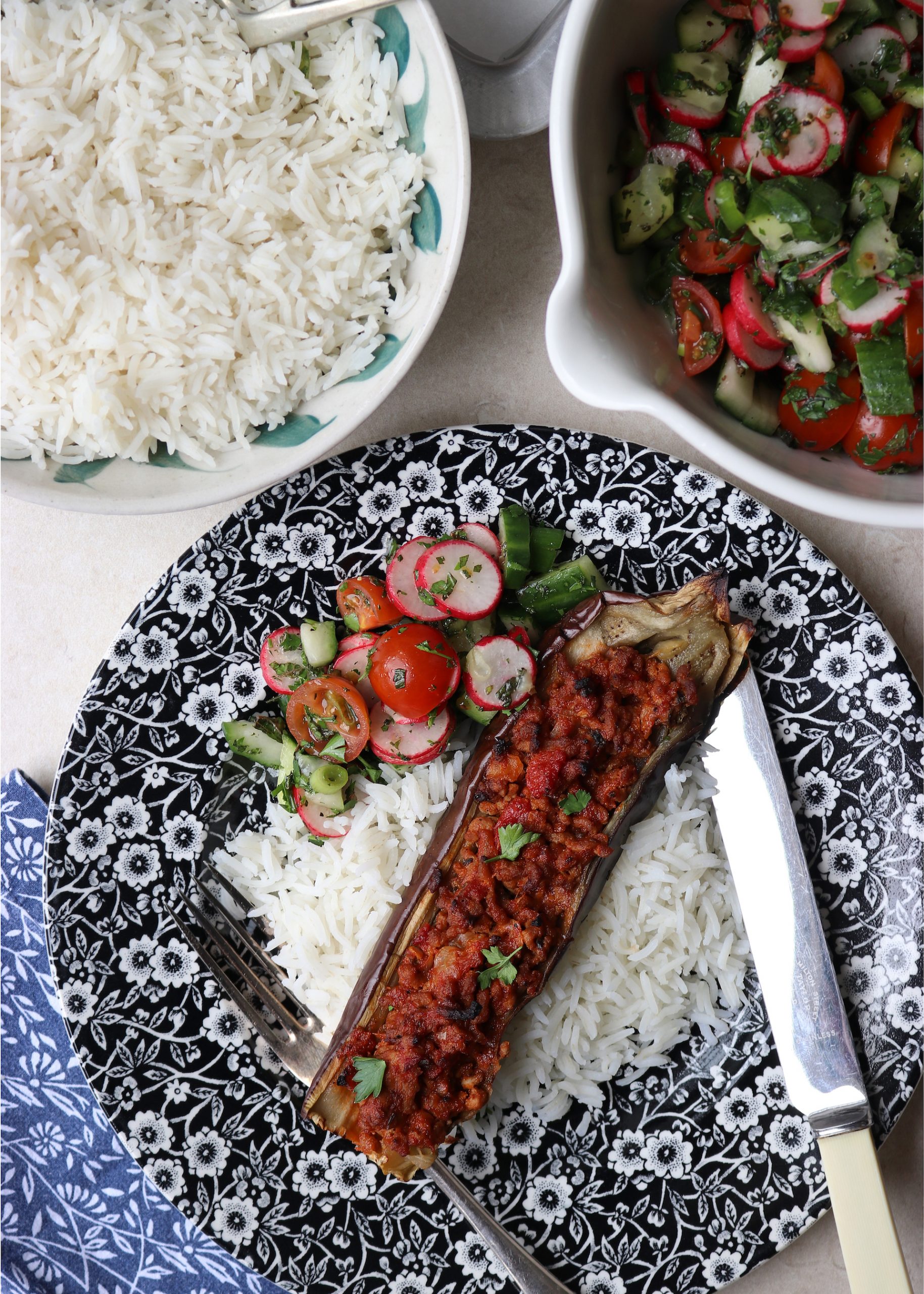 Spiced Lamb Aubergine Published: 29-08-2022 This is the perfect recipe for lunch at home if you’re entertaining – it’s light, bright and delicious! INGREDIENTS Good few glugs of olive oil 1 red onion, peeled and finely chopped 4 garlic cloves, peeled, squashed and grated / chopped 4 aubergines 2 tsp freshly ground cumin seeds (use ground if you don’t have fresh) 1 tsp ground cinnamon 1 tsp freshly grated nutmeg 2 tsp paprika large pinch of red chilli flakes (or use fresh red chilli for extra heat) 500g/1lb 2oz lamb mince 3 or 4 tbsp tomato purée plus a little water salt and freshly ground black pepper METHOD 1. Pre-heat the oven to 200C/400F. 2. Cut each aubergine lengthways through the stalk (don’t remove the stalk). Then with a sharp knife score the aubergine in a criss cross pattern but be careful not to cut all the way through. Next place the aubergines on a baking tray (we use bake-o-glide to stop them sticking). Season with salt and pepper and then bake in the oven for around 30 minutes or until the flesh of the aubergine is nice and soft. 3. While the aubergines are baking, add a few glugs of olive oil to a large sauté pan and fry off the onion for about 5 minutes over a gentle heat – you don’t want it too brown, just nicely softened. Then add the garlic and spices and stir well – let this combine for around 3-4 minutes – again over a gentle heat – and then add the lamb mince. Stir well and let the meat brown slightly. Once cooked through add the tomato purée and a little water to loosen it up – if you want to add more tomato you can – we found it cooks a bit better if it’s not too wet a sauce. 4. Once the aubergines have cooked through and you’ve removed them from the oven, scoop out the flesh – this will be easy (hopefully) and then add this to the lamb mixture. Season well with salt and pepper and taste to check before adding to the aubergine skins. At this point you’re going to put them back in the oven for 15 minutes (same temp as before) but you can add cheese, herbs, more chilli – anything goes! We didn’t, we just baked them with the meat inside and then served them with steamed white rice and a simple fattoush salad and it was really good. Images: HM Share this article Copy this link https://www.humphreymunson.co.uk/roasted-stuffed-aubergine/ Share Copy link Previous Article Tigermoth Lighting | Compass Wall Lights Next Article Behind the scenes in our Felsted showroom