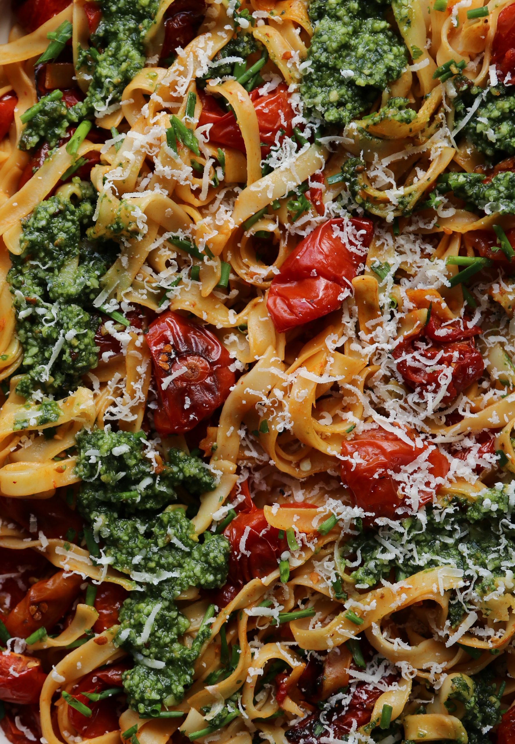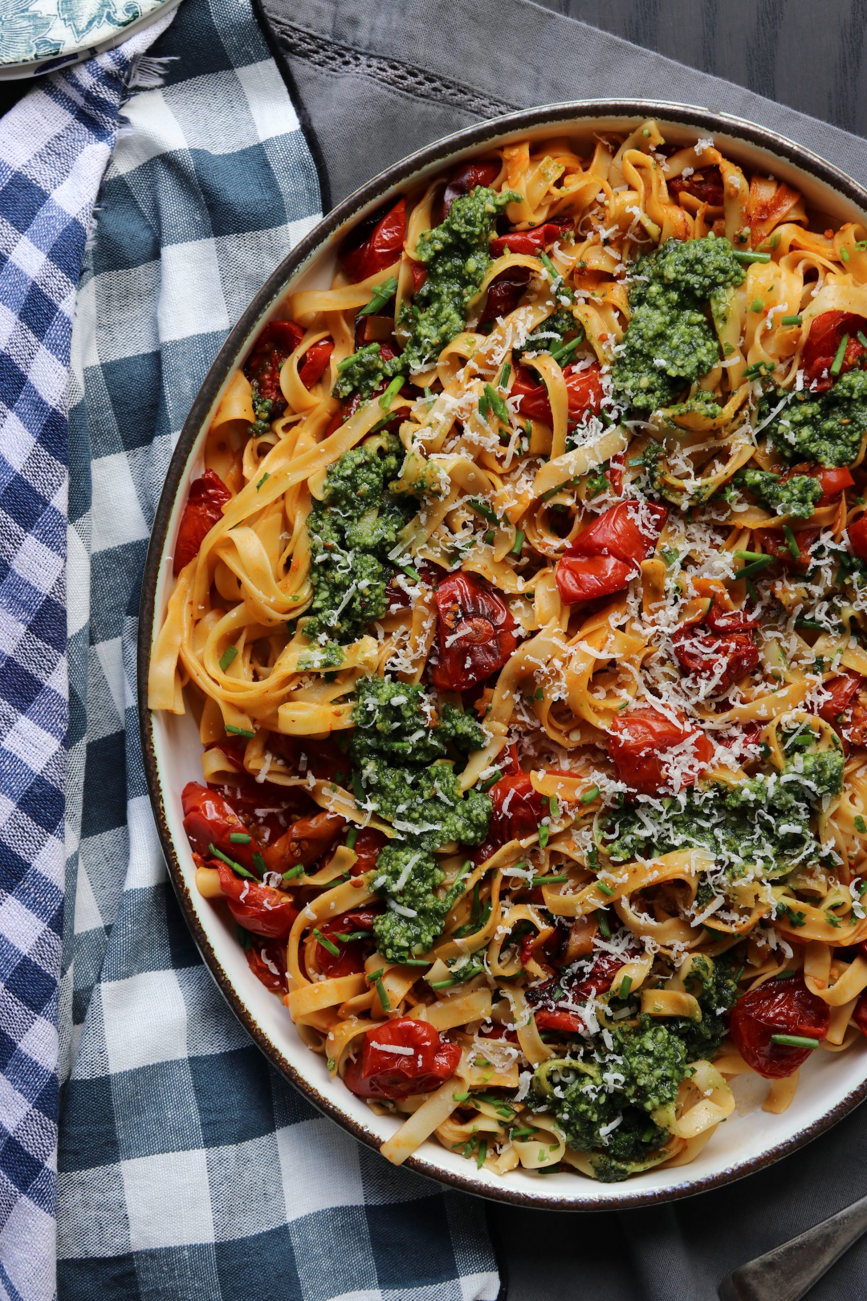 Roasted Tomato & Pesto Tagliatelle Published: 29-08-2021 We had a huge glut of tomatoes to use up so we chopped them up, mixed with olive oil and some bashed up garlic cloves and left them in the oven at 150C for around 3 hours. The longer you leave them, the more concentrated the flavour. Method We took a large pan of boiling water and cooked the pasta for around 5 minutes until al dente. Meanwhile in a large shallow sauce pan, we added some olive oil and diced shallots to soften for a few minutes. Then we added the tomatoes and a ladle of the pasta water and seasoned with salt and pepper. We turned the heat up and the tomatoes which had sort of dried out in the warming drawer plumped up again. Next we added a tbsp of tomato paste and some parmesan. The next step was to ladle the pasta in to the tomatoes a spoon at the time, always stirring to combine thoroughly. We made the pesto quickly in the mini mixer and dolloped over the plate with the pasta. A super simple dish using hardly any ingredients but absolutely packed with flavour! Images: HM Share this article Copy this link https://www.humphreymunson.co.uk/roasted-tomato-pesto-tagliatelle/ Share Copy link Previous Article Apple & Cavolo Nero Salad Next Article Recipe Notes | Gooey Dark Chocolate Cake