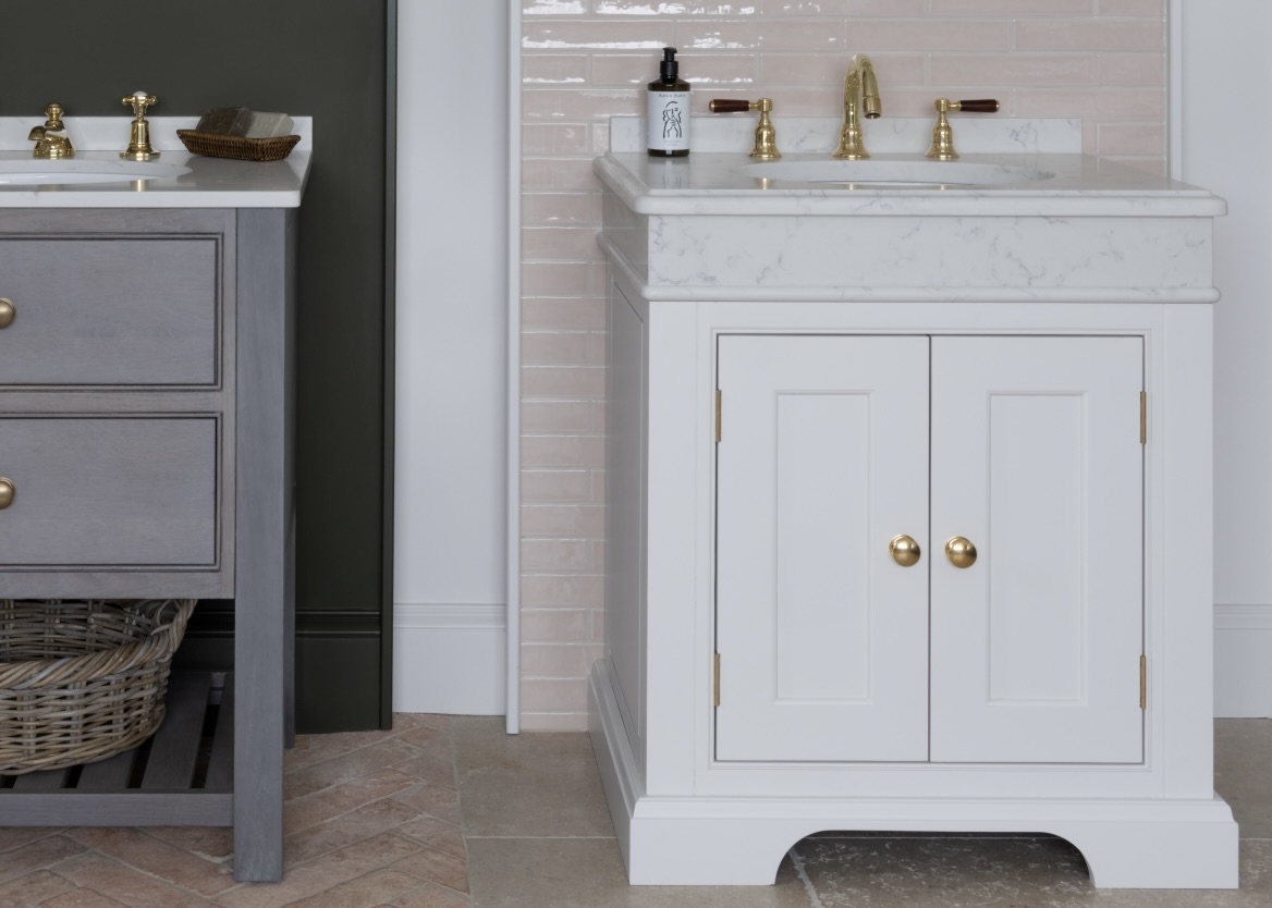 The Harlyn II is a refined and elegant custom vanity unit featuring a wraparound quartz downstand and cupboard below. Handmade using traditional joinery techniques at Humphrey Munson’s workshop in Felsted, Essex. The Harlyn II vanity unit is supplied in either a painted or timber finish with a choice of quartz worktop. The handles are available