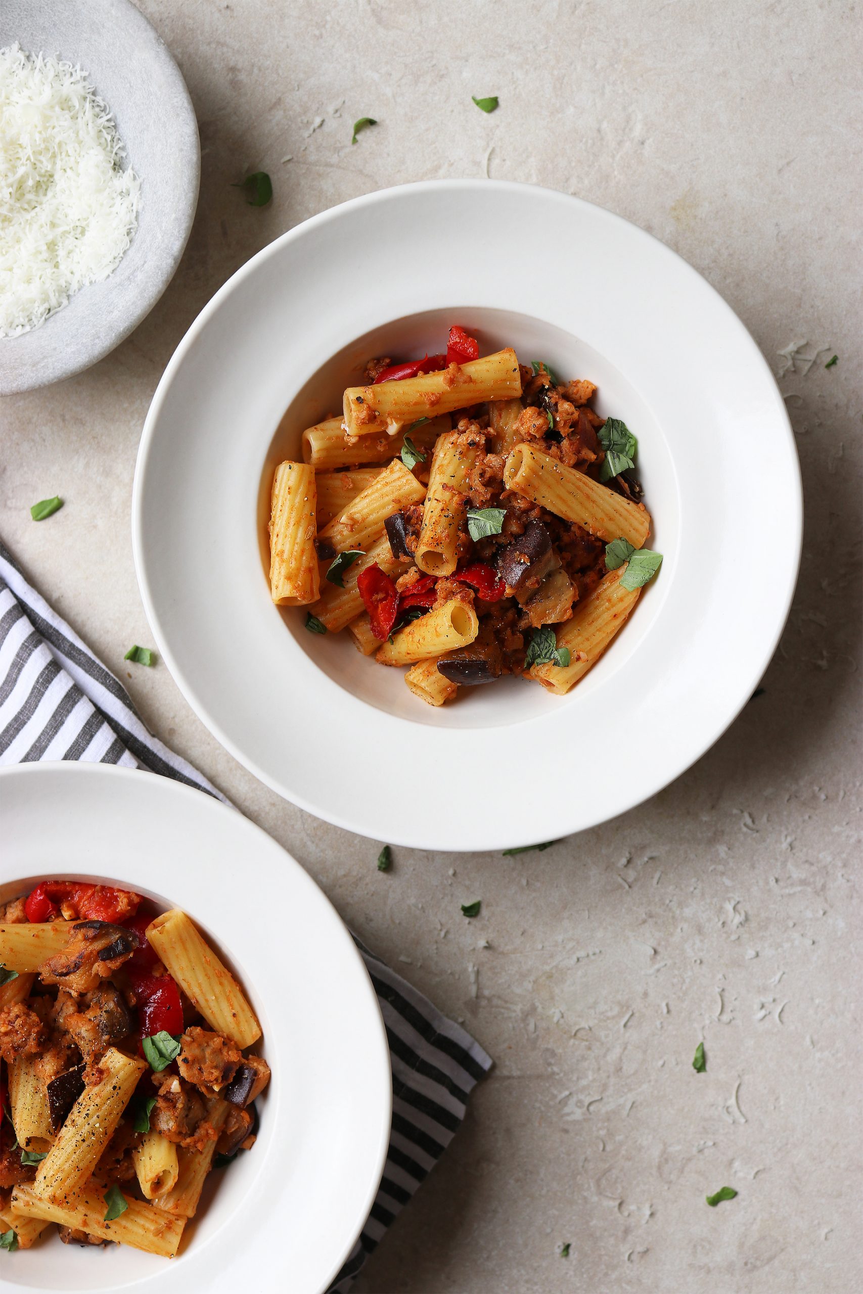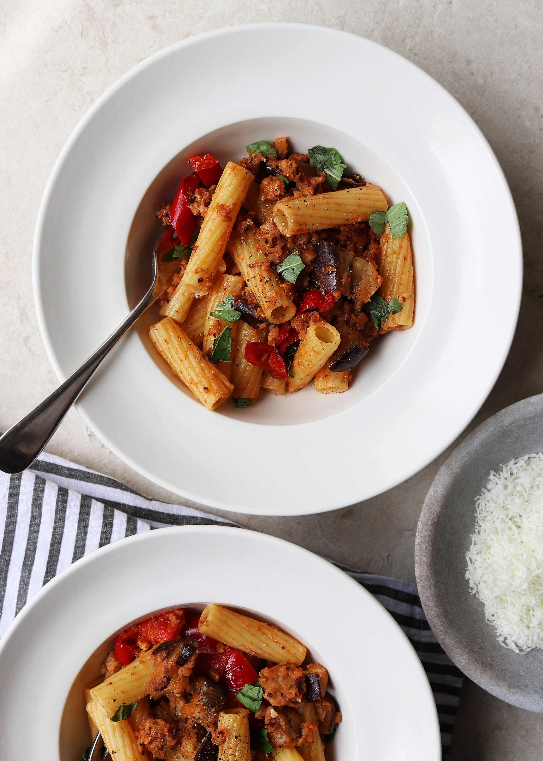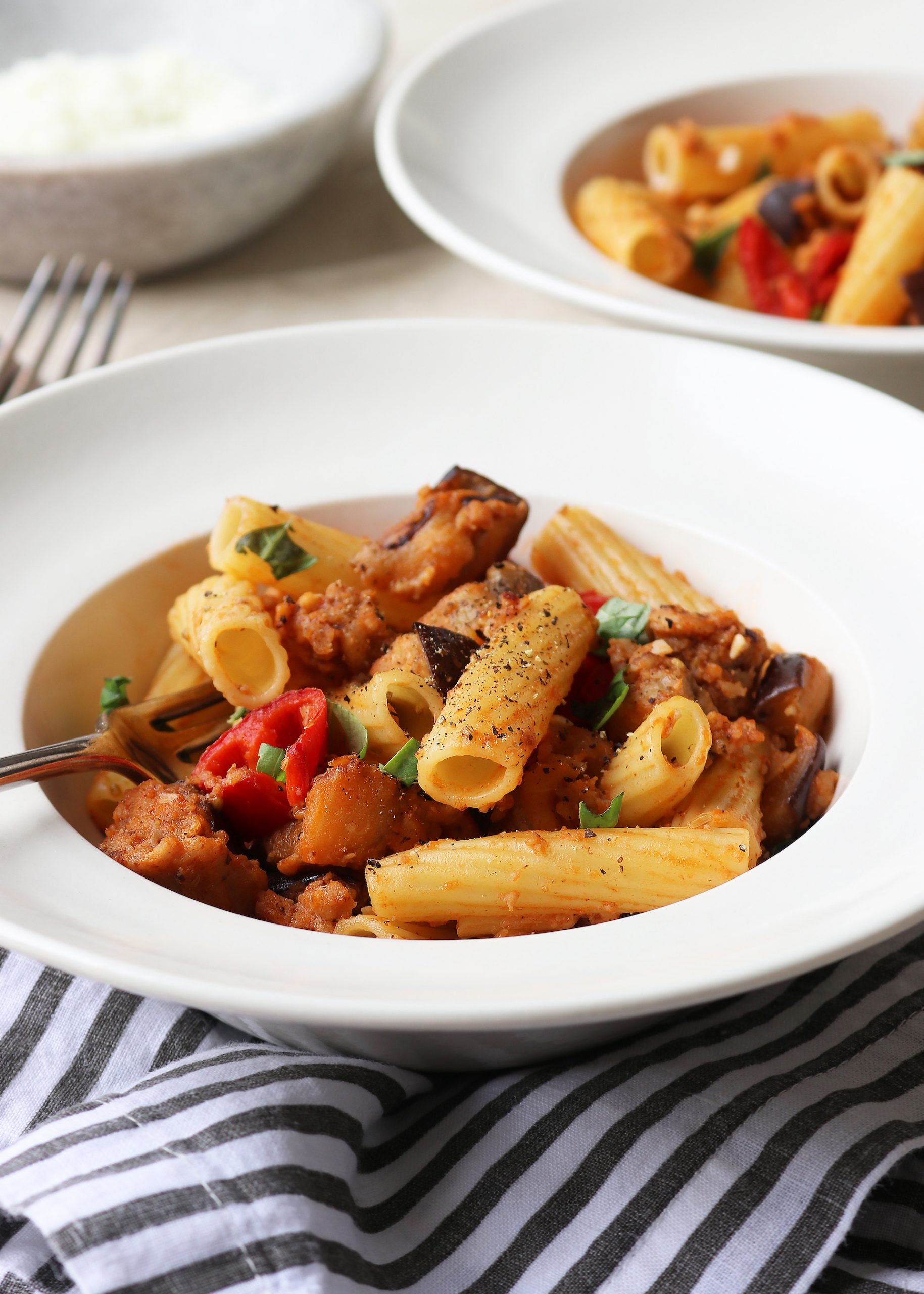 Spicy Sausage and Aubergine Rigatoni Published: 24-04-2022 Fresh, delicious and filling, we love this recipe for spicy sausage and aubergine rigatoni. If you’ve followed the HM blog for any time you’ll know we favour quick and easy recipes that are packed full of flavour and great for mid-week or weekend meals, wether you need to feed two or a family of five. Ingredients 500g rigatoni pasta (or any other pasta in the cupboard will do) 1 x pack of 6 good quality sausages, skins removed 2 heaped teaspoons of fennel seeds, crushed in a pestle and mortar 1 tablespoon tomato purée (we like this one – amazing taste!) 1 clove of garlic, peeled and finely chopped/crushed A glug of white wine 2 aubergine, large dice 1 red pepper, large dice Freshly grated parmesan and basil (optional) Sea salt and black pepper to taste Method 1. Place the aubergine and red pepper on a baking tray and roast in the oven until crispy. Around 180°C fan, for about 20 minutes should do the trick. 2. Using a heavy bottom pan (we use the Staub cast iron cookware), heat a little olive oil over a medium heat. Add the sausage meat and fry off until lightly browned. To start with it all sticks together and is quite difficult to separate, but once it starts to catch, it will separate into bits. It’s good to let it catch to get a bit of colour – the crispy bits are always the best bits! Add the crushed fennel seeds and garlic and stir for 1 – 2 minutes to combine. At this stage, the sausage meat will be continuing to brown so add a good glug of white wine and stir in – you may need to increase the heat to reduce the added liquid. Once the wine has reduced, add the tomato purée and stir in. Turn the heat down to a low heat and pop the lid on to let it simmer. 3. Boil a pan of water and add a pinch of salt. Add the rigatoni pasta and cook according to packet instructions. 4. Remove the vegetables from the oven, and add to the sausage mixture. Stir in well. 5. Next, drain the pasta using a slotted spoon and add it to the sausage meat mixture – we recommend adding a little pasta liquid to loosen it up and make it more sauce-like. Stir to combine and season well with salt and lots of cracked black pepper. 6. Once plated, we added freshly chopped basil but you could omit this completely, or use this and parmesan. This is such a versatile dish that it has become the perfect staple. You could use other veggies of course, it does work really well to use sausage meat with the fennel, garlic and white wine but large king prawns could also be delicious – we might try that next time! Images: HM Share this article Copy this link https://www.humphreymunson.co.uk/spicy-sausage-and-aubergine-rigatoni/ Share Copy link Previous Article The best coffee machines for the perfect at home cup of coffee Next Article Smokey Grilled Chicken