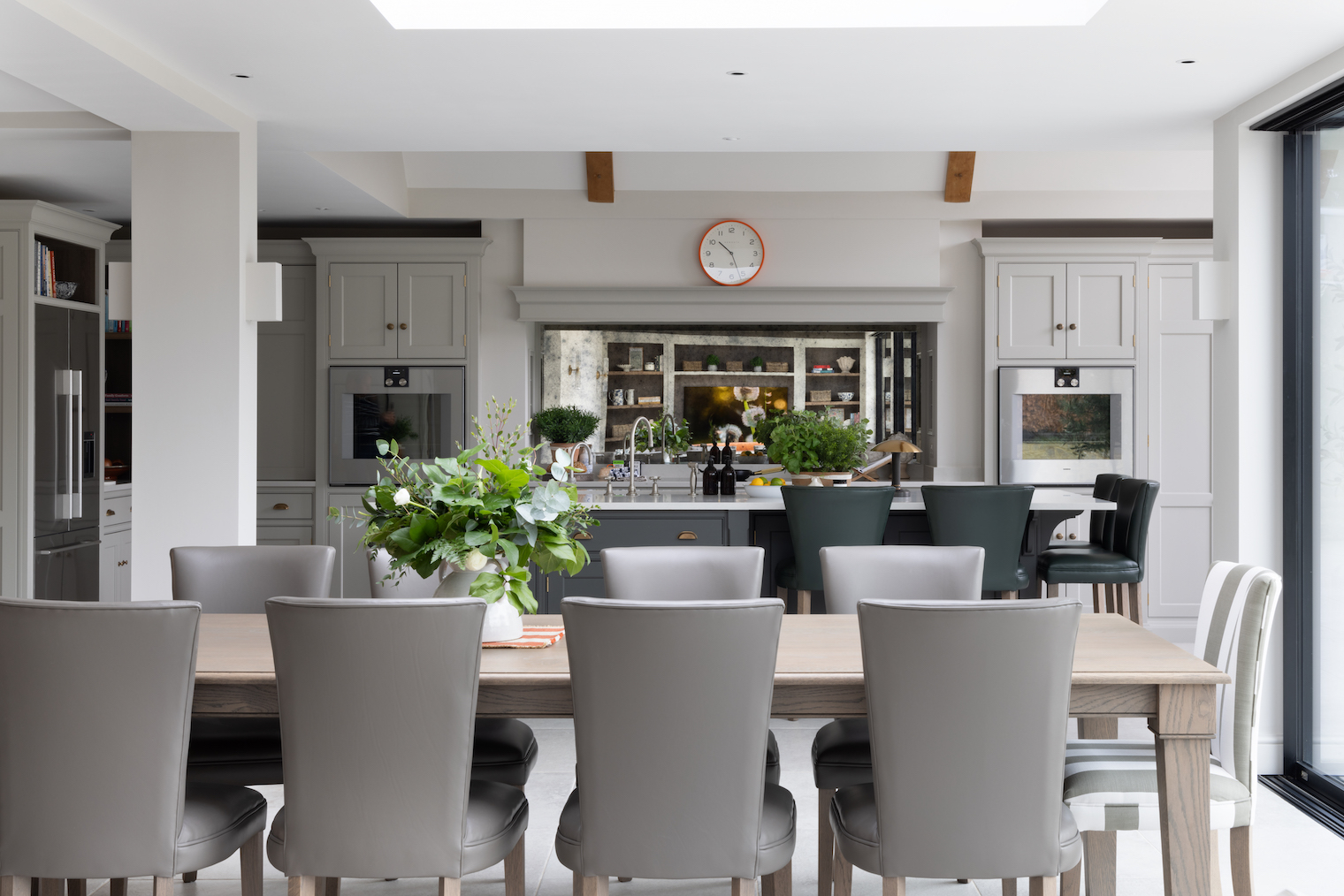 Tandridge project – iii. dining area Published: 23-02-2025 If you’re going to have an open plan kitchen and dining space there are a few ways you can arrange it to suit scaling up and down but we’ve always been a fan of picking a table size and sticking with it as opposed to an extending table. There are some scenarios where an extending table makes sense (e.g. Crouch End Project) but most of the time, the scale of the room will largely tell you what size table you can fit it and it’s important to think about the balance of everyday life and the occasions when you might want to scale up. For our clients here, an 8-10 seater dining table really made sense on a weekly basis with family and friends visiting so we designed this in from the get-go. The dining table at this size really suits the space, provides plenty of flow in and around it and works beautifully with the overall design. The Byron dining table is finished in Berkeley oak and is made from solid oak – its weight is a testament to this fact! The table was handmade, along with the rest of the cabinetry and furniture, at our workshop in Felsted, Essex and measures 3m in length. All our tables are made to order and can be in a bespoke size, but we also sell set sizes – you can see more here. The Havisham dining chairs were chosen to tie in with the counter stools and the majority are upholstered in a taupe Italian leather with the two end chairs upholstered in a Perennials wide stripe for a bit of a change and a link back to the upholstered Harris bench in the kitchen. It’s always a hard one choosing leather or fabric for upholstery and even though Perennials fabris is as close to bomb proof as possible, with little ones you just can’t beat a quick spray of antibac and a wipe over which is the case with leather. I think the balance here works really well and avoids the board room look with too many leather chairs. The drinks bar … what can we say? It’s just perfect. Tall Gaggenau integrated wine storage to the left (inspired by the Haslemere project), red wine storage either side of the integrated CoolDrawer, tall glazed storage with a mirrored back to the right and a lovely big open bar concealed behind countertop doors that even has adjustable shelves above. It’s just so lovely when you’re entertaining to have a drinks bar of any size and one of the best bits is the illumination you get while you’re sitting down to dinner. And the colour chosen – Soot – just has the perfect balance of moodiness and richness to look absolutely spot on here. Couldn’t be more pleased with this area. Share this article Copy this link https://www.humphreymunson.co.uk/tandridge-project-iii-dining-area/ Share Copy link Previous Article Tandridge project – ii. pantry Next Article Tandridge project – iV. Sitting area