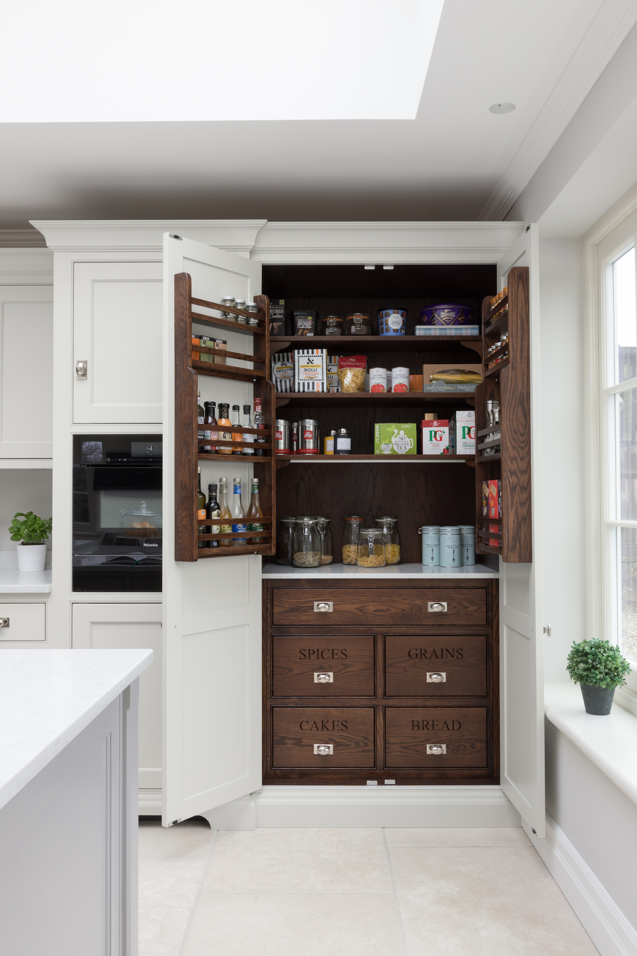 The Day Pantry Published: 31-12-2018 The day pantry is one of the most requested elements of a Humphrey Munson kitchen. With the capacity to hold roughly 4-5 cupboards worth of ingredients in a mix of open and closed storage a day pantry provides a wealth of storage for dry ingredients all in one place. For those thinking of incorporating a day pantry into their Humphrey Munson kitchen design, here are the essential components… 1 . C O L D S H E L F A countertop ‘cold shelf’ – like this one in day pantry at the Crouch End project is a great for food prep and storing large everyday appliances like this KitchenAid mixer, large chopping board or additional food storage for bowls of eggs and fruit etc behind doors for one clean line of cabinetry. 2 . A R T I S A N S H E LF S T O R A G E Artisan oak shelves, beautifully finished by hand in our workshop in Felsted, Essex are so useful for storing everything items you want to be able to see and select quickly. This day pantry in the Cobham project illustrates just how useful these shelves can be. 3 . S P I C E A N D C O N D I M E N T D O O R R A C K S These spice and condiment racks are so handy for bottles of oil, vinegars, spices and herbs and really anything you can fit into them. 4. D R A W E R S The drawers in the day pantry are perfect for hiding away packets of things or perhaps hiding away the treats like in this day pantry at the Langton House project in Theydon Bois. A day pantry with engraved drawers like the pantry above not only adds a personal touch to the pantry but ensures things like bags of pasta and rice are put back in the same place rather than being tucked away in a random drawer. For busy families who love to be as organised as possible this is always a bonus, especially when guests can help themselves to bread for breakfast…a simple but effective idea. A day pantry isn’t all about function, a contrasting wood finish like the dark Portobello oak interior the pantry at the Willow House project above really warms up the space which could otherwise feel quite cold due to the light painted cabinetry and worktops. The Portobello oak also works really well with the aged brass Perrin and Rowe taps and surrounding hardware and really ties the space together. And lastly for mor more unusual spaces that cannot be altered like the Oak Lodge, Norfolk project, the bespoke day pantry was designed around an existing immovable chimney and so part of the interior has a reduced depth due to this restriction – which you may not immediately notice due to the Portobello oak panelling. This pantry is used for the bulk of the dry food storage and condiments, providing the homeowners with plenty of storage space which is what the day pantry is all about. Share this article Copy this link https://www.humphreymunson.co.uk/the-day-pantry/ Share Copy link Previous Article 7 Smart Kitchen Storage Solutions Next Article Kitchen Scullery Run